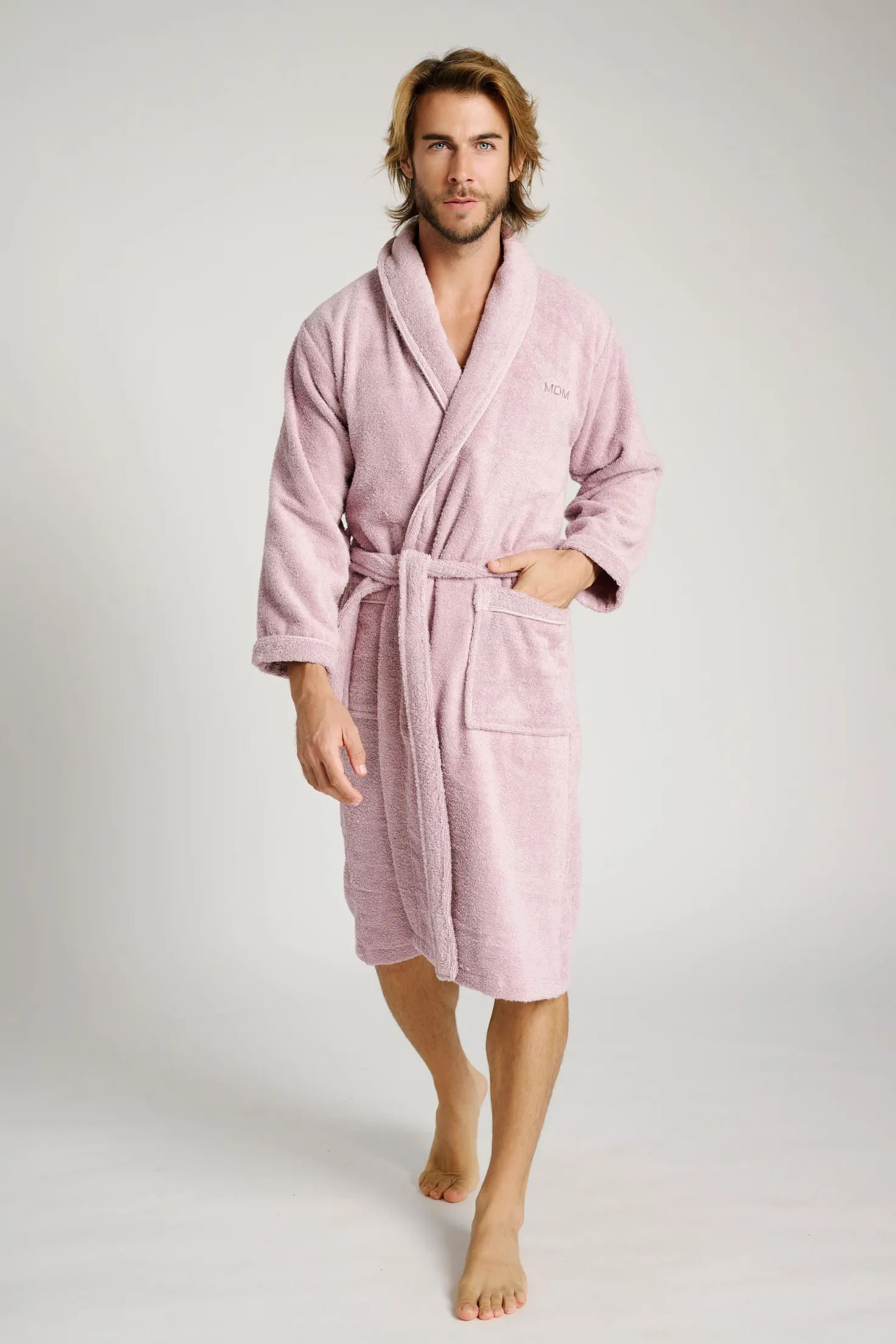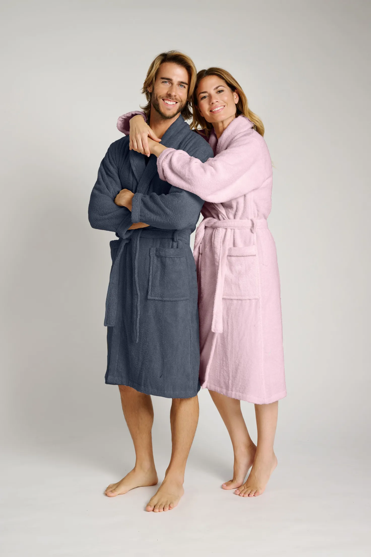 Albornoz de ducha unisex confeccionado en suave tejido de rizo, que garantiza máxima absorción y confort. Con diseño clásico de manga larga, cuello esmoquin y cinturón ajustable, incorpora prácticos bolsillos delanteros. Ideal para después de la ducha.