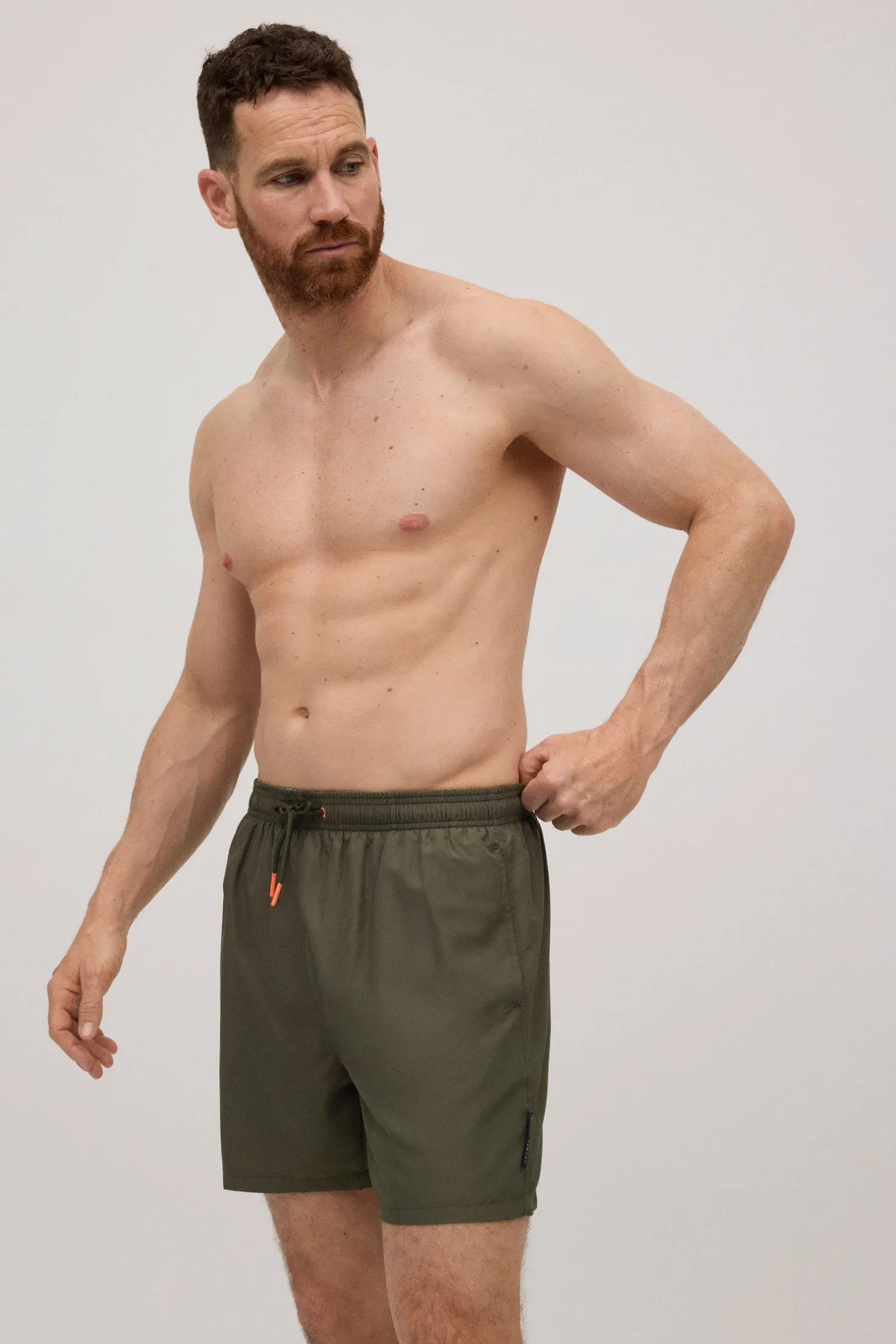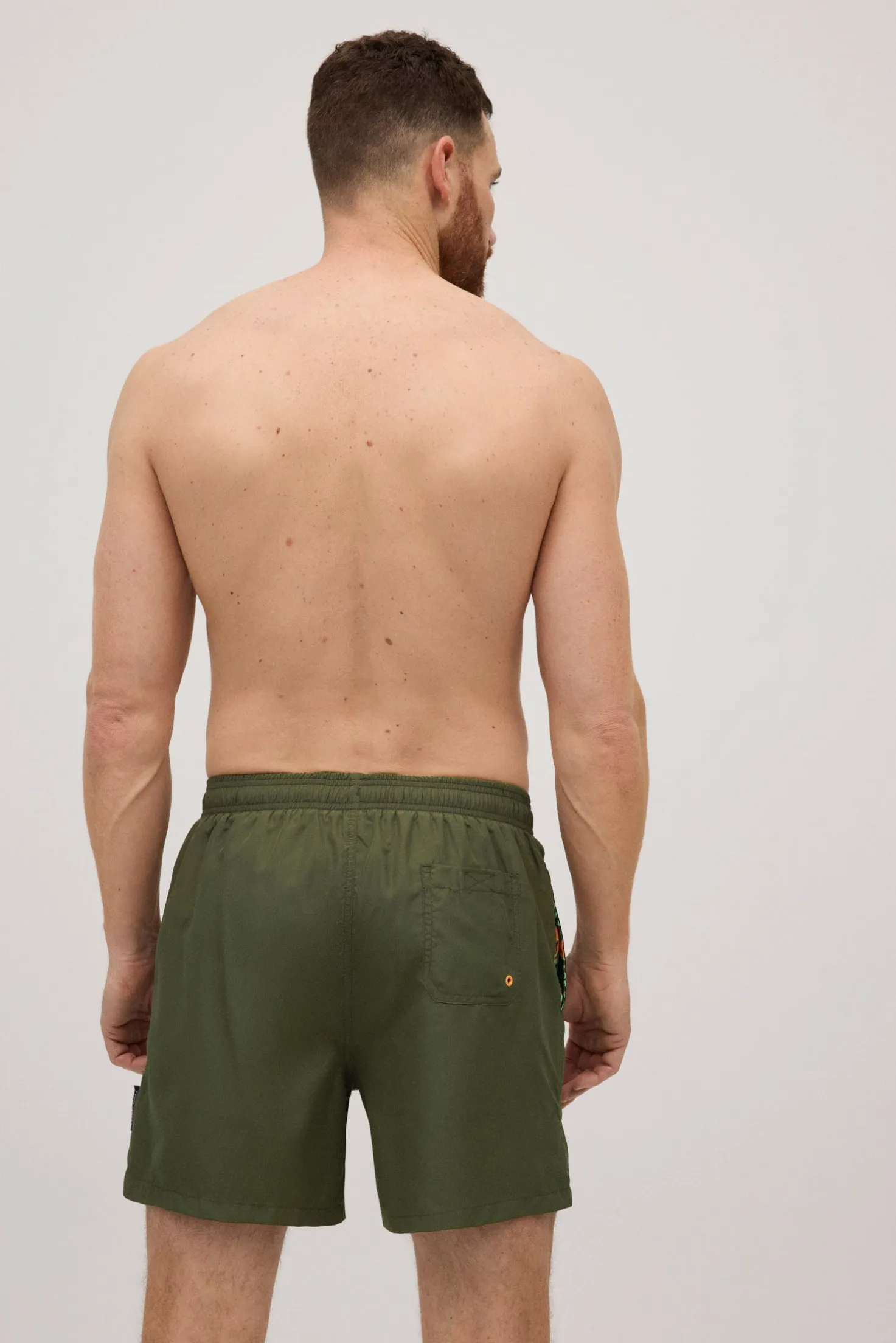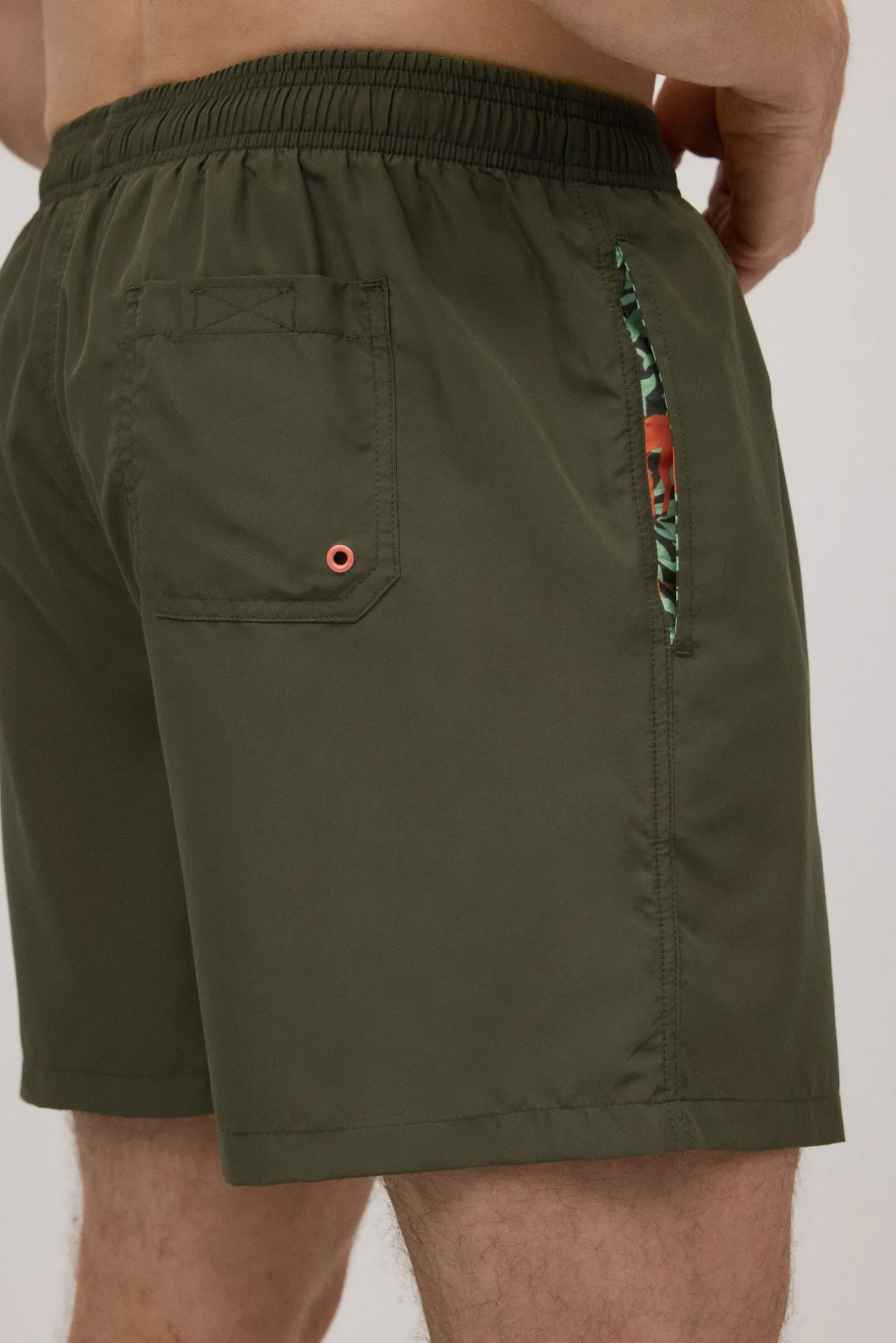 Bañador de largo medio para hombre. Tejido ligero de secado rápido. Diseño liso de color verde caqui con detalle del forro interior estampado.