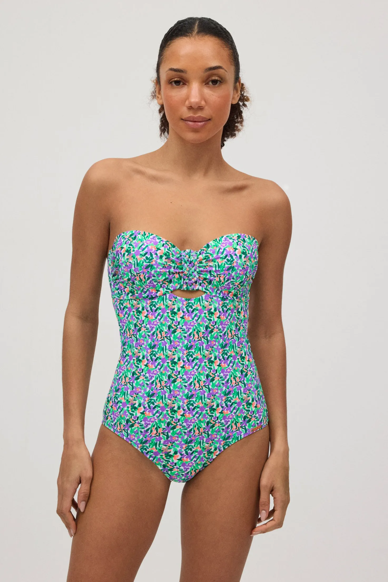 Bañador de mujer bandeau con efecto reductor. Un traje de baño que estiliza la figura gracias a su tejido de compresión en la zona abdominal. Su escote bandeau realza el busto y permite lucir los hombros, mientras que su estampado aporta un toque moderno y favorecedor.