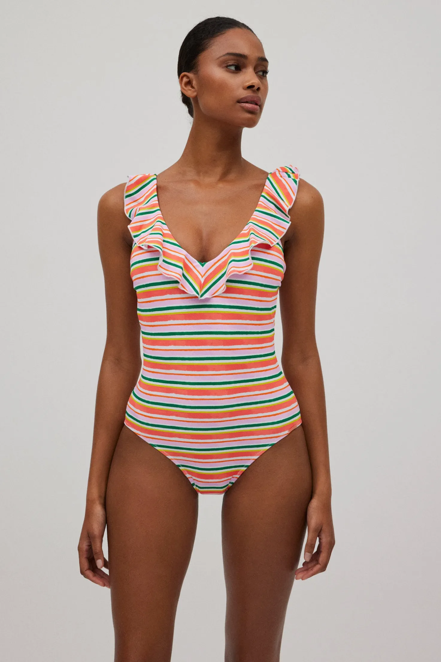 Descubre el Bañador volantes estampado de rayas micropiqué, diseñado para brindarte comodidad y estilo en cada momento.