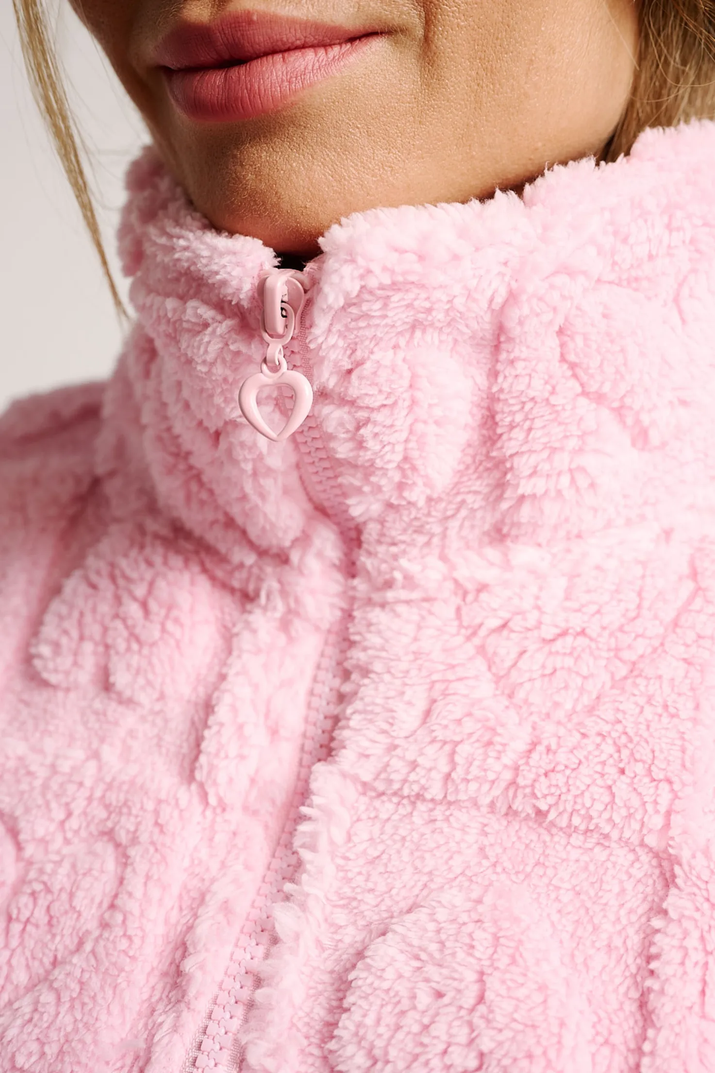 Bata corta de tejido polar ultrasuave con relieve de corazones. Incluye cierre de cremallera y cinturón ajustable para mayor comodidad. Con cuello alto para más abrigo y bolsillos laterales prácticos. Diseño cálido y femenino, ideal para estar en casa en los días fríos.