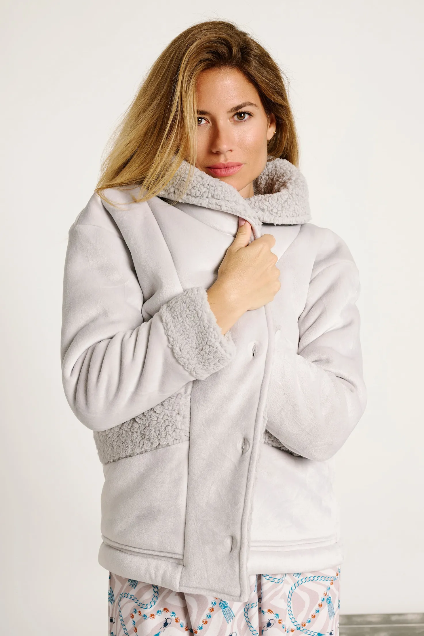 Bata estilo chaqueta en suave tejido polar gris con interior y detalles en borreguito. Cuenta con cierre de botones delanteros y cuello alto para mayor abrigo. Diseñado con puños y franja inferior en borreguito a contraste, además de bolsillos laterales prácticos. Ideal para estar en casa con estilo y confort en los días fríos.