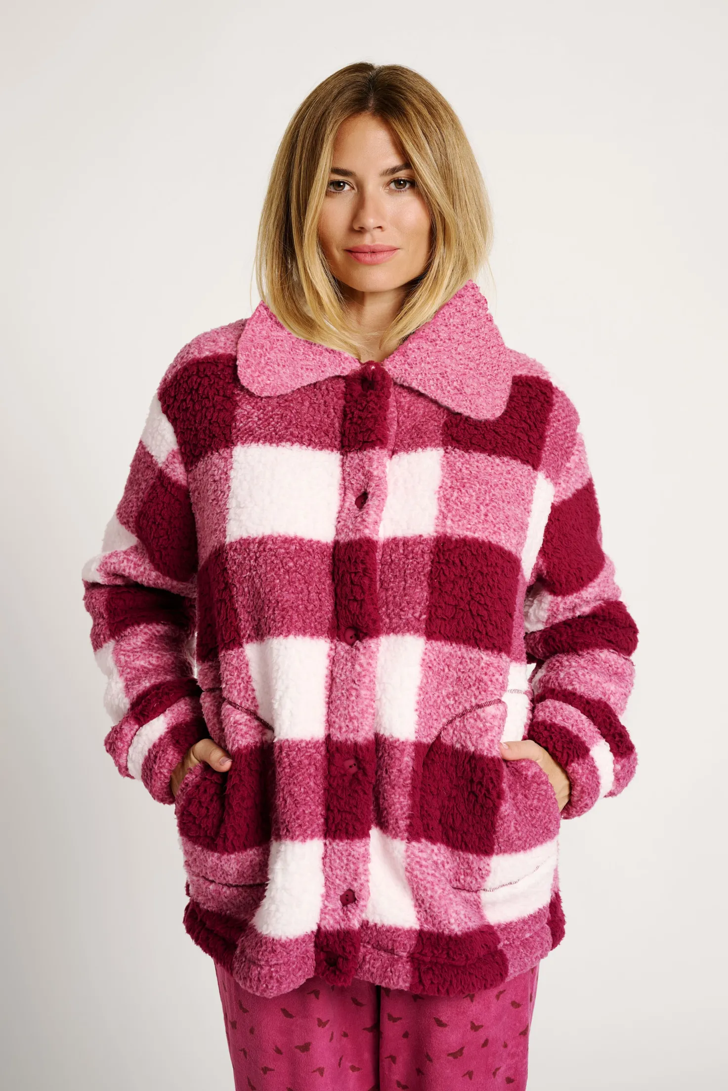 Bata con estilo de chaqueta, se caracteriza por tener un tejido polar suave con estampado de cuadros en tonos rosas y blancos. Cuenta con cierre de botones delanteros, cuello camisero y bolsillos laterales amplios. Diseño cómodo y abrigado, perfecto para estar en casa o para un look casual en los días fríos.