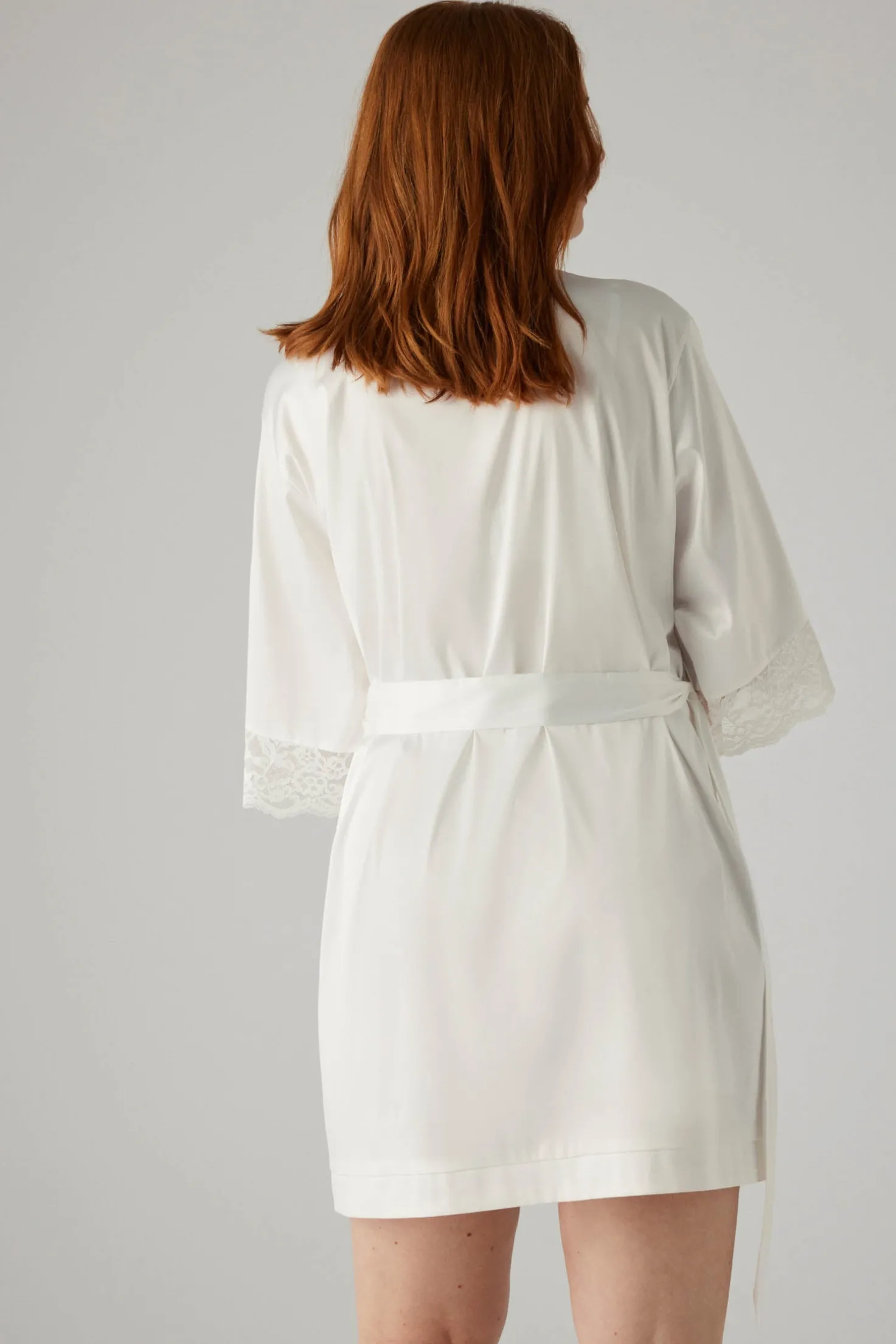 Bata en satén con detalles de encaje, perfecta para novia. Con cinturón y mangas 3/4, es ideal para bodas, ofreciendo elegancia y confort en ese día tan especial.