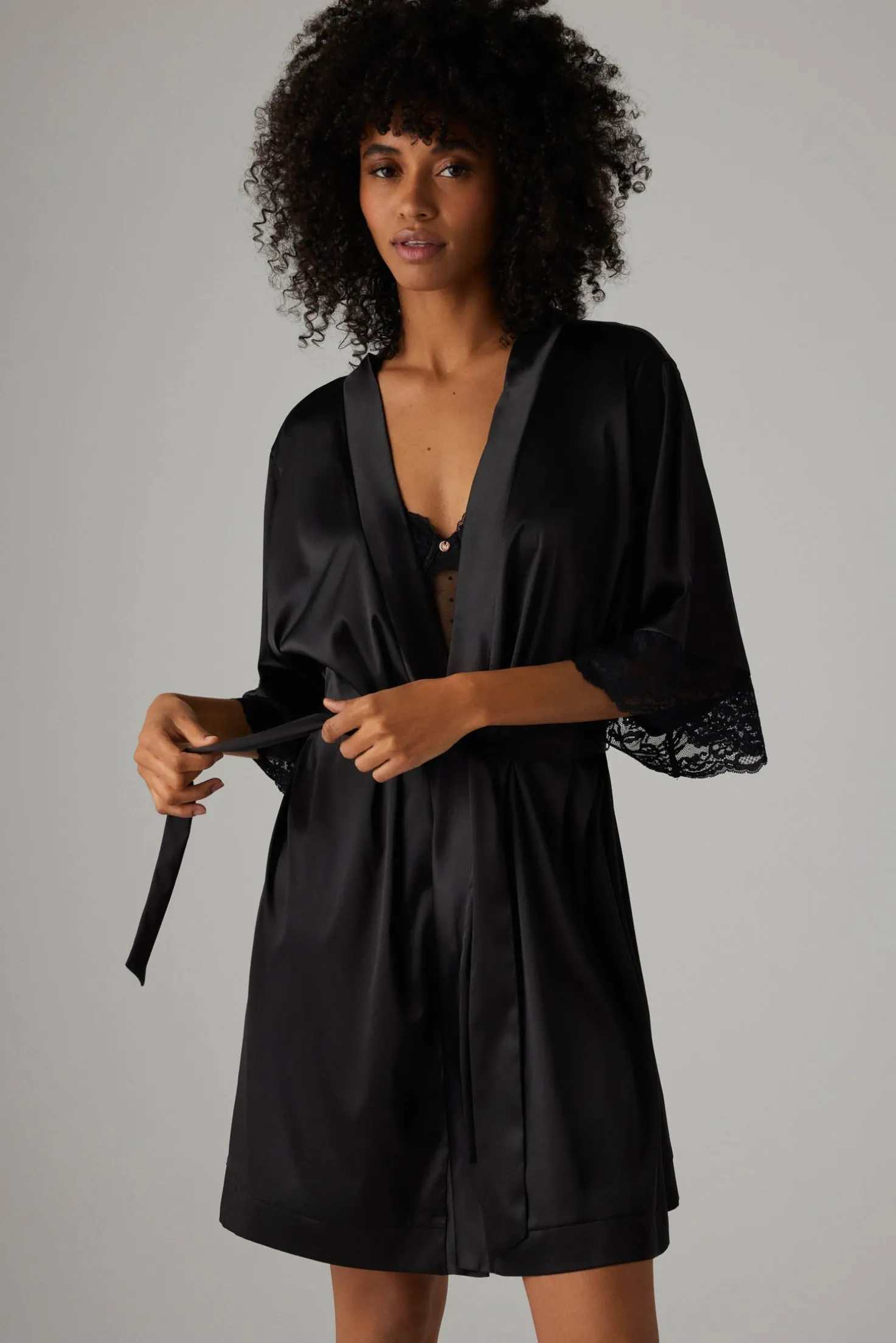 Bata en satén con detalles de encaje. Con cinturón y mangas 3/4. Color negro.