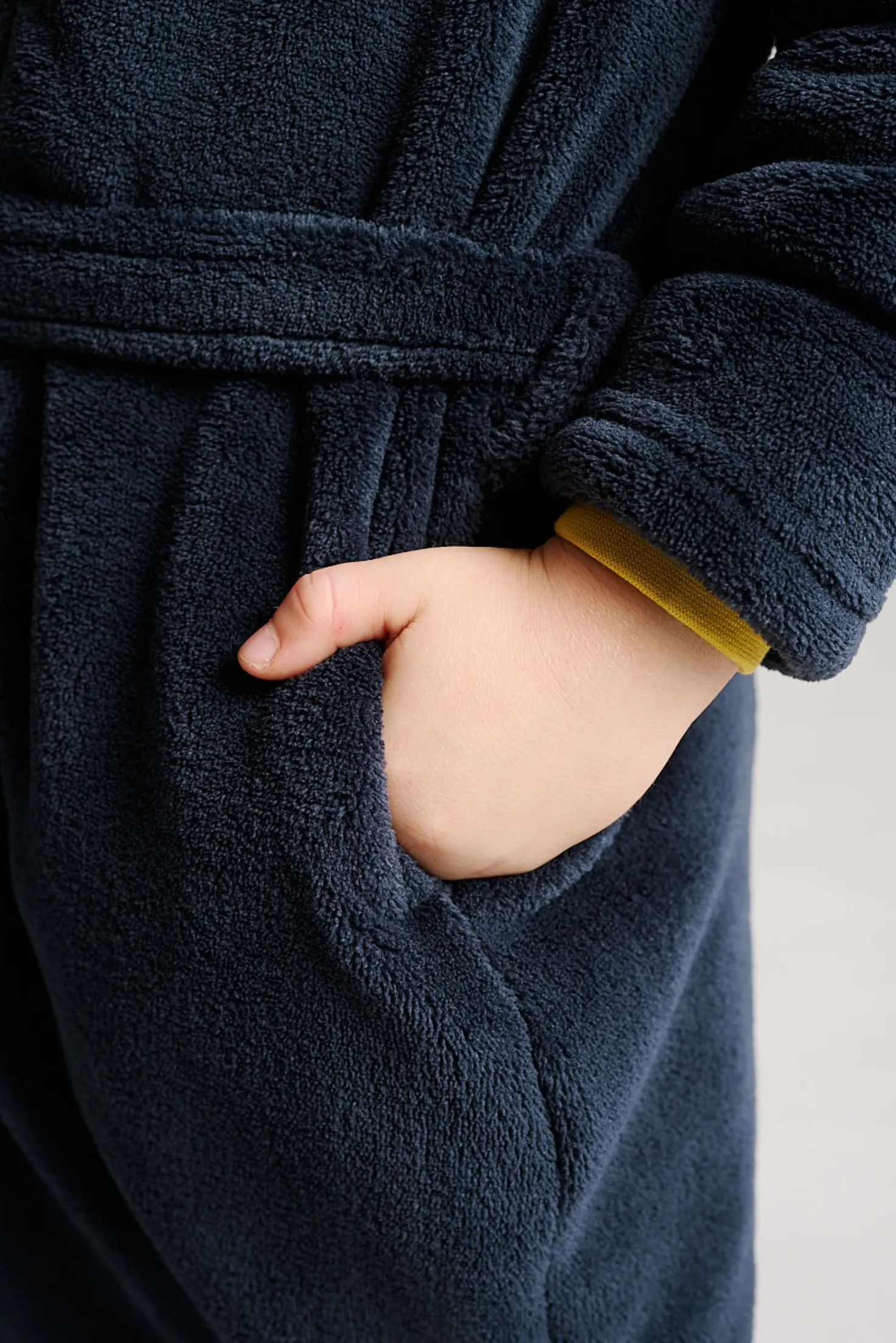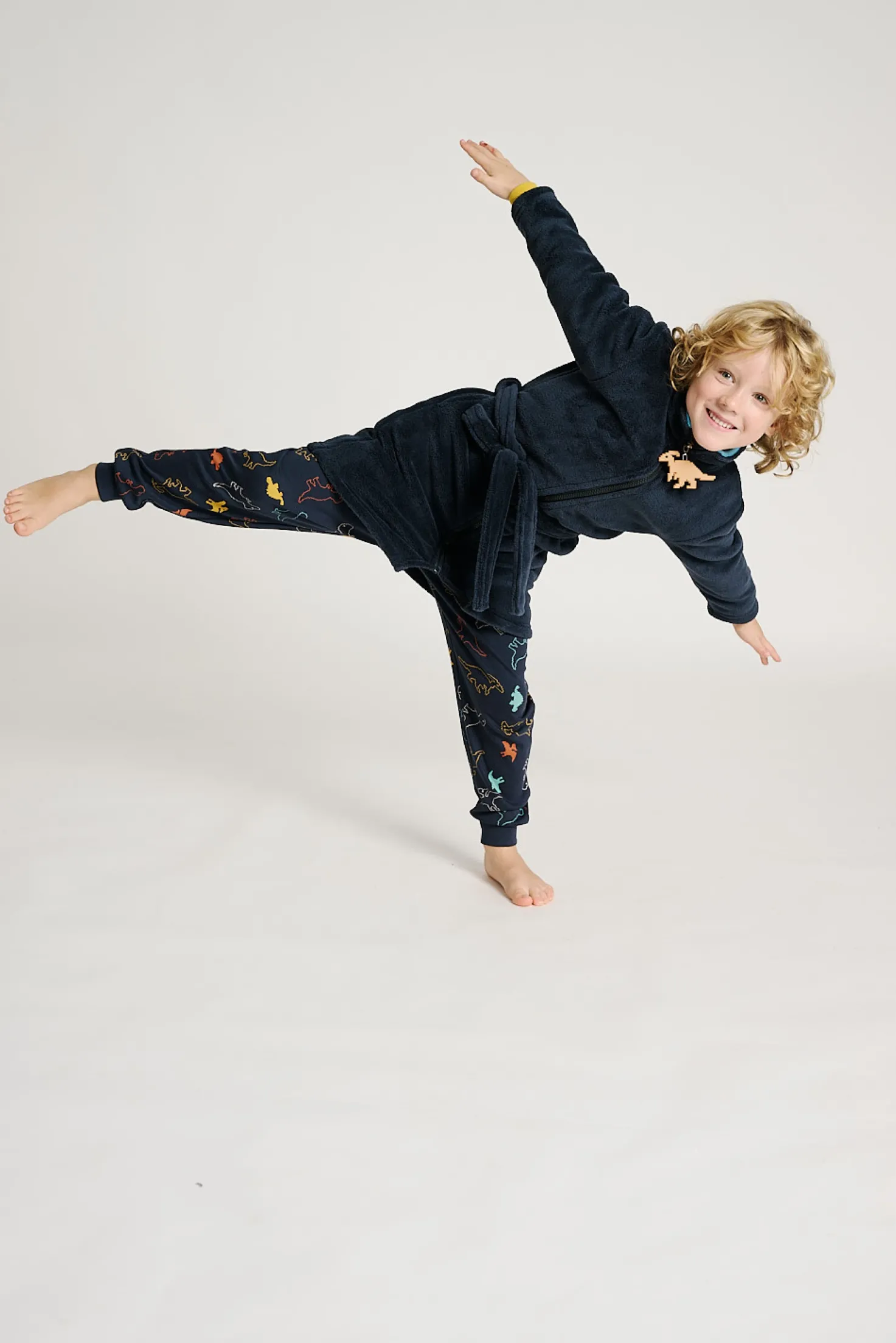 Bata para chicos de 10 a 16 años, confeccionada en suave tejido polar tipo borreguito de color azul marino liso, con ligero efecto jaspeado. Incluye cierre frontal de cremallera adornado con tirador en forma de dinosaurio, cinturón ajustable y cuello alto para mayor abrigo. Su diseño cómodo y cálido es ideal para mantenerte protegido durante los días fríos en casa.