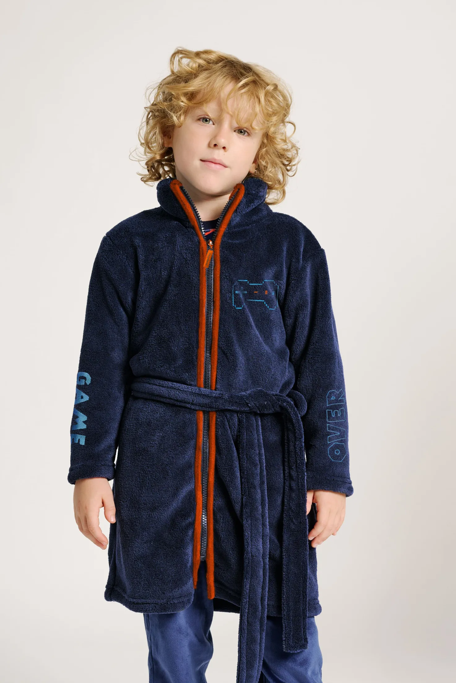 Bata de casa para chico confeccionada en suave tejido polar de color azul marino, decorada con bordados inspirados en el mundo gamer, incluyendo un mando en el pecho y las palabras “GAME” y “OVER” en las mangas. Presenta cremallera frontal en contraste naranja, cinturón ajustable y capucha para mayor abrigo. Un diseño cómodo y original, ideal para mantener el calor en los días fríos con un toque divertido