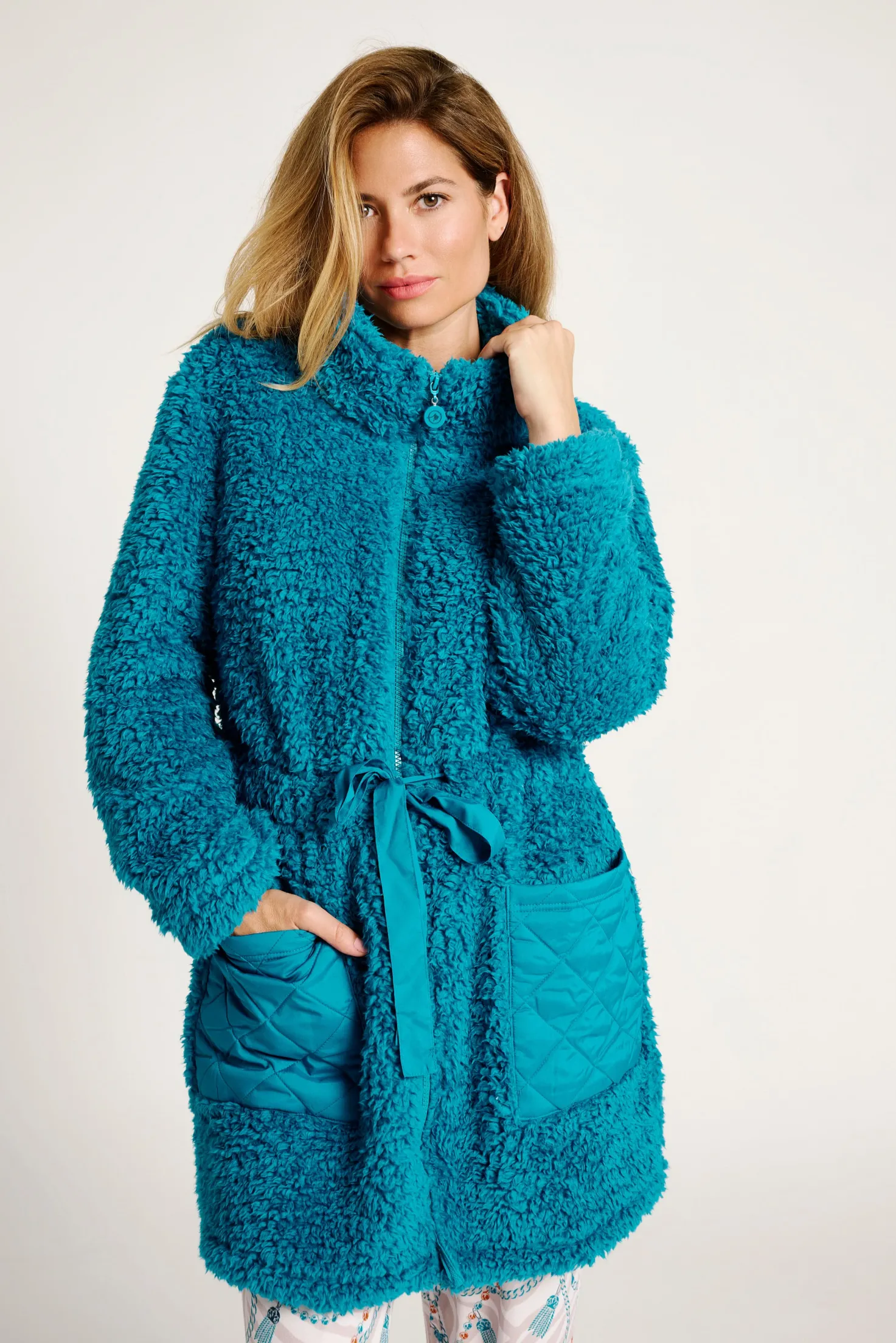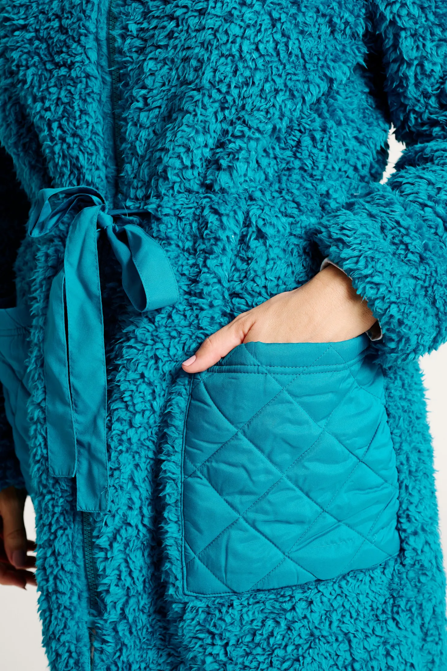 Bata para mujer con tejido suave tipo borreguito en color azul intenso. Cuenta con cierre frontal de botones, cinturón ajustable y dos bolsillos grandes acolchados en tejido acolchado a contraste. Diseño cálido y moderno, perfecto para disfrutar de la comodidad en casa durante los días fríos.