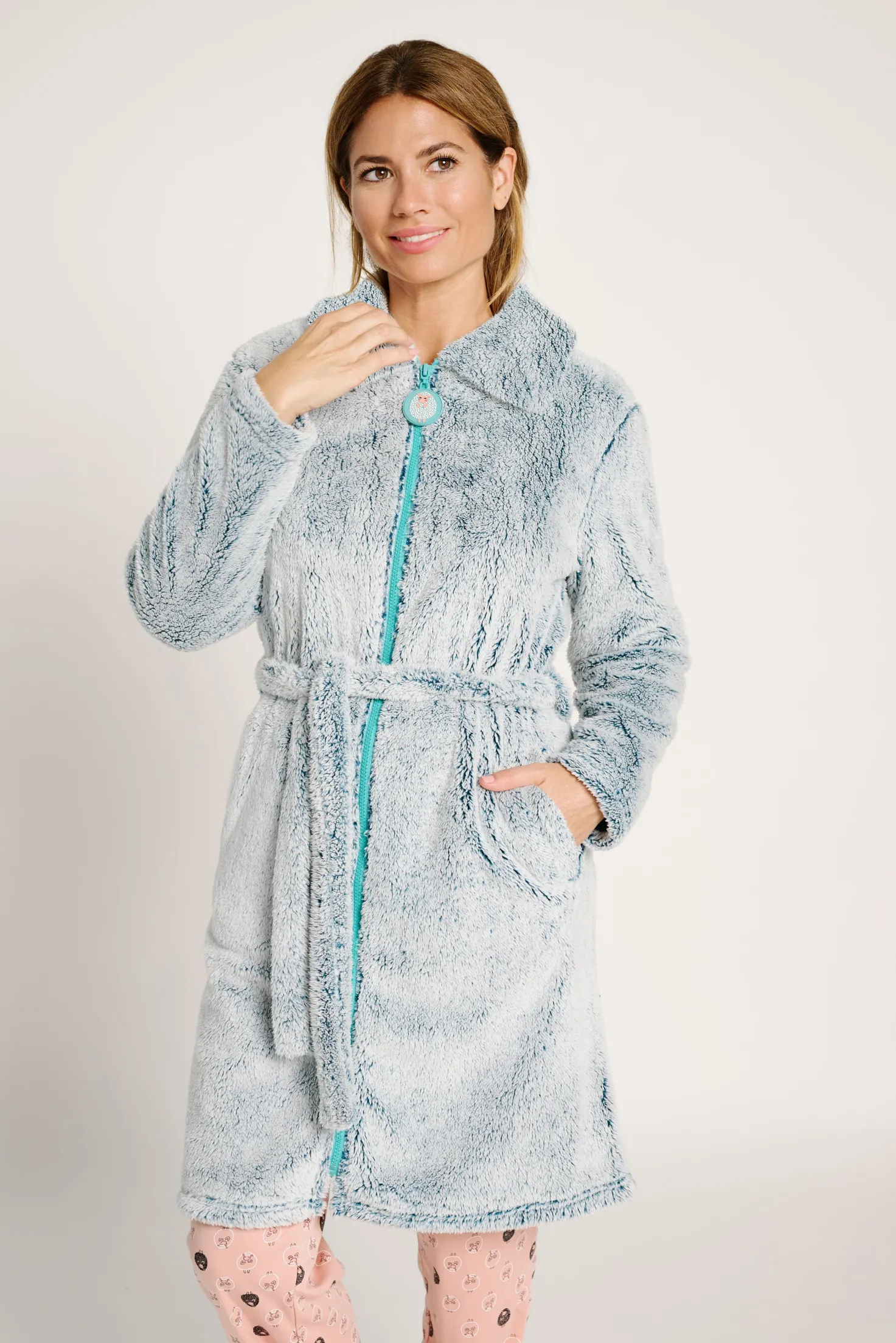Bata larga de suave tejido polar con acabado jaspeado en tonos gris y azul. Cuenta con cierre de cremallera frontal en contraste con tirador redondo y cinturón ajustable para mayor comodidad. Incluye prácticos bolsillos laterales y cuello alto para más abrigo, perfecta para los días fríos en casa.