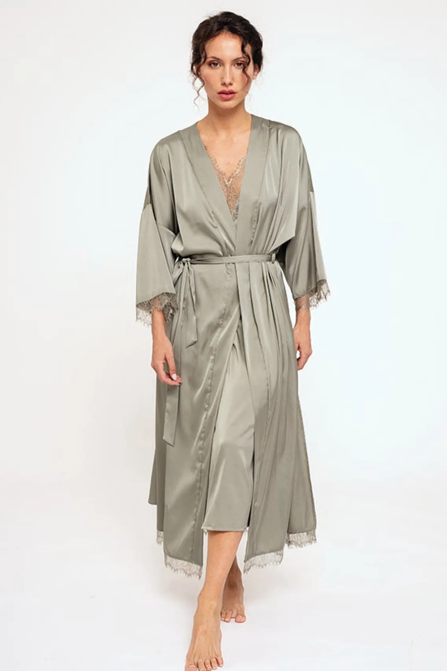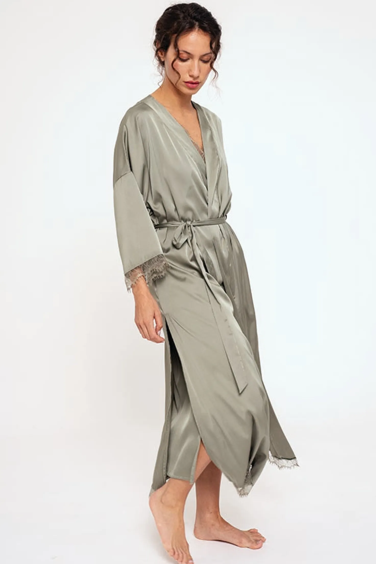 Bata larga satinada en color verde. Manga larga con detalles de encaje. Se puede anudar a la cintura.