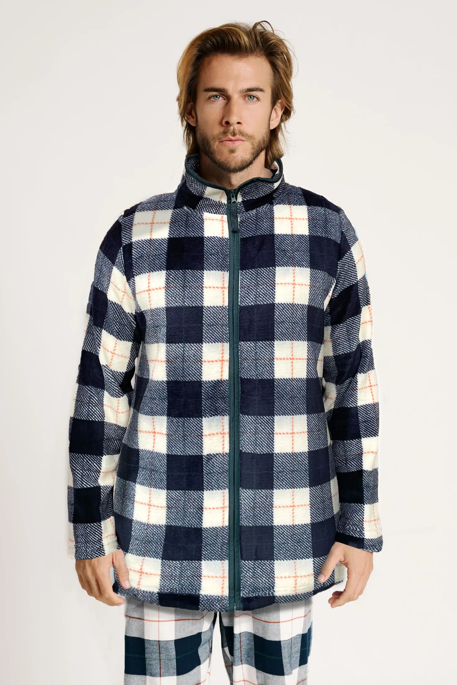 Esta bata polar de hombre es perfecta para quienes valoran el confort sin renunciar al estilo. Confeccionada en un tejido polar suave y cálido, su estampado de cuadros en tonos marino y crudo aporta un aire atemporal y masculino. El cierre con cremallera y los bolsillos laterales la convierten en una prenda práctica, pensada para el día a día en casa.