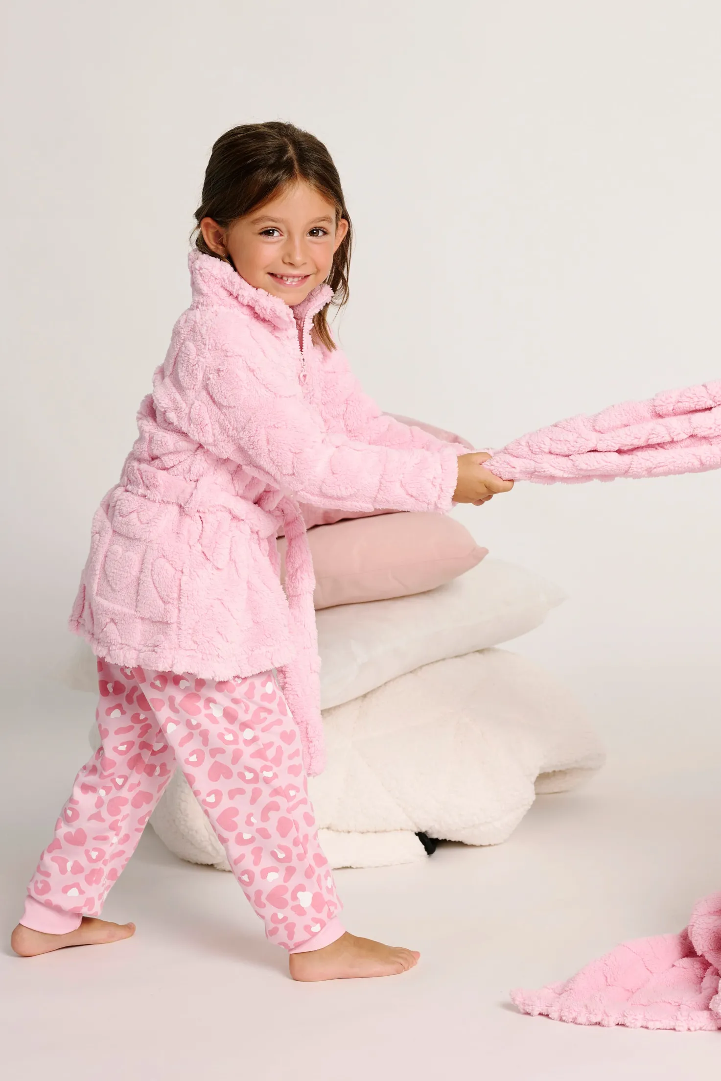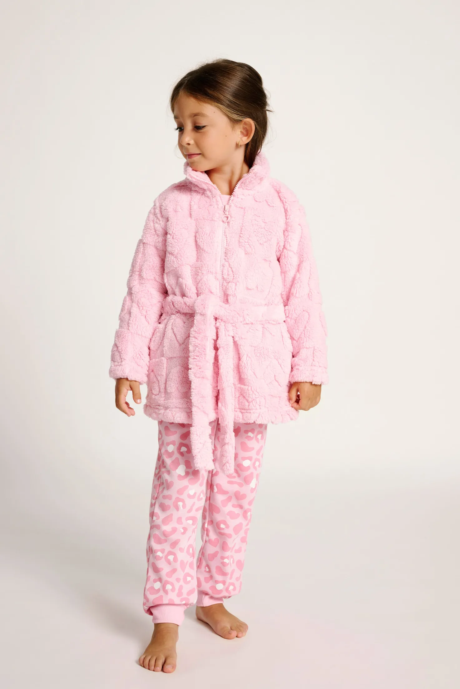 Bata para niña confeccionada en suave tejido polar con relieve de corazones en color rosa pastel. Incluye cinturón ajustable para un ajuste cómodo y cierre frontal de cremallera. Con cuello alto para mayor abrigo, esta prenda es perfecta para mantener la calidez durante los días fríos en casa, combinando suavidad, confort y un diseño dulce.