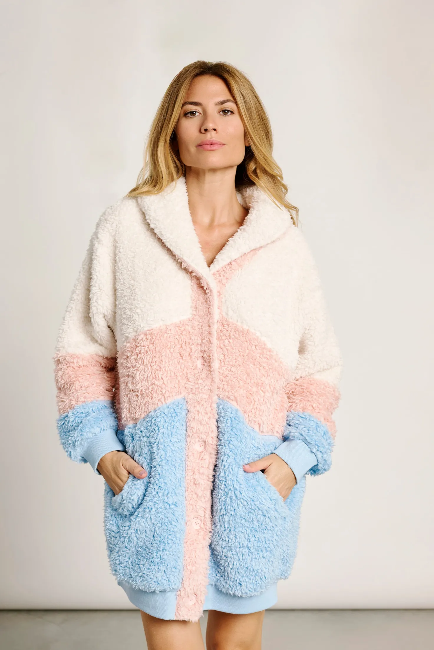Bata larga de suave tejido polar tipo borreguito en combinación de colores blanco, rosa y azul. Cuenta con cierre de botones delanteros, amplios bolsillos laterales y puños en tejido elástico a contraste. Diseño cómodo y cálido, ideal para estar en casa con estilo en los días más fríos.