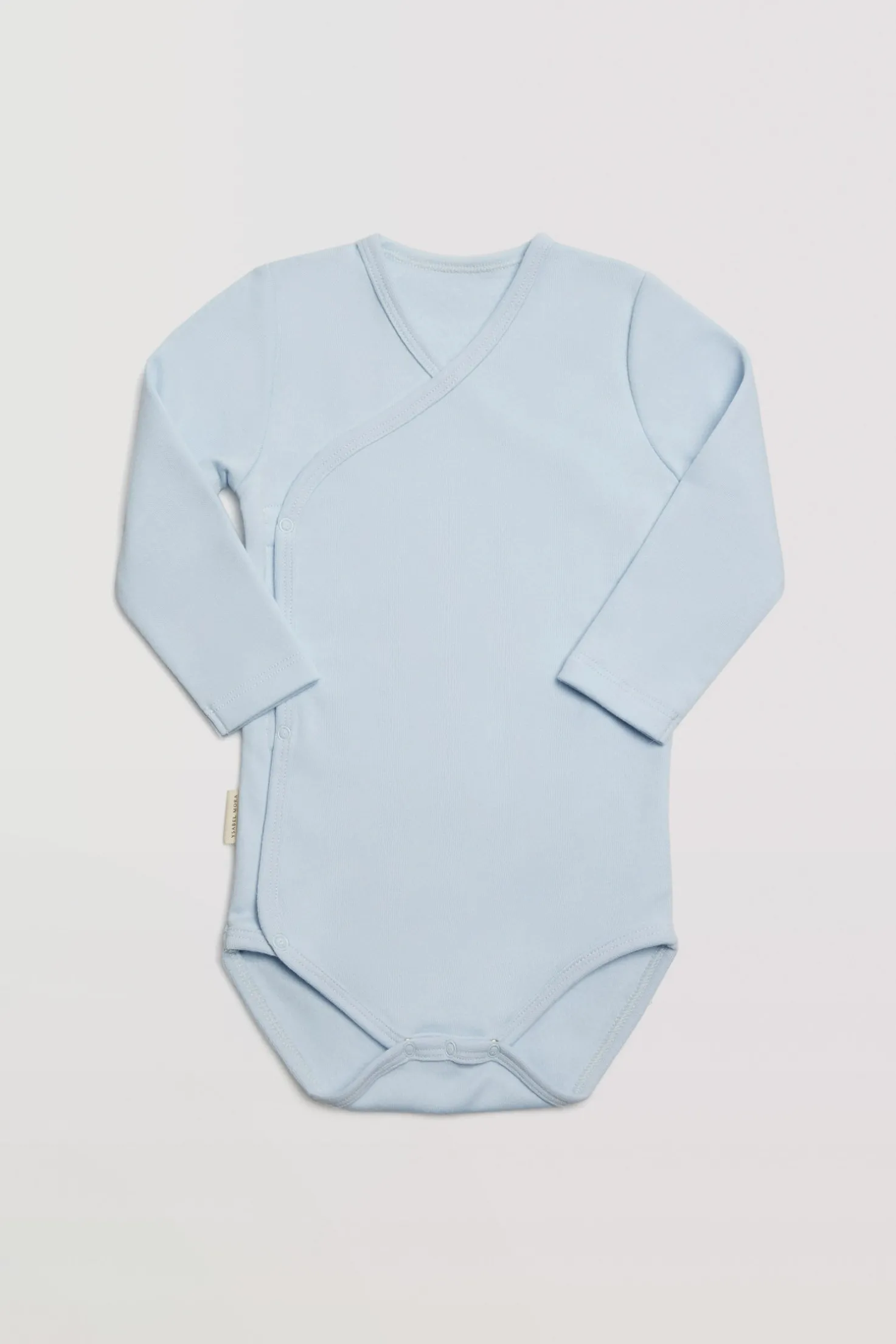 Body de bebé de manga larga con algodón natural. De estilo cruzado, con cuello pico. Prenda confeccionada en un tejido suave y agradable gracias a su interior afelpado. Color azul celeste.