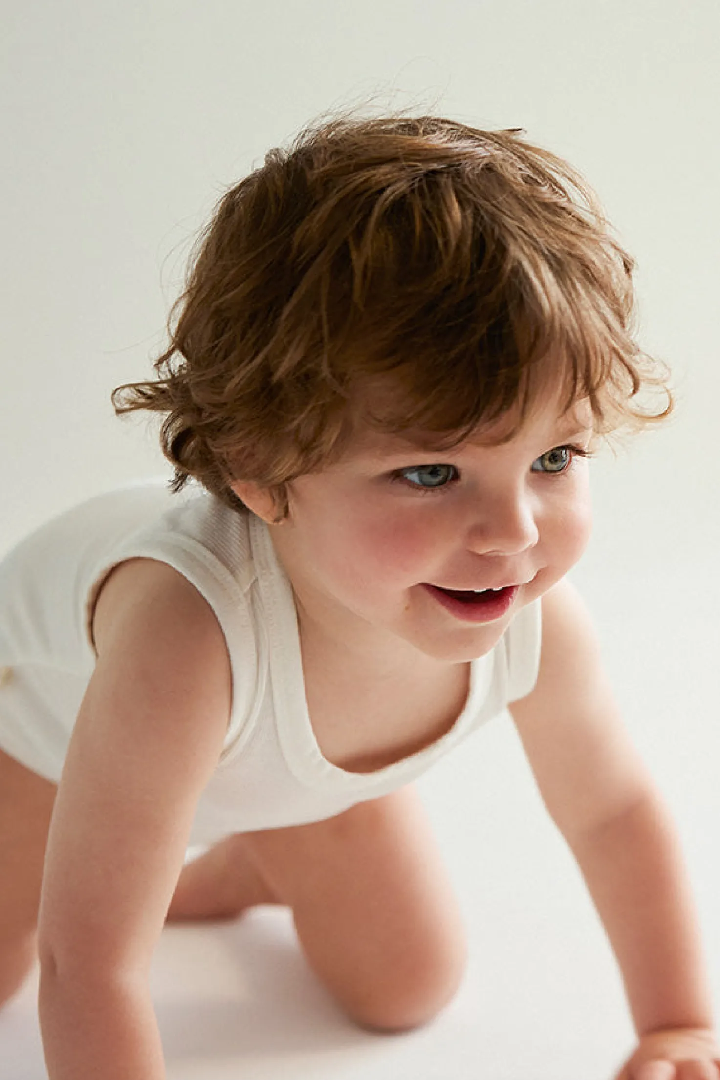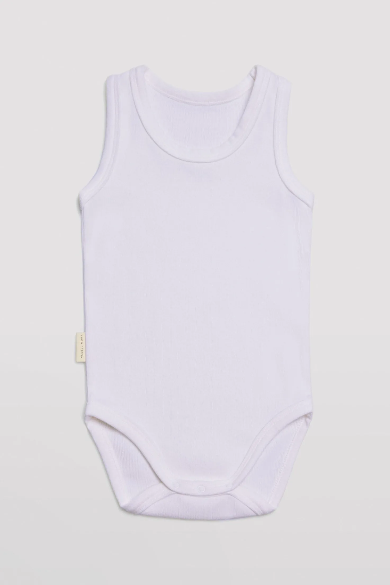 Body básico de tirantes para bebé. Diseño liso de color rosa. El body se ajusta mediante botones a presión en la entrepierna. Tirantes anchos, perfecto para verano. Confeccionado con algodón natural, un material que es suave y transpirable, lo que lo convierte en una opción ideal para la piel delicada de los bebés. Color blanco.