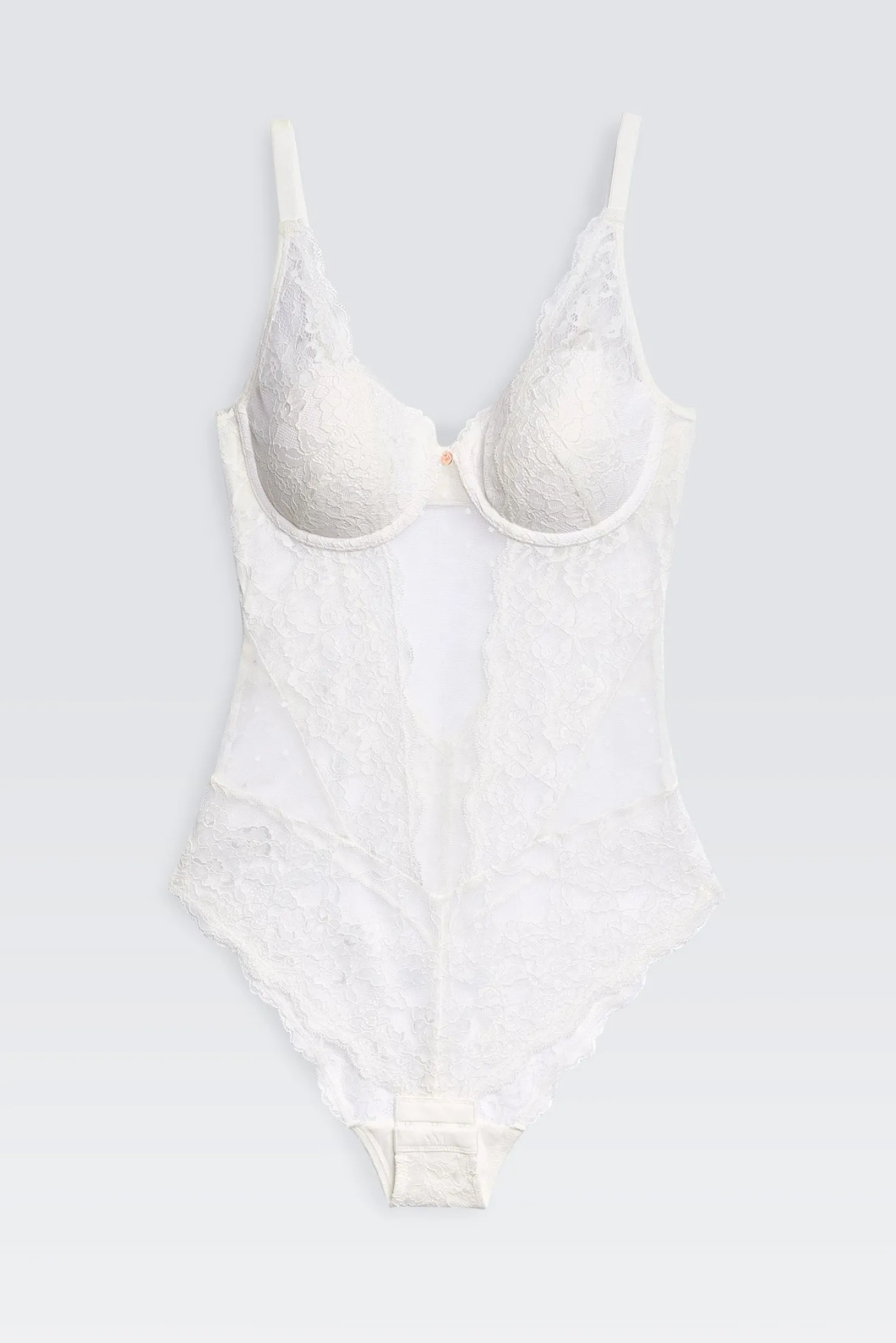 Nuestro body lencero de encaje con push up destaca por su delicado diseño y sus detalles encantadores. Las copas escotadas favorecen su uso bajo prendas con escote abierto, realzan tu figura y aportan un toque sensual a cualquier outfit.