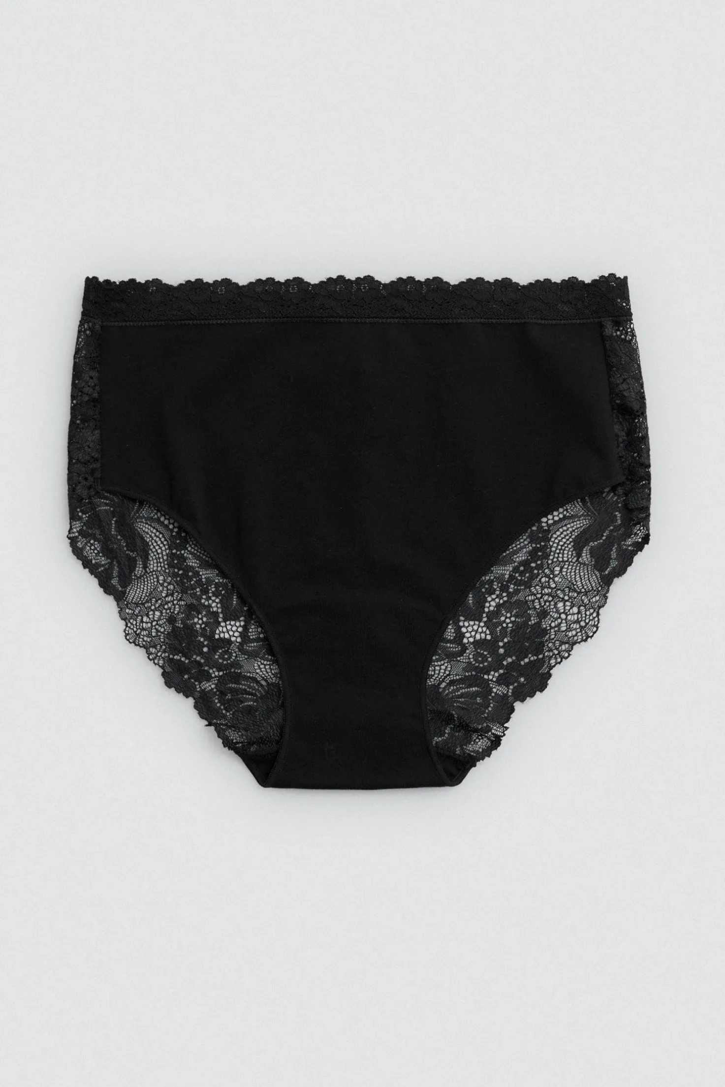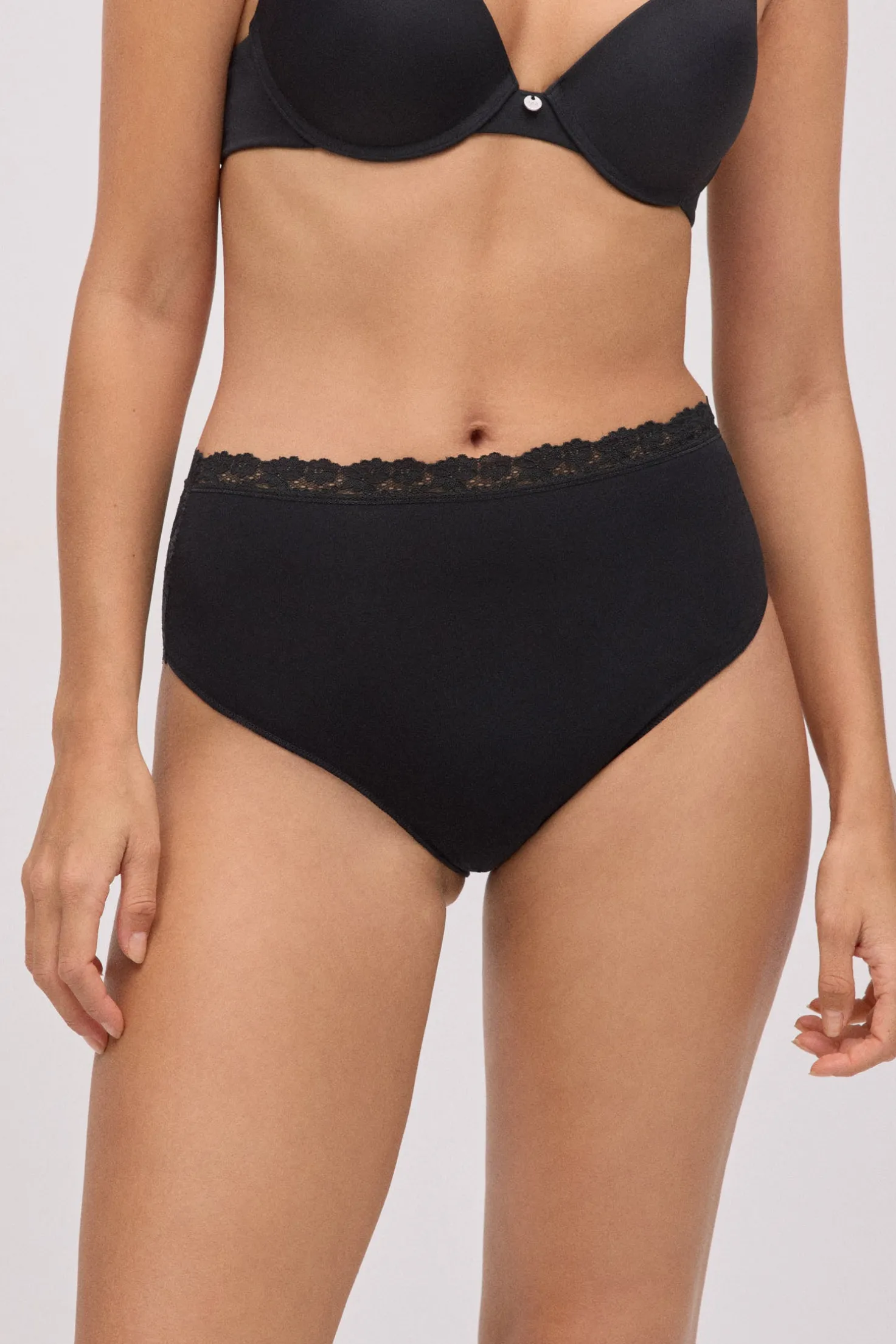 Braga alta confeccionada en algodón natural con diseño cómodo y suave al tacto. Su diseño ofrece una cobertura envolvente, combinando funcionalidad con un estilo femenino gracias a los detalles de encaje en la cinturilla y en la parte trasera. Ideal para quienes buscan comodidad sin renunciar al diseño.