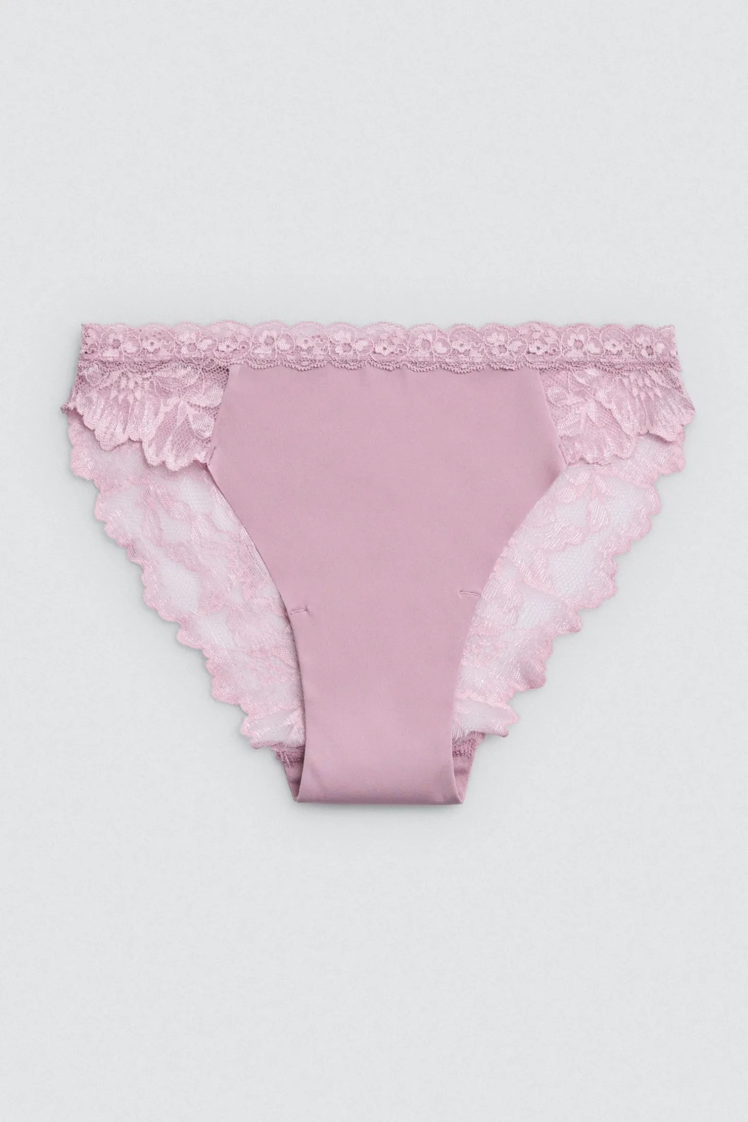 Braga brasileña con diseño elástico y corte láser, que garantiza un ajuste suave y sin marcas. Confeccionada en tejido cómodo y diseñada con detalles de encaje en los laterales y en la parte trasera, aporta un toque sofisticado sin renunciar al confort. Perfecta para looks ajustados o para el día a día con estilo.
