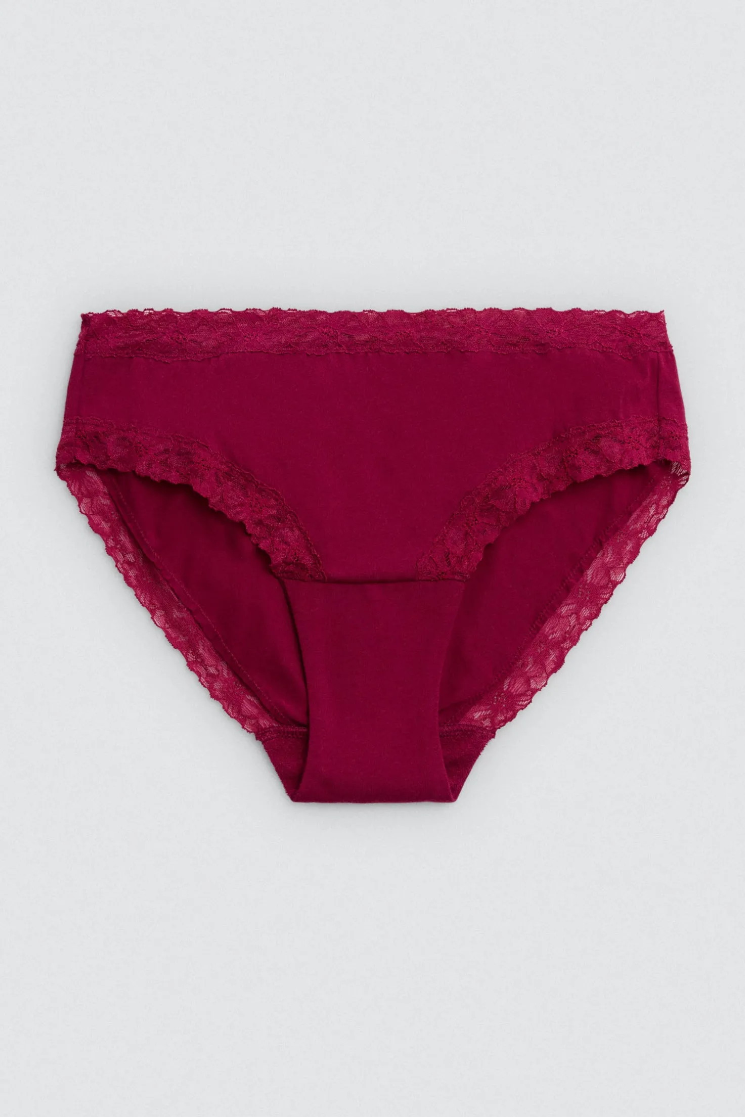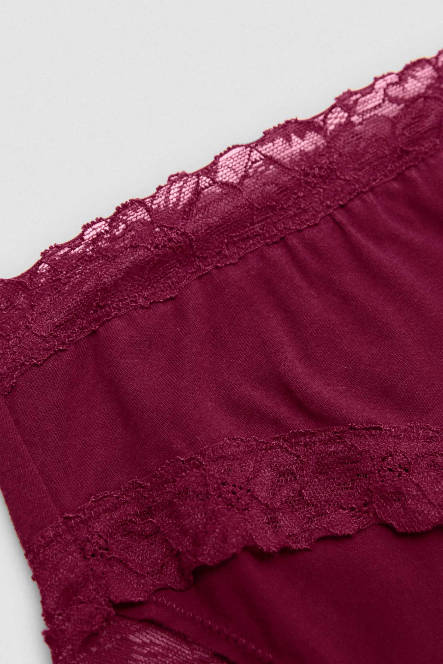 Braga midi confeccionada en algodón natural con un toque de elastano para garantizar suavidad, confort y transpirabilidad. Su diseño liso en color negro se complementa con delicados detalles de encaje en la cintura y los bordes, que aportan un toque femenino sin renunciar a la comodidad. Ideal para el uso diario.
