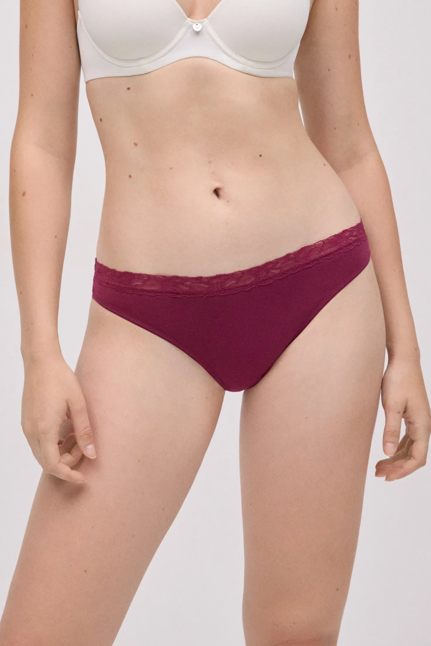Braga mini confeccionada en algodón natural para ofrecer suavidad, adaptabilidad y transpirabilidad. Su diseño liso se completa con delicados detalles de encaje en la cintura y los contornos, aportando un acabado femenino y elegante ideal para el uso diario.