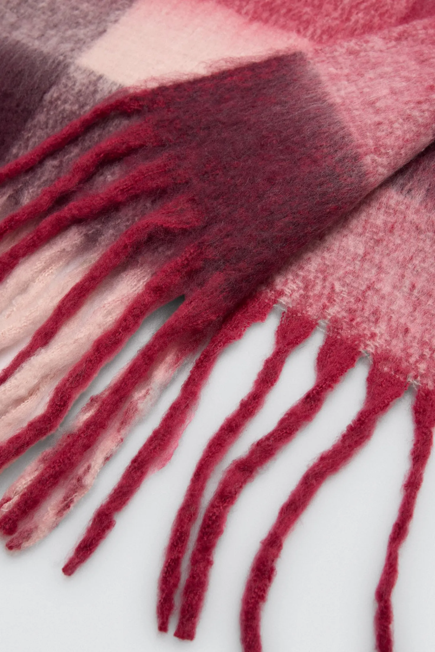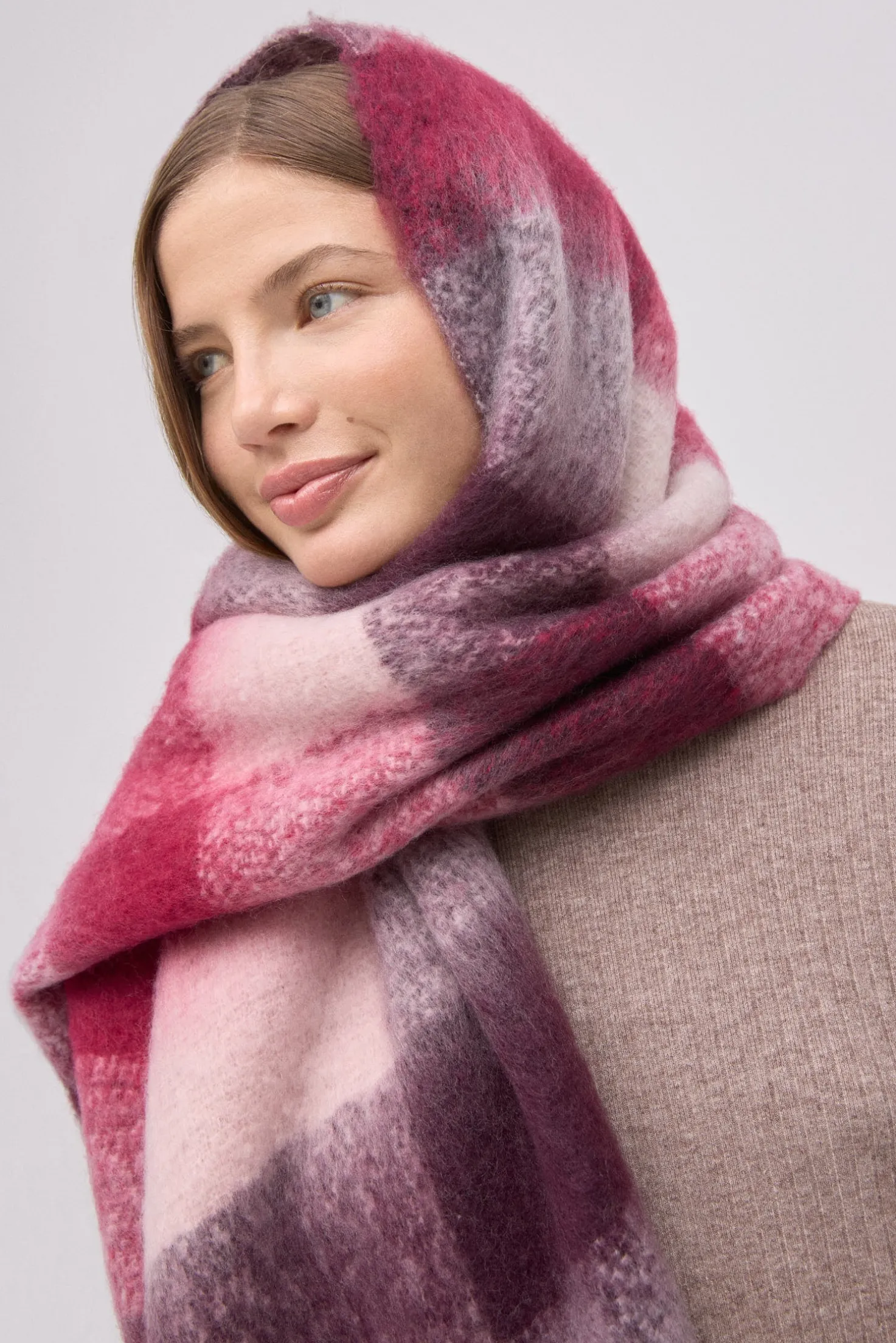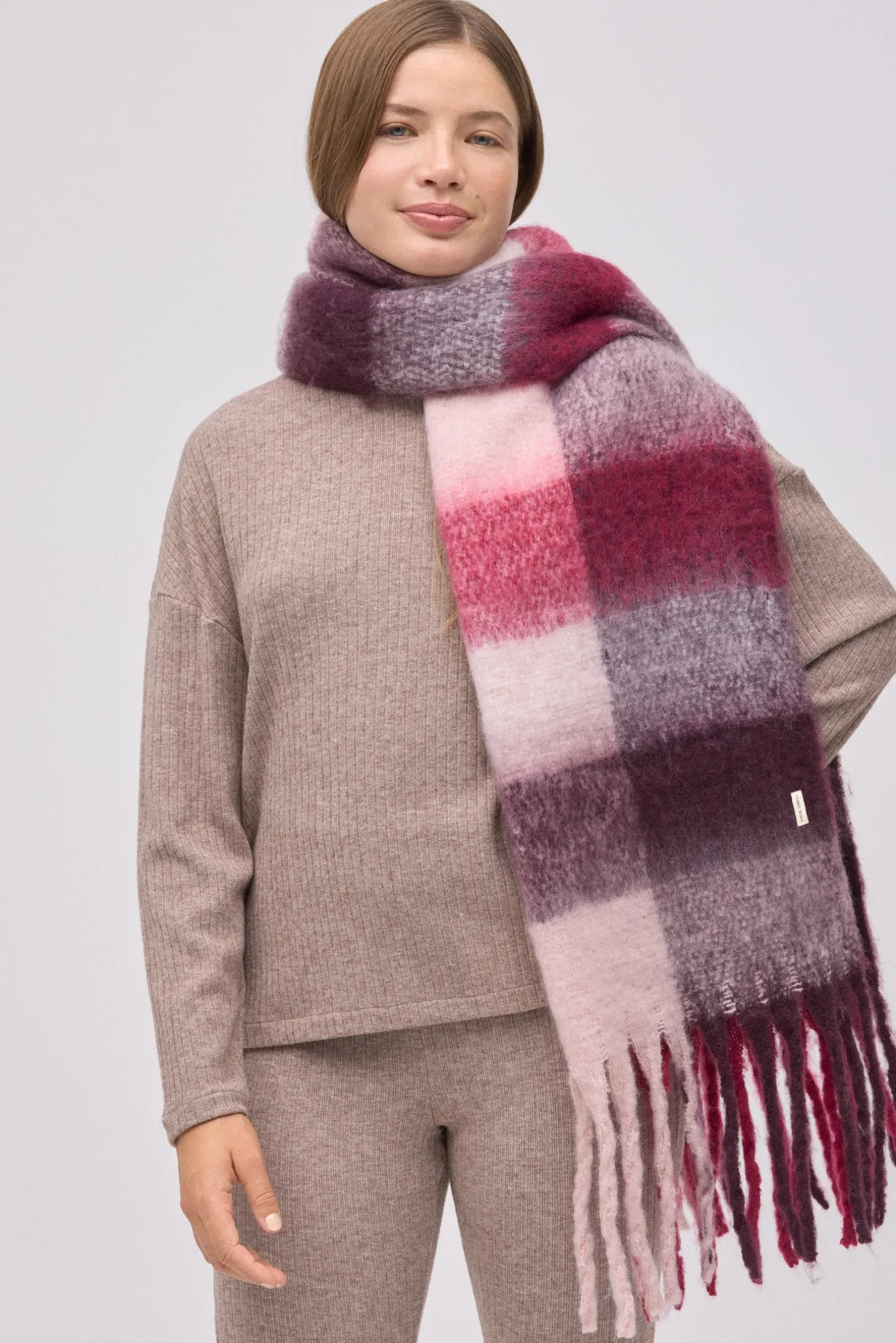 Estilo british renovado. Bufanda tipo pashmina de cuadros grandes en tonos granate, rosa y blanco. Elegante, cálida y con presencia.