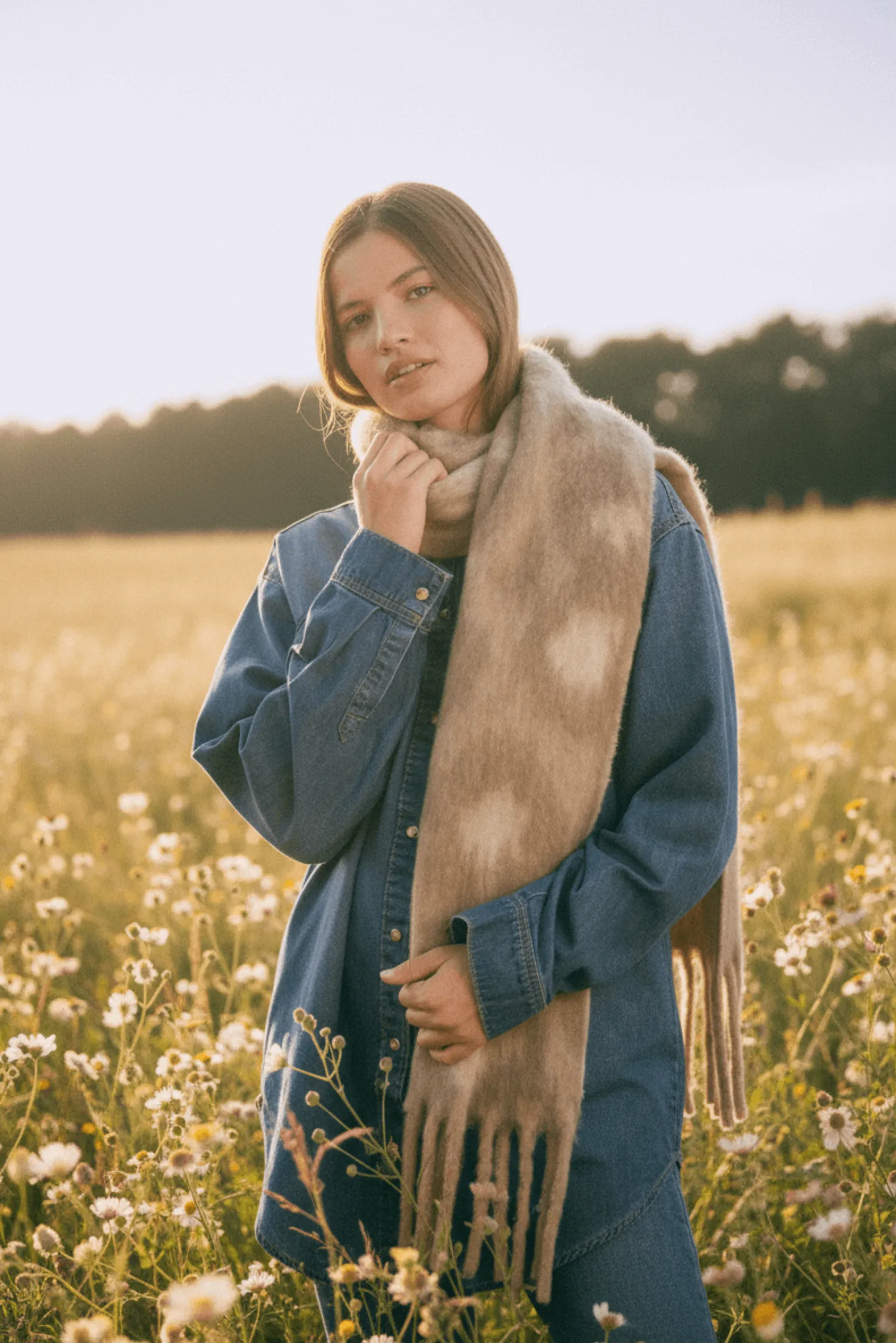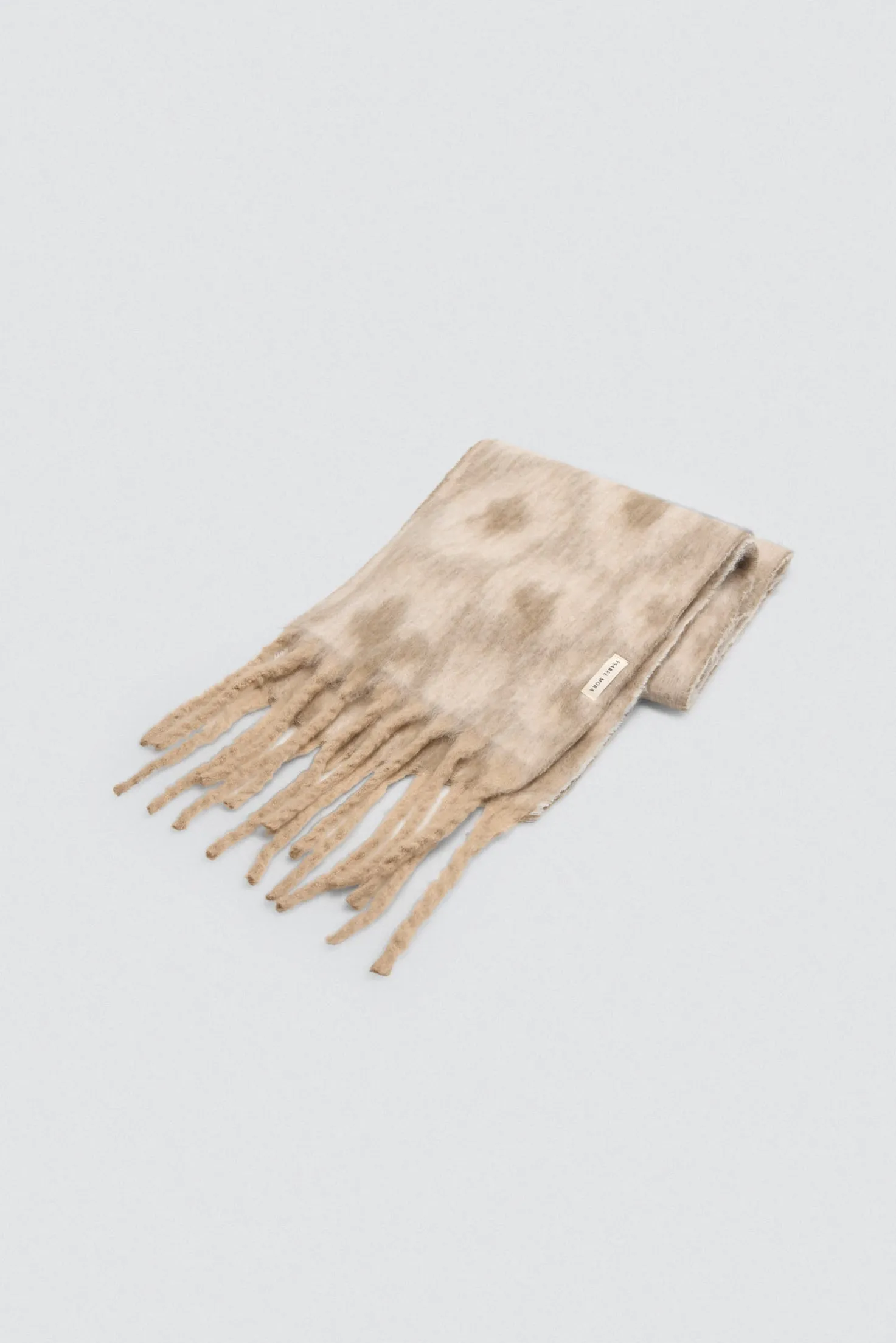 Diseño suave y difuminado en tonos tierra. Esta bufanda estampada aporta estilo y calidez en invierno.