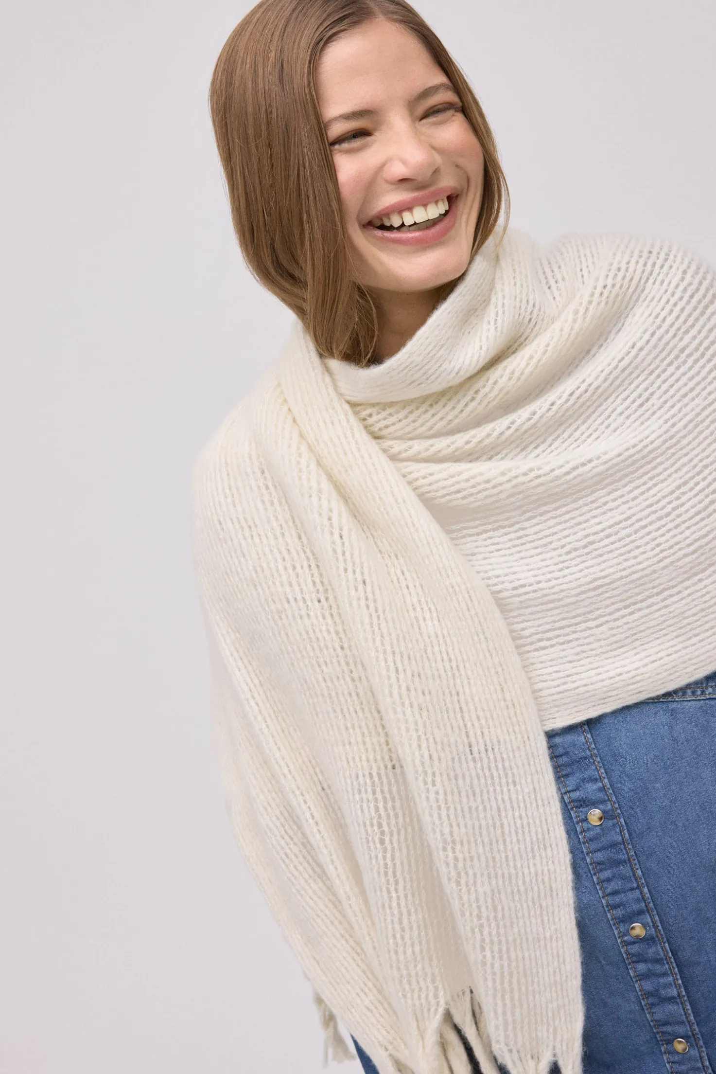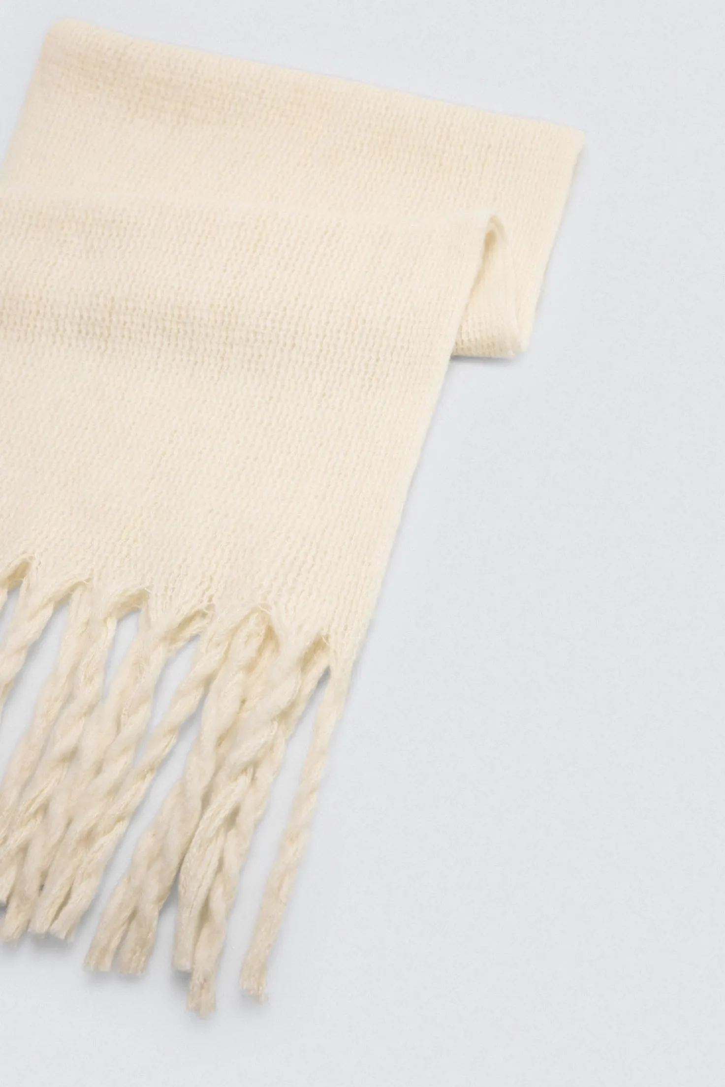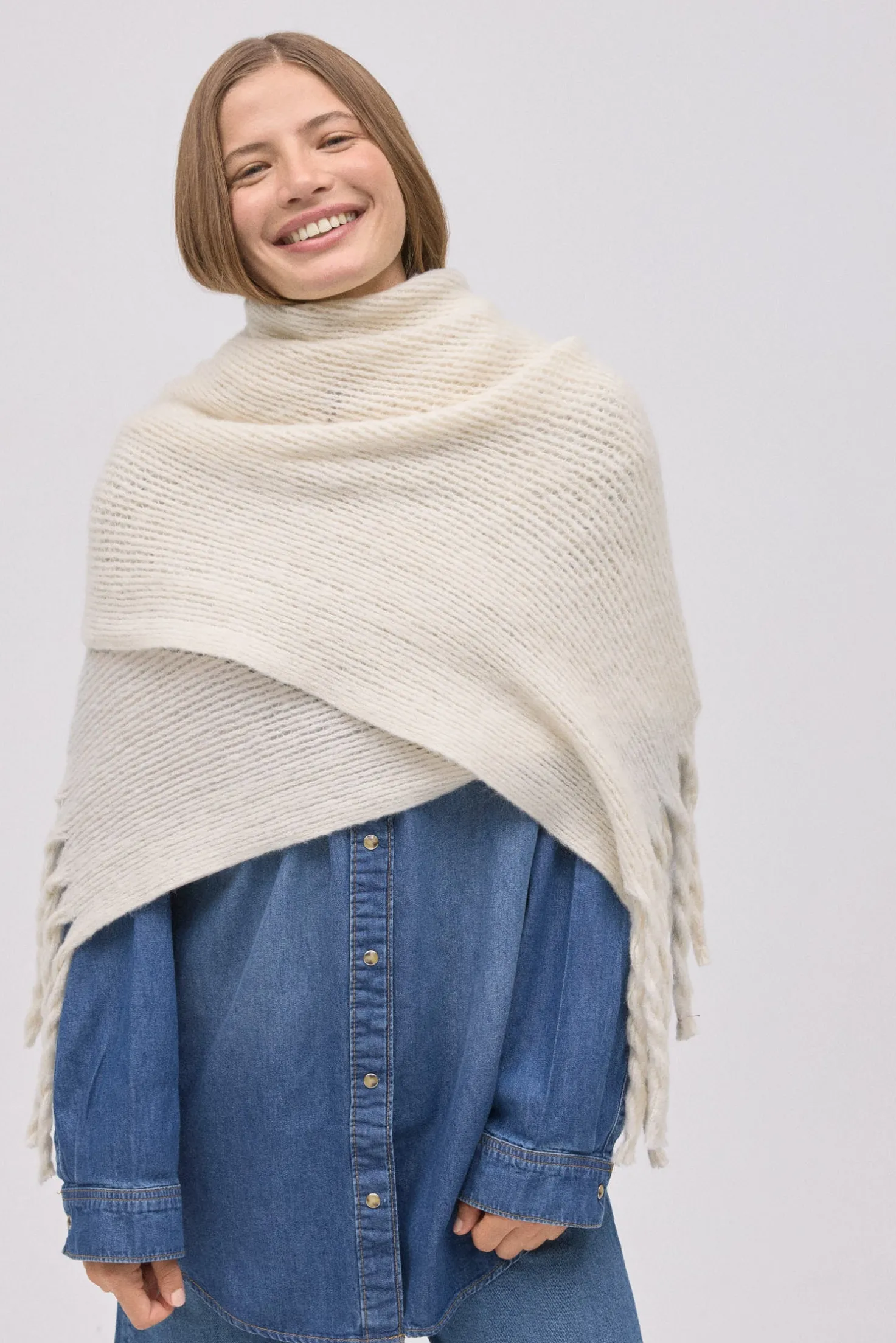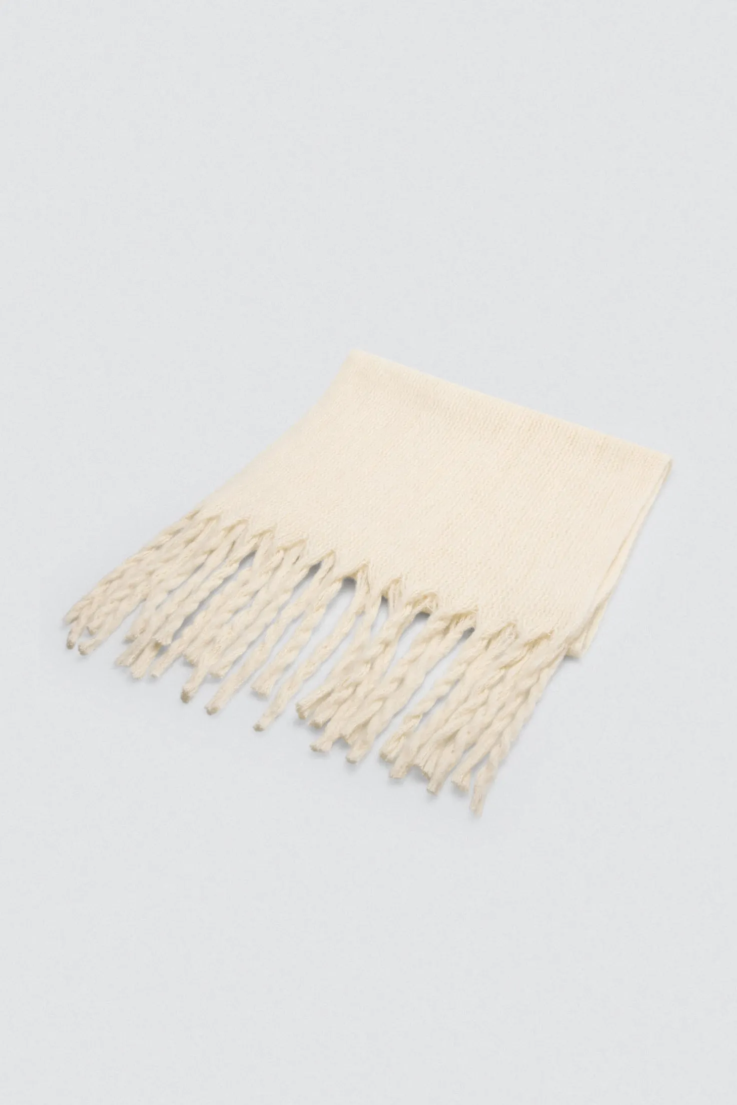 Bufanda lisa tipo pashmina con textura suave y flecos. Color beige.