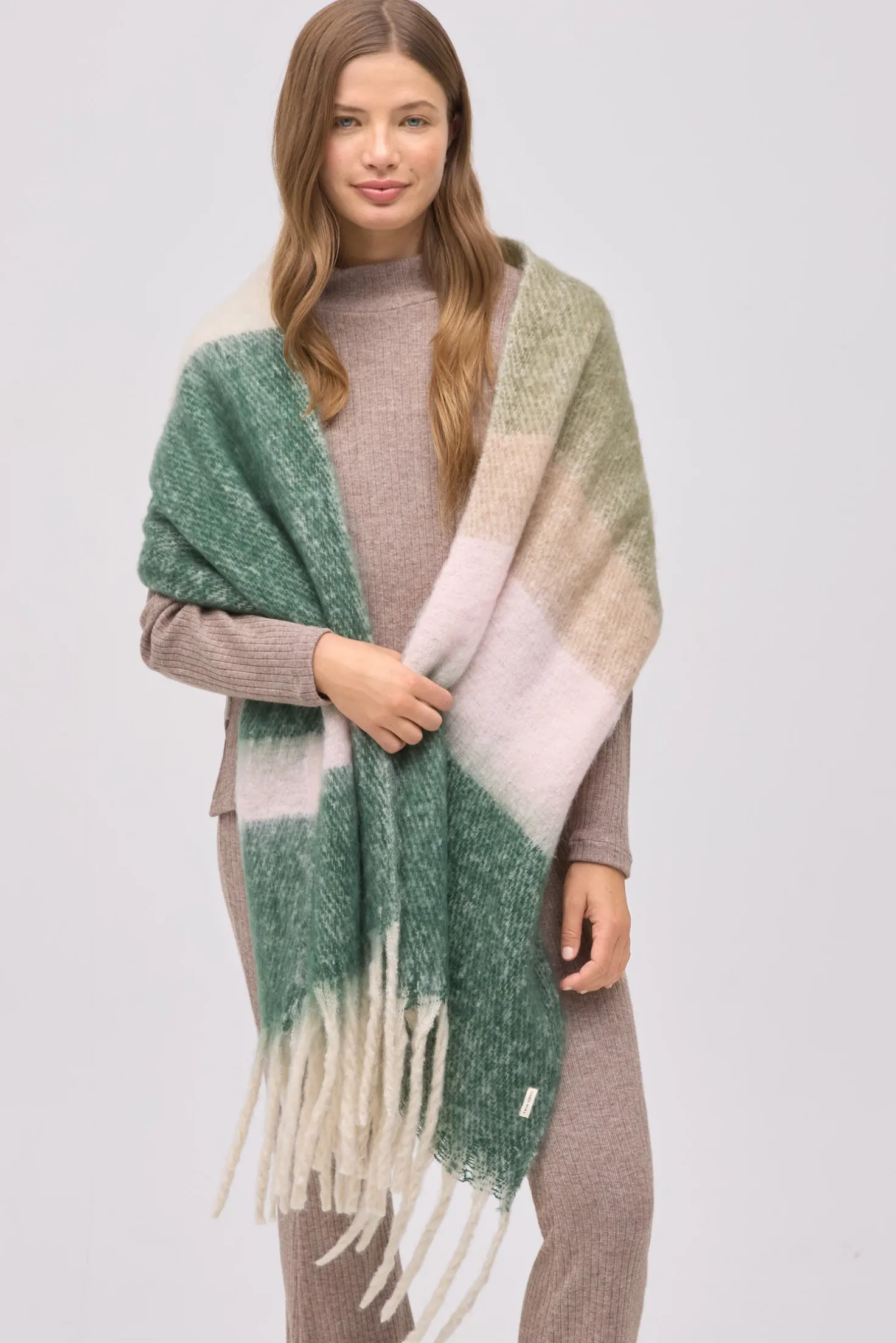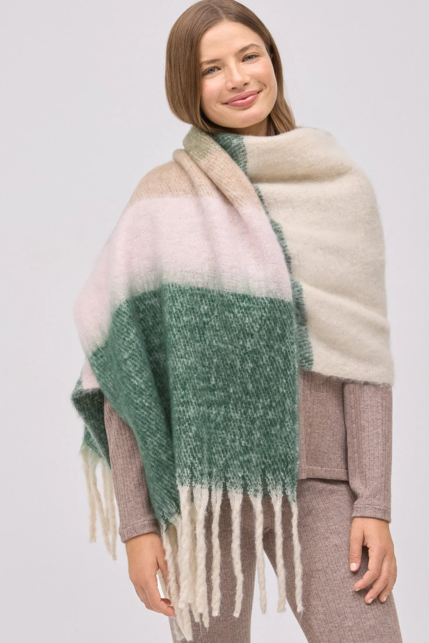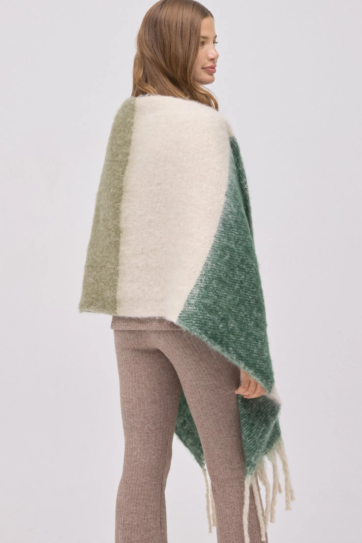 Bufanda tipo pashmina con franjas anchas en verde y beige. Su diseño envolvente y textura mullida la convierten en un básico para invierno.