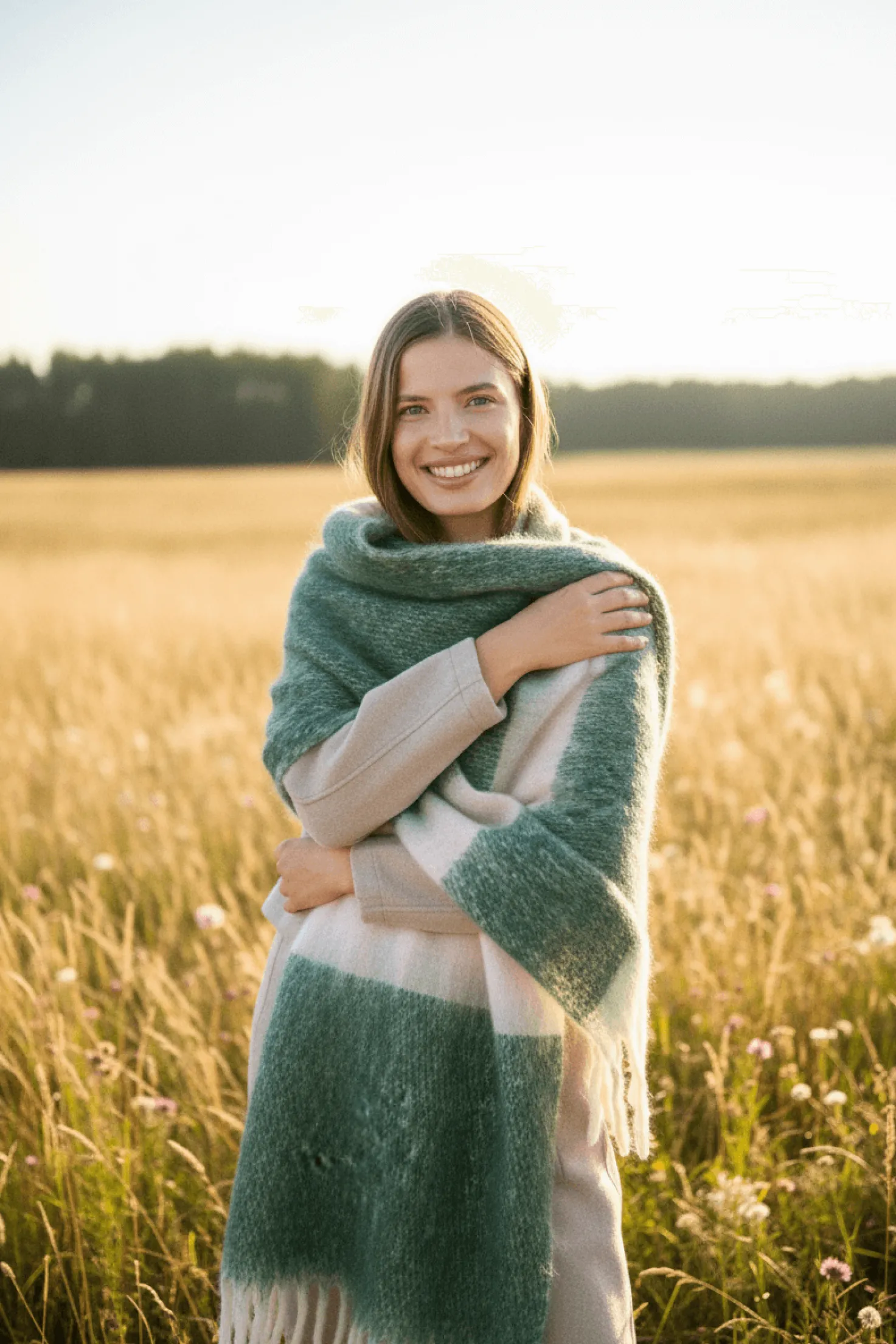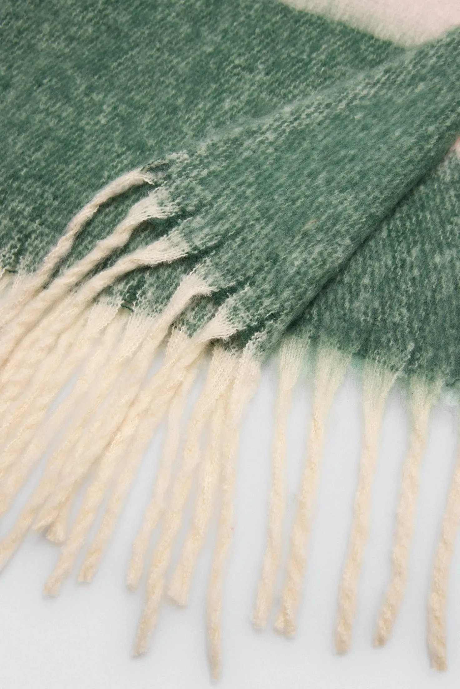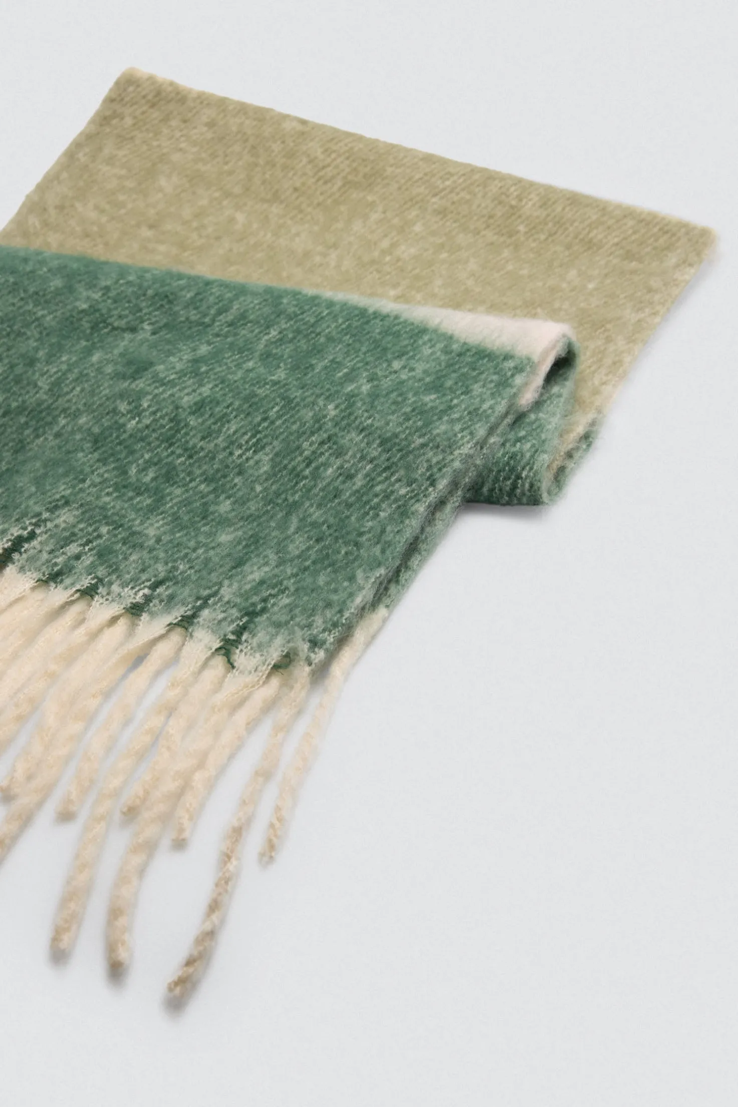 Bufanda tipo pashmina con franjas anchas en verde y beige. Su diseño envolvente y textura mullida la convierten en un básico para invierno.