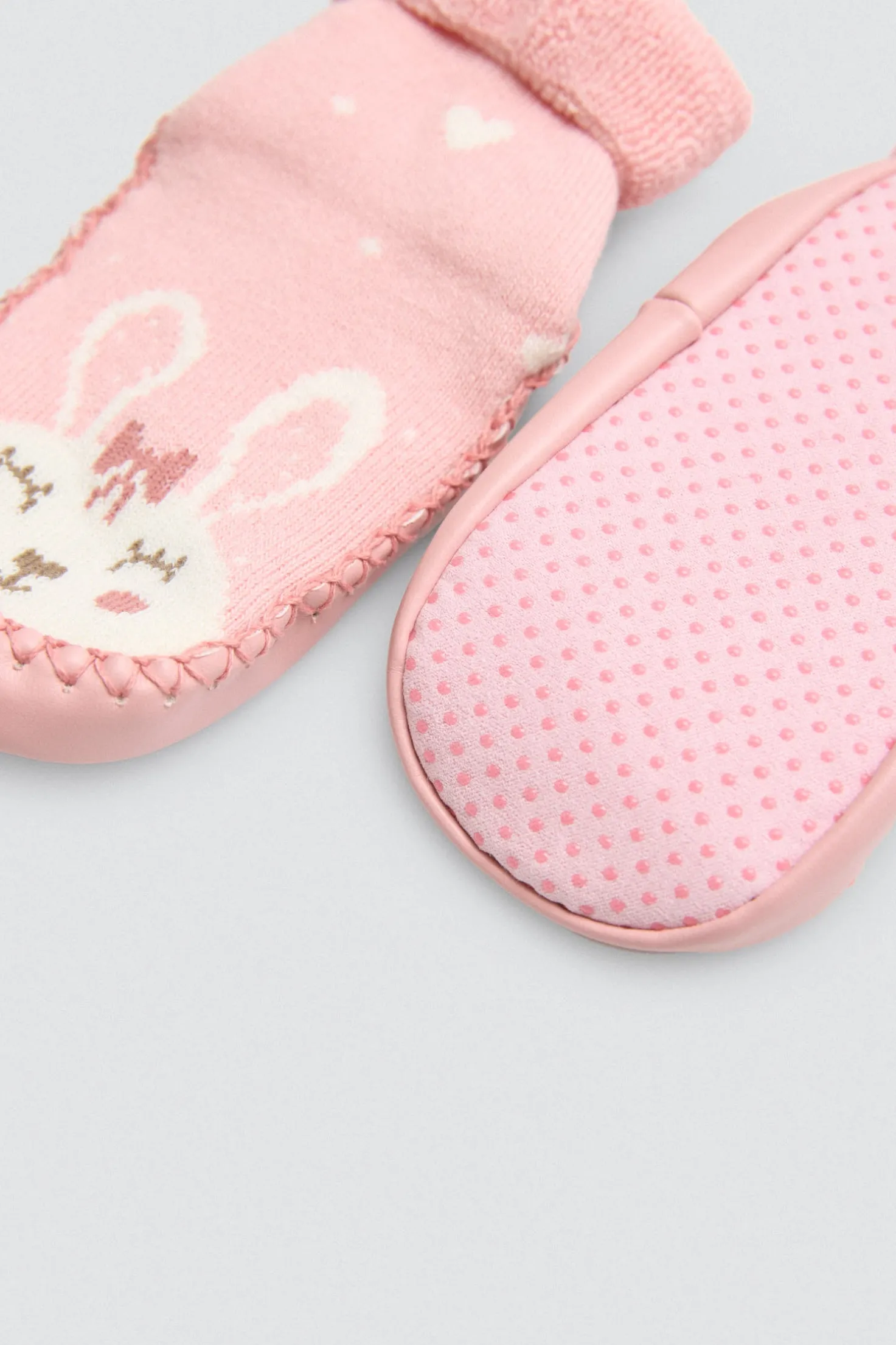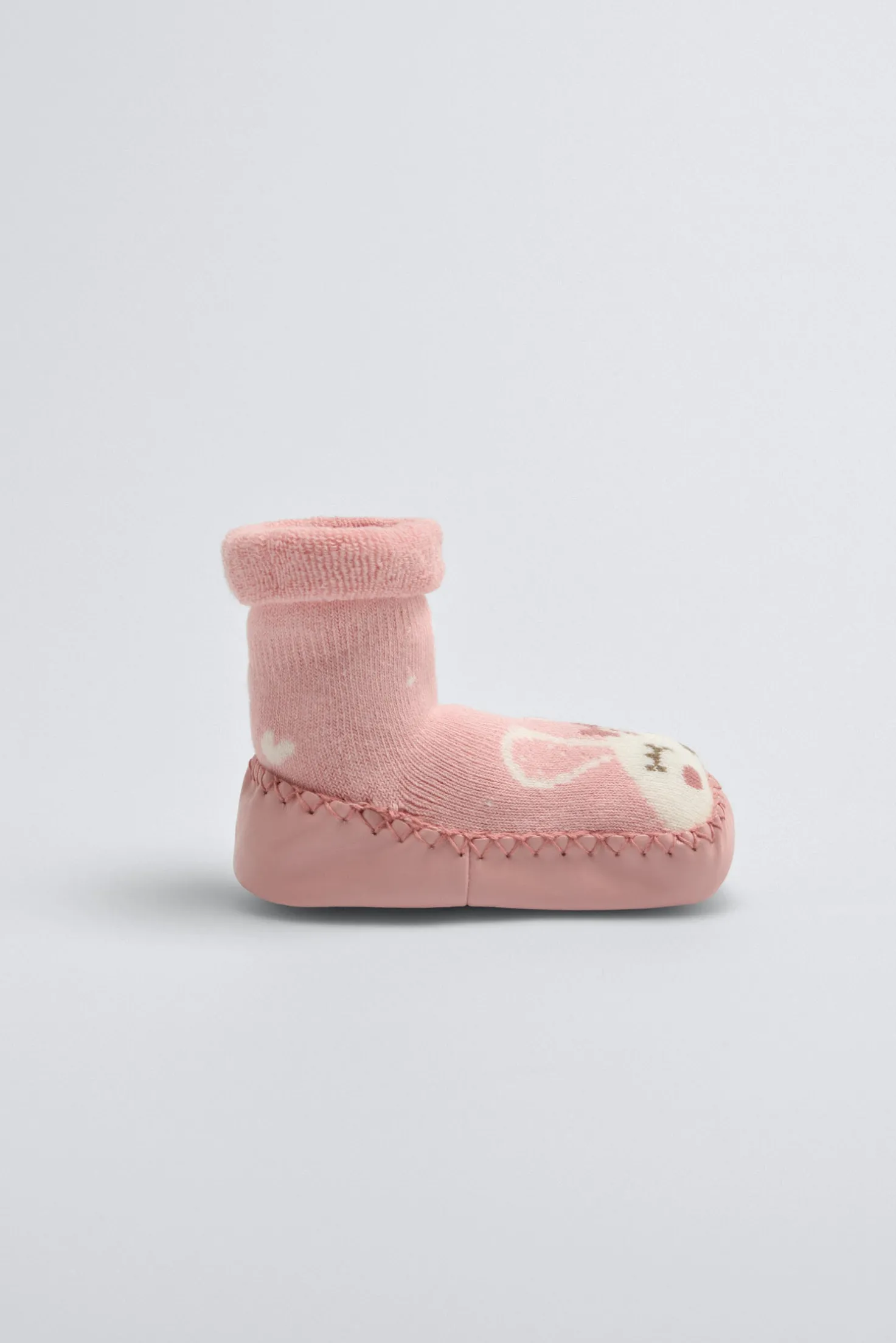 Calcetines zapatilla térmicos estampados para bebé con suela antideslizante. Dibujo de conejito. Puño antipresión.
