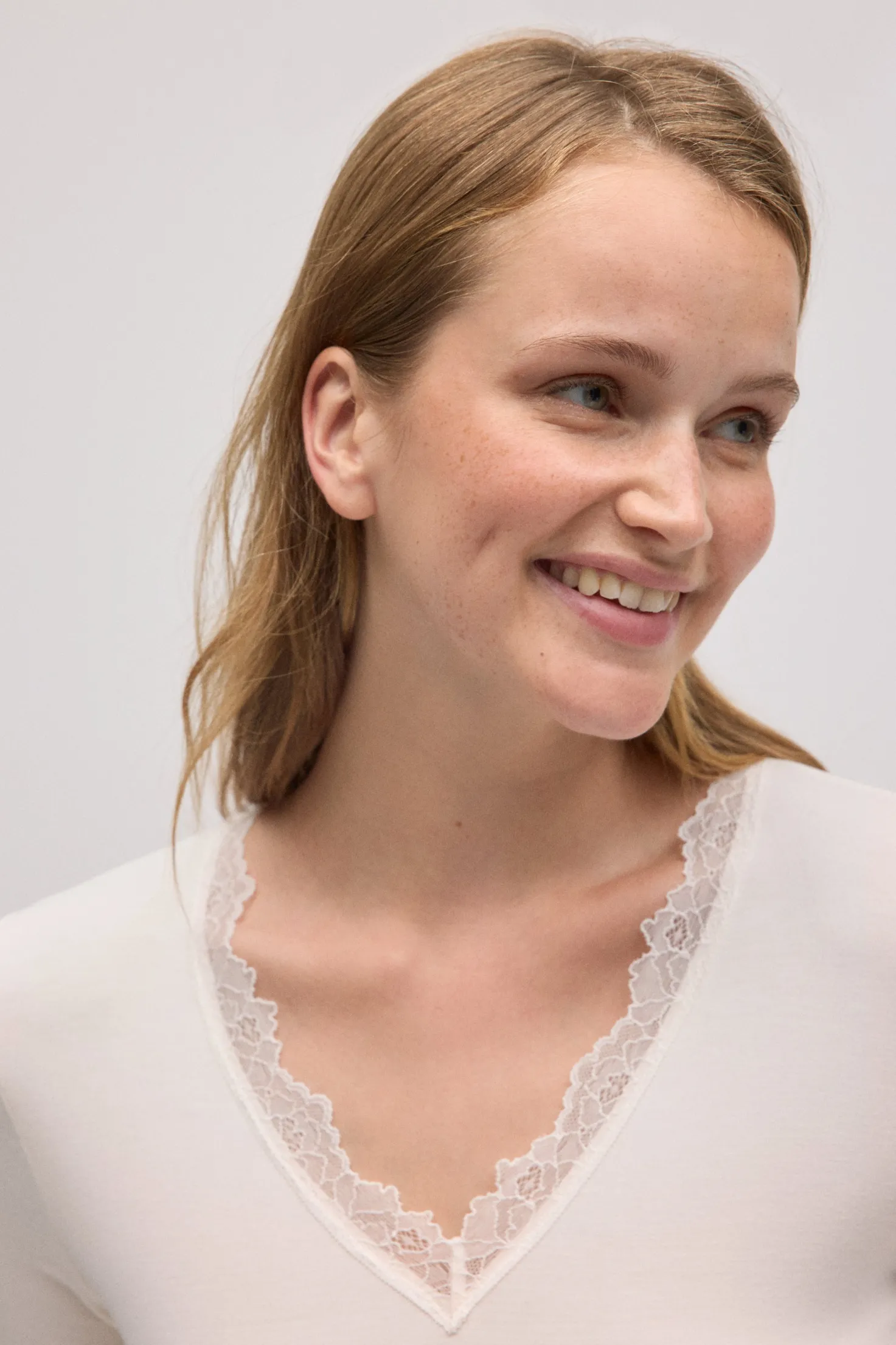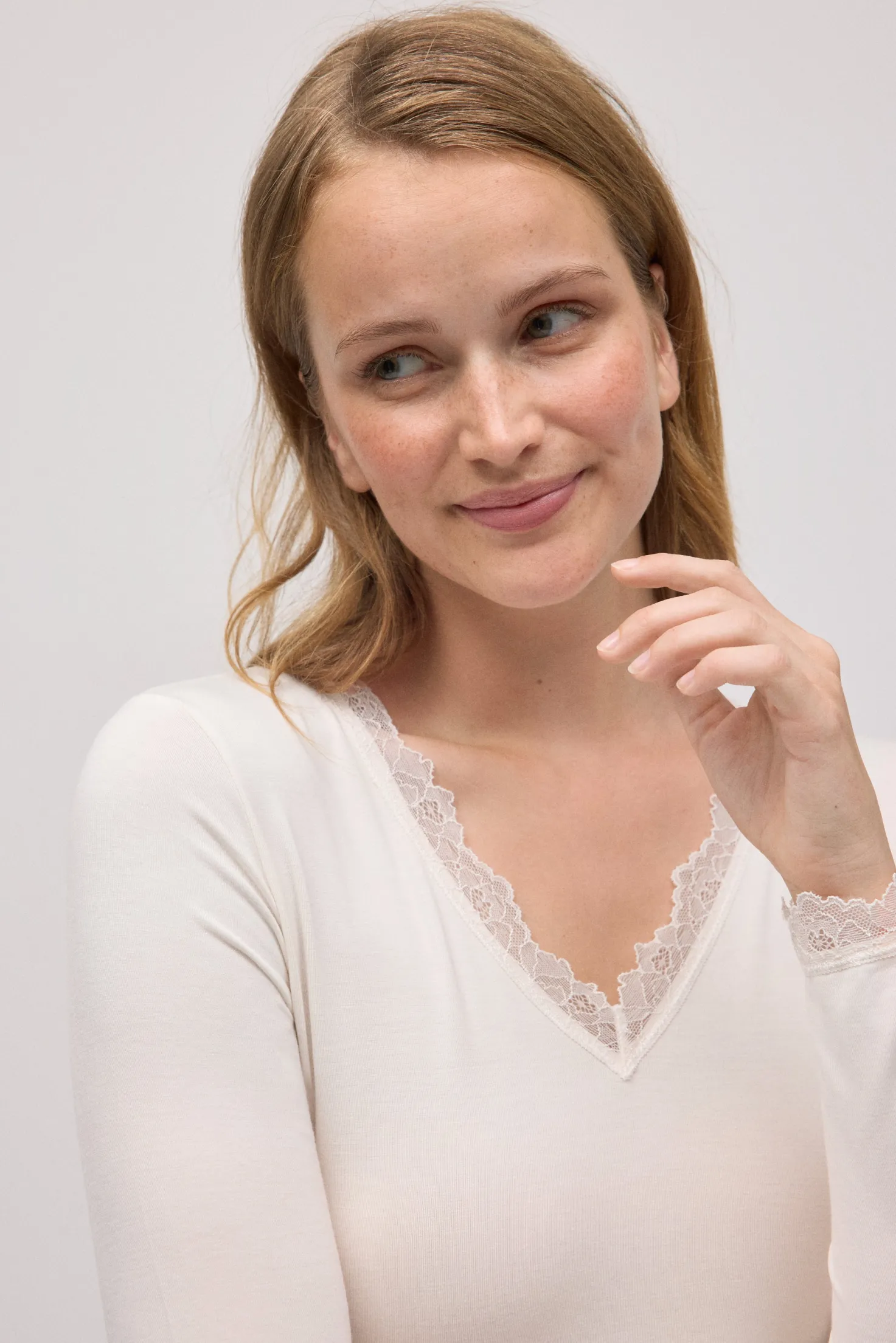 Camiseta ligera y extremadamente suave, con escote en pico con detalle de encaje, diseñada para ofrecer una sensación de confort absoluto durante todo el día.