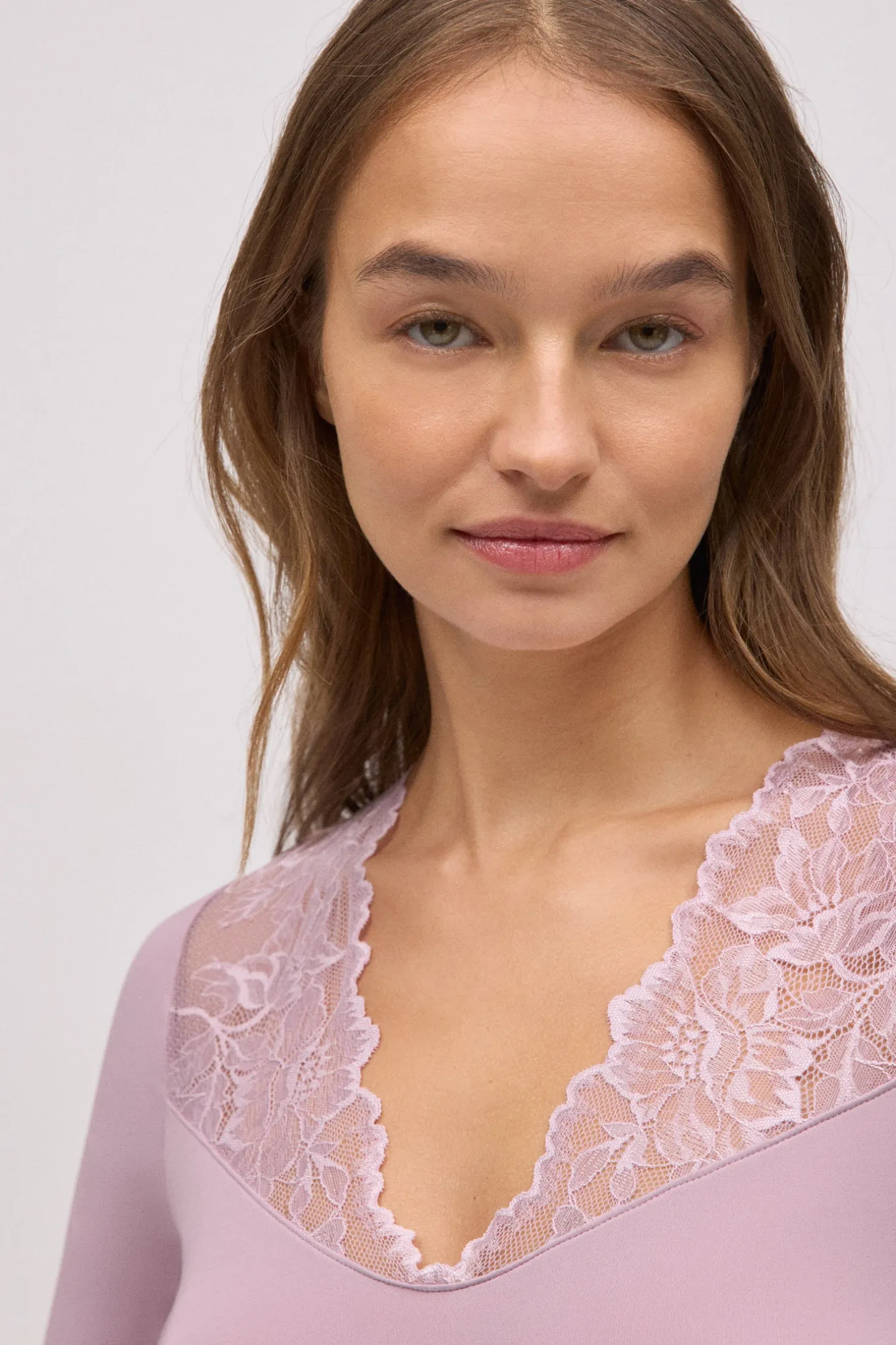 Camiseta de manga larga elástica con diseño que combina comodidad y sofisticación. El escote en V se realza con un delicado encaje floral semitransparente, aportando un toque sensual sin perder elegancia. Ideal como prenda interior especial o para looks exteriores con estilo.