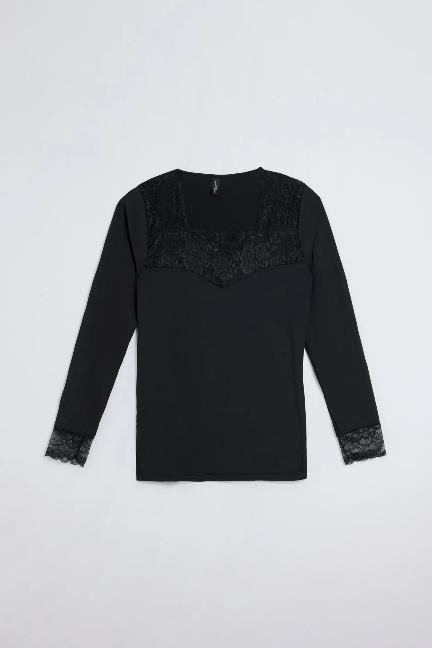 Camiseta de manga larga de microfibra con encaje delicado negra