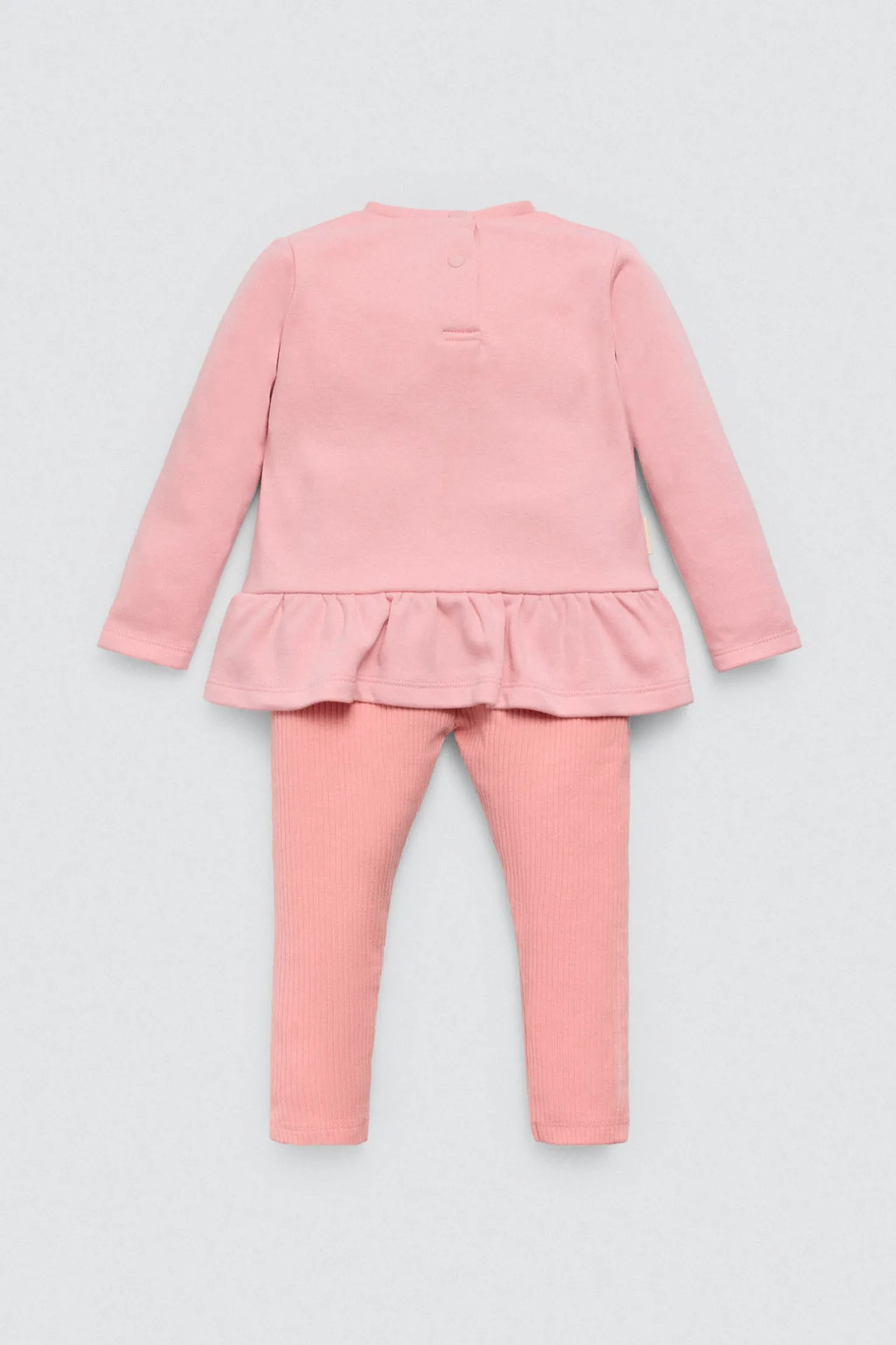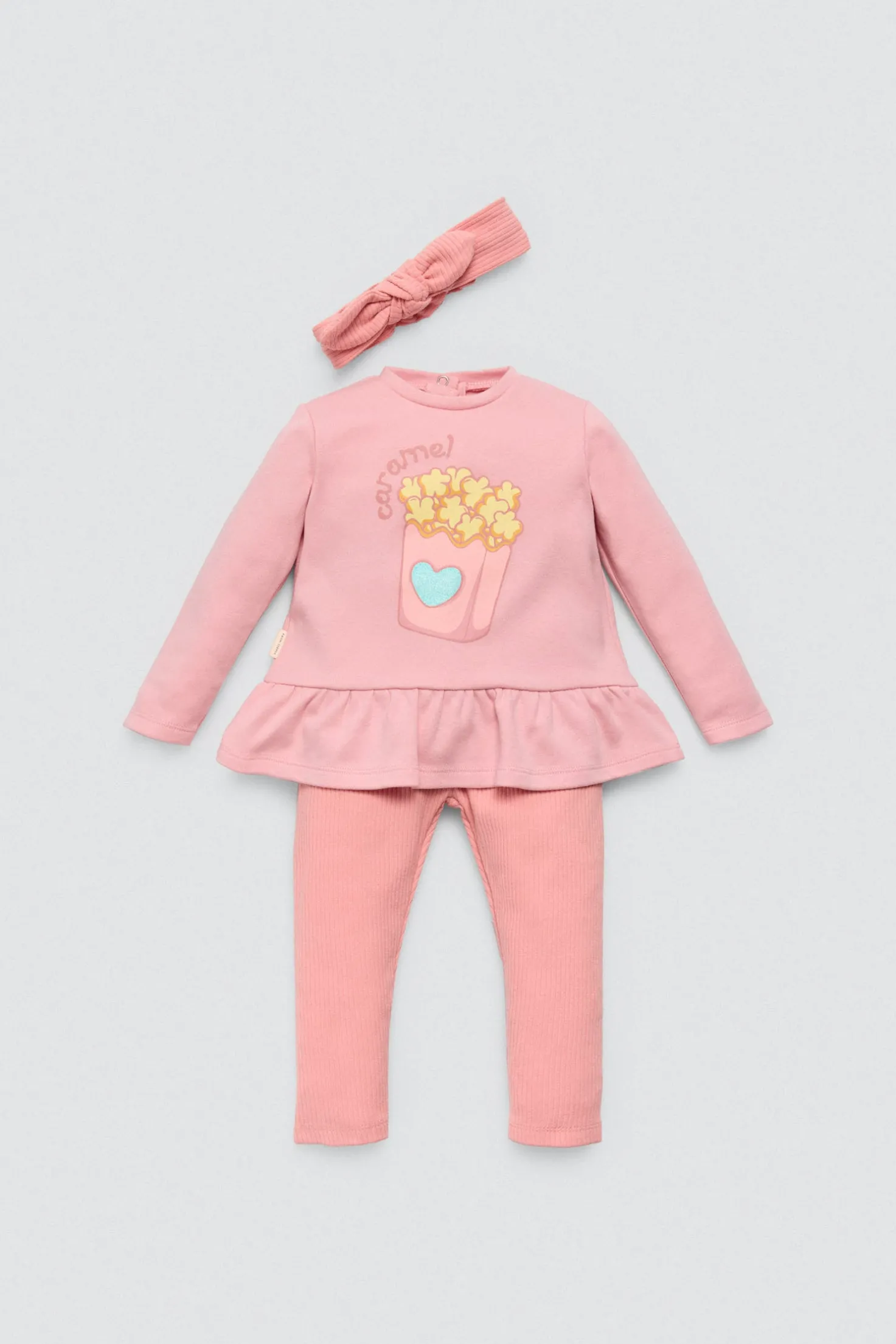 Set de bebé compuesto por camiseta, pantalón y bandan. Interior afelpado. Diseño de la colección Candy Circus en tono rosa pastel con detalles dulces. Algodón natural, ideal para regalar o para los primeros meses.