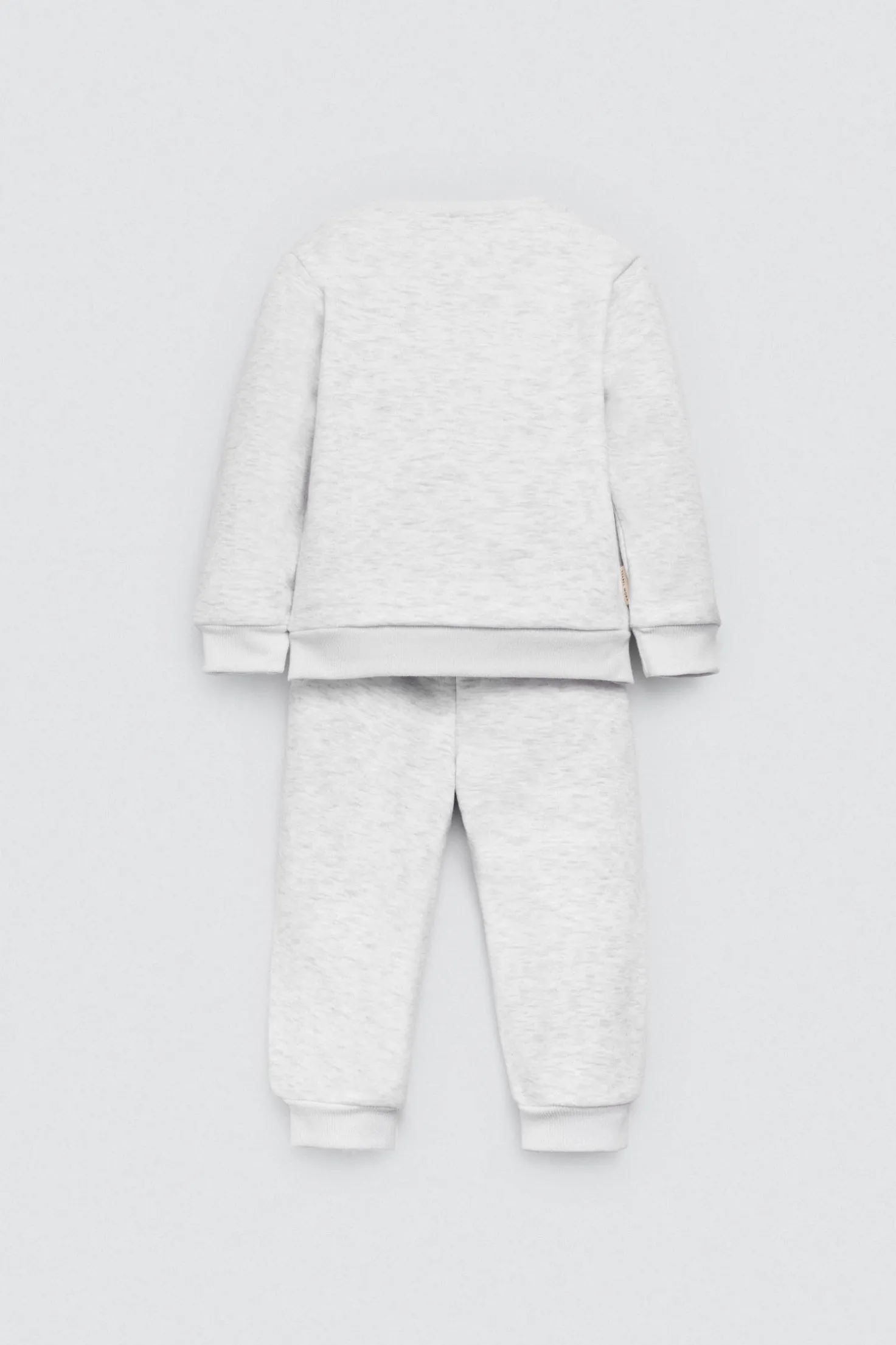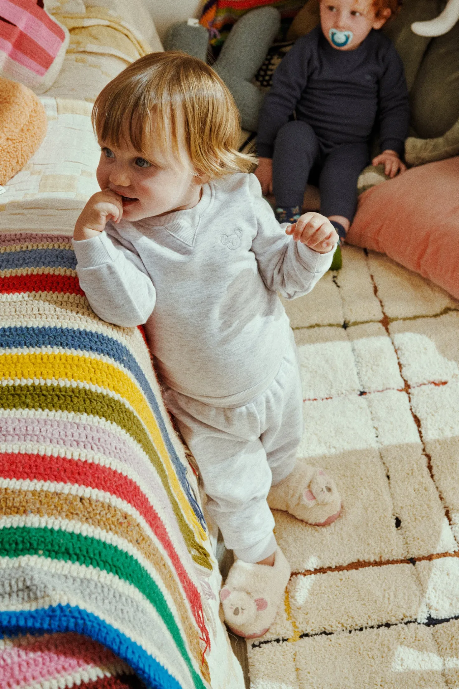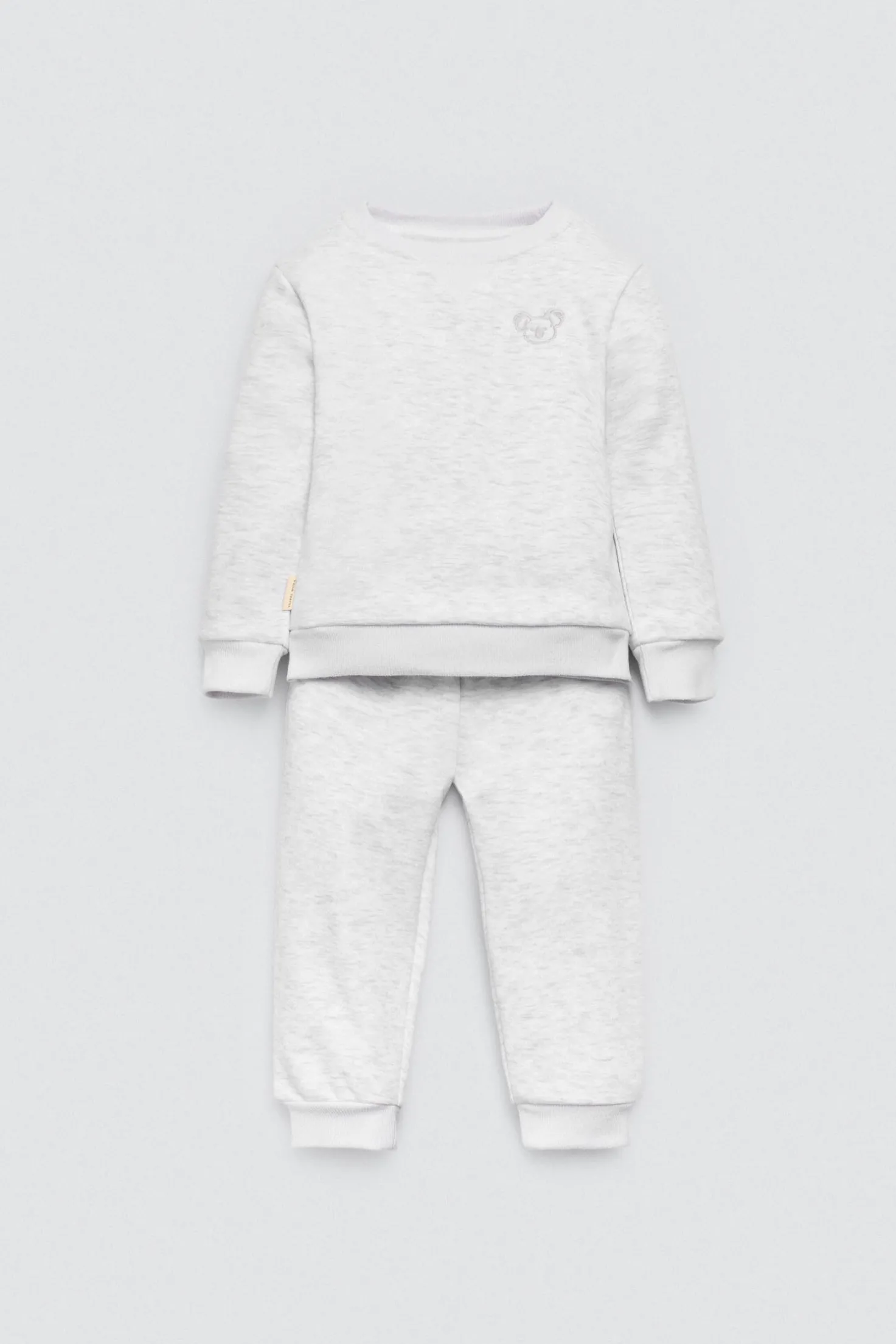 Conjunto de chándal básico para bebé ideal para el día a día. Compuesto por una sudadera de manga larga y un pantalón jogger con interior afelpado, ofrece máxima suavidad y libertad de movimiento. Su diseño delicado con detalle bordado lo convierte en una prenda práctica y adorable para cualquier ocasión.