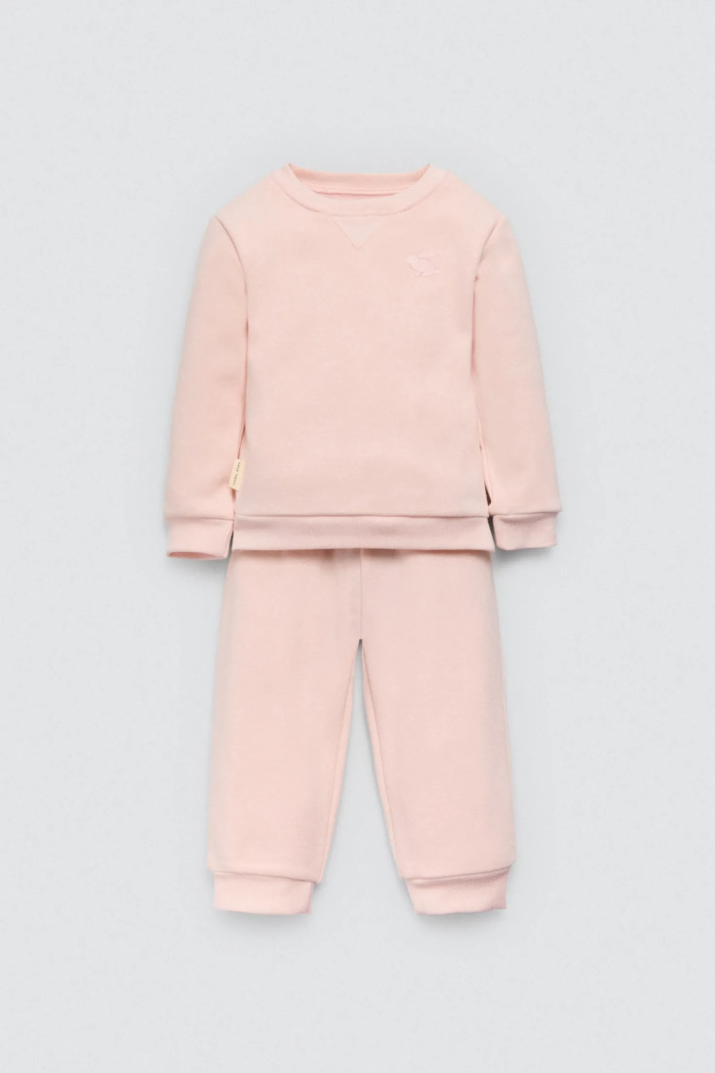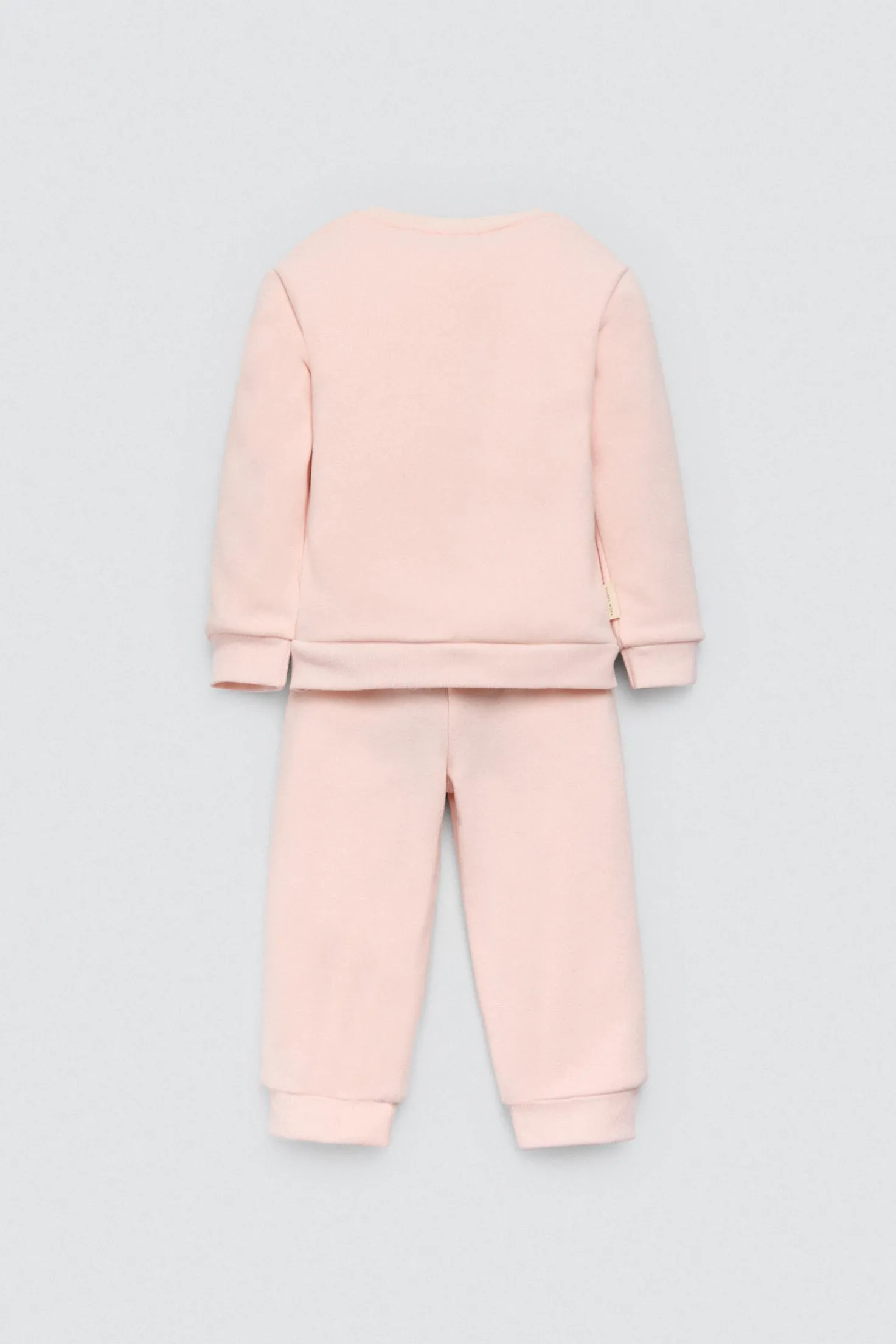 Conjunto de chándal básico para bebé ideal para el día a día. Compuesto por una sudadera de manga larga y un pantalón jogger con interior afelpado, ofrece máxima suavidad y libertad de movimiento. Su diseño delicado con detalle bordado lo convierte en una prenda práctica y adorable para cualquier ocasión.