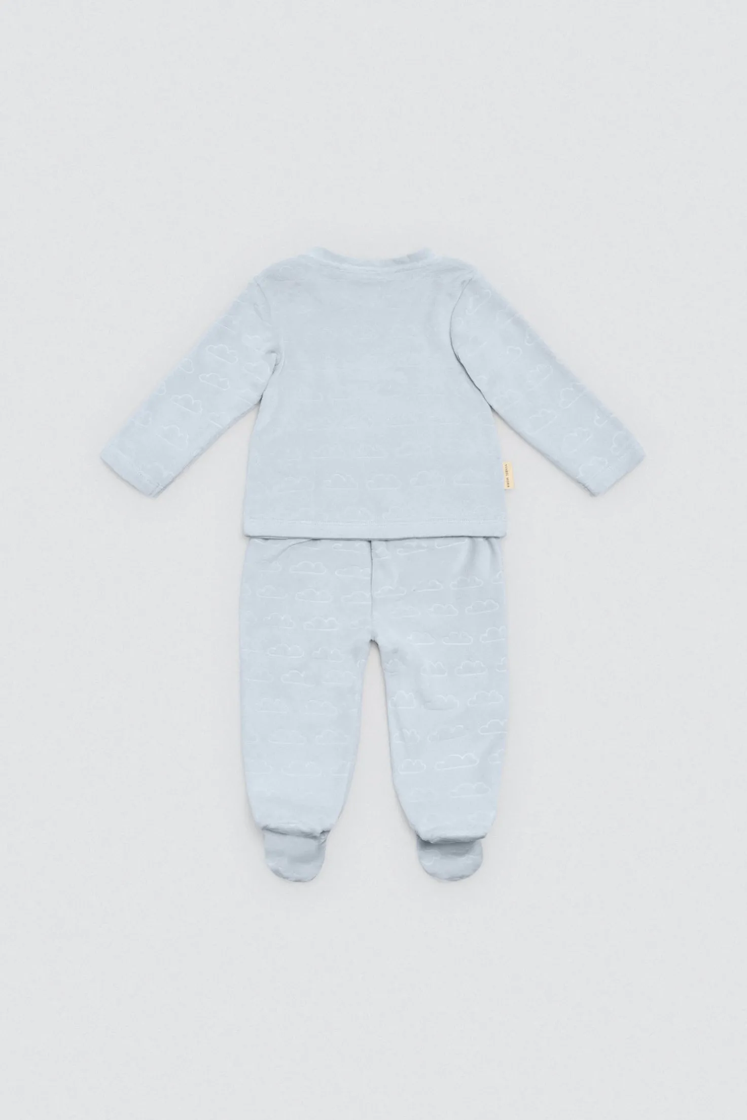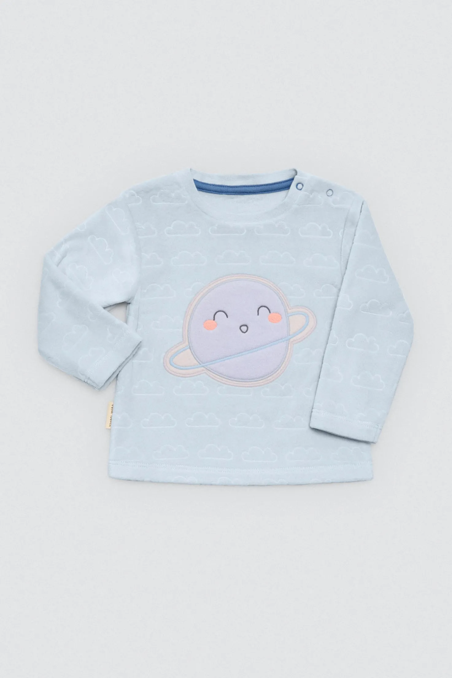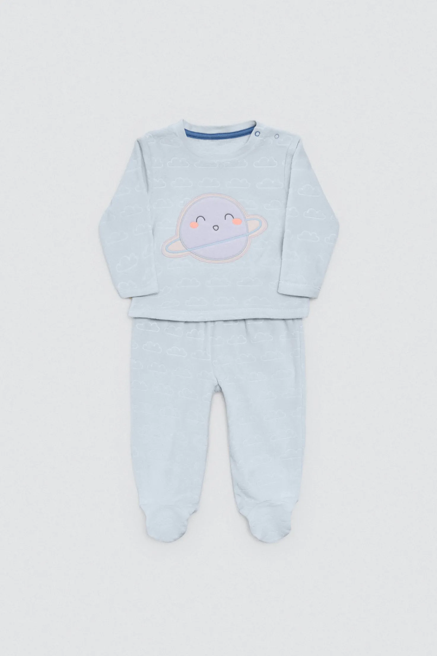 Conjunto de bebé para invierno compuesto por camiseta de manga larga y polaina con interior afelpado. Estampado de planetas y estrellas.
