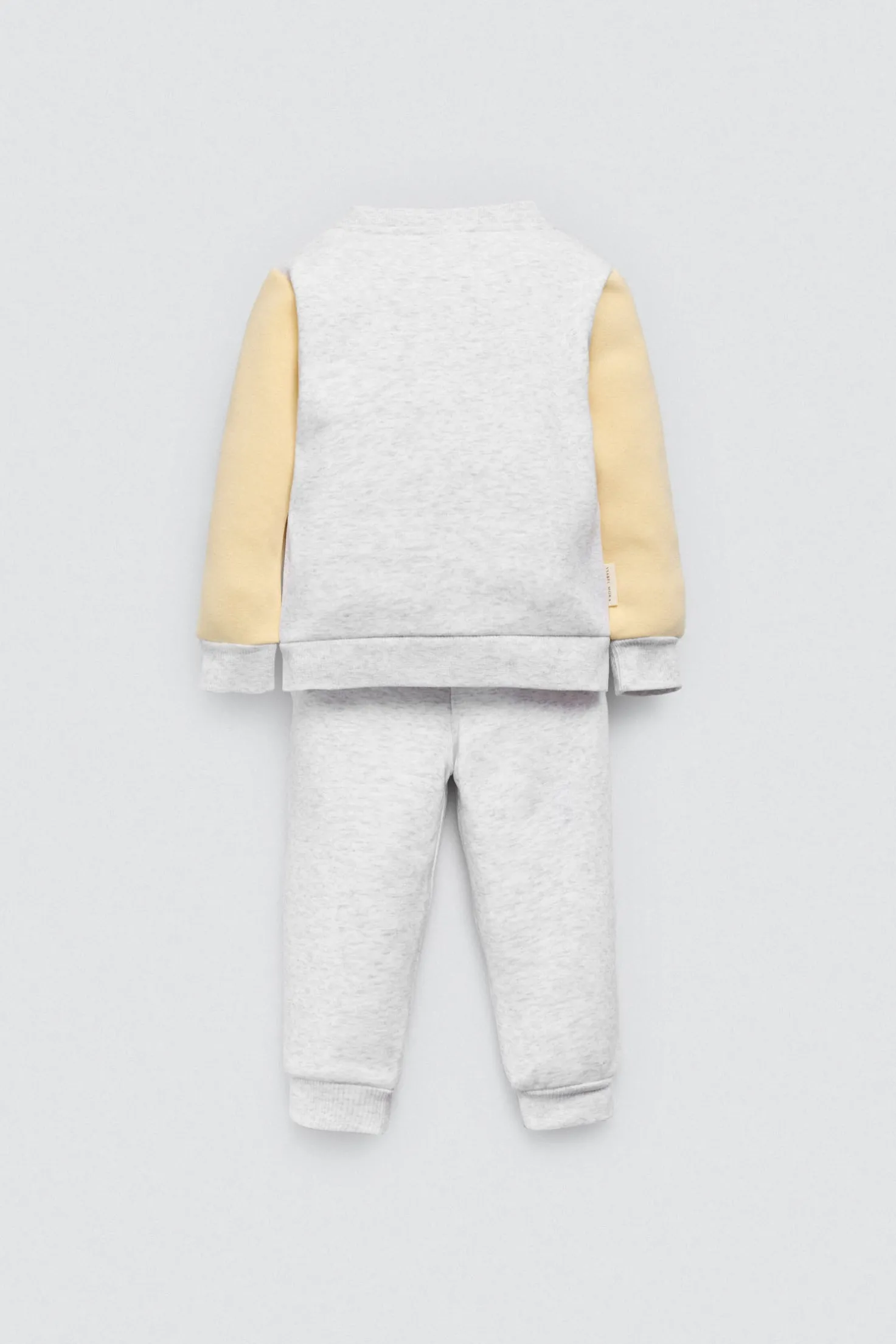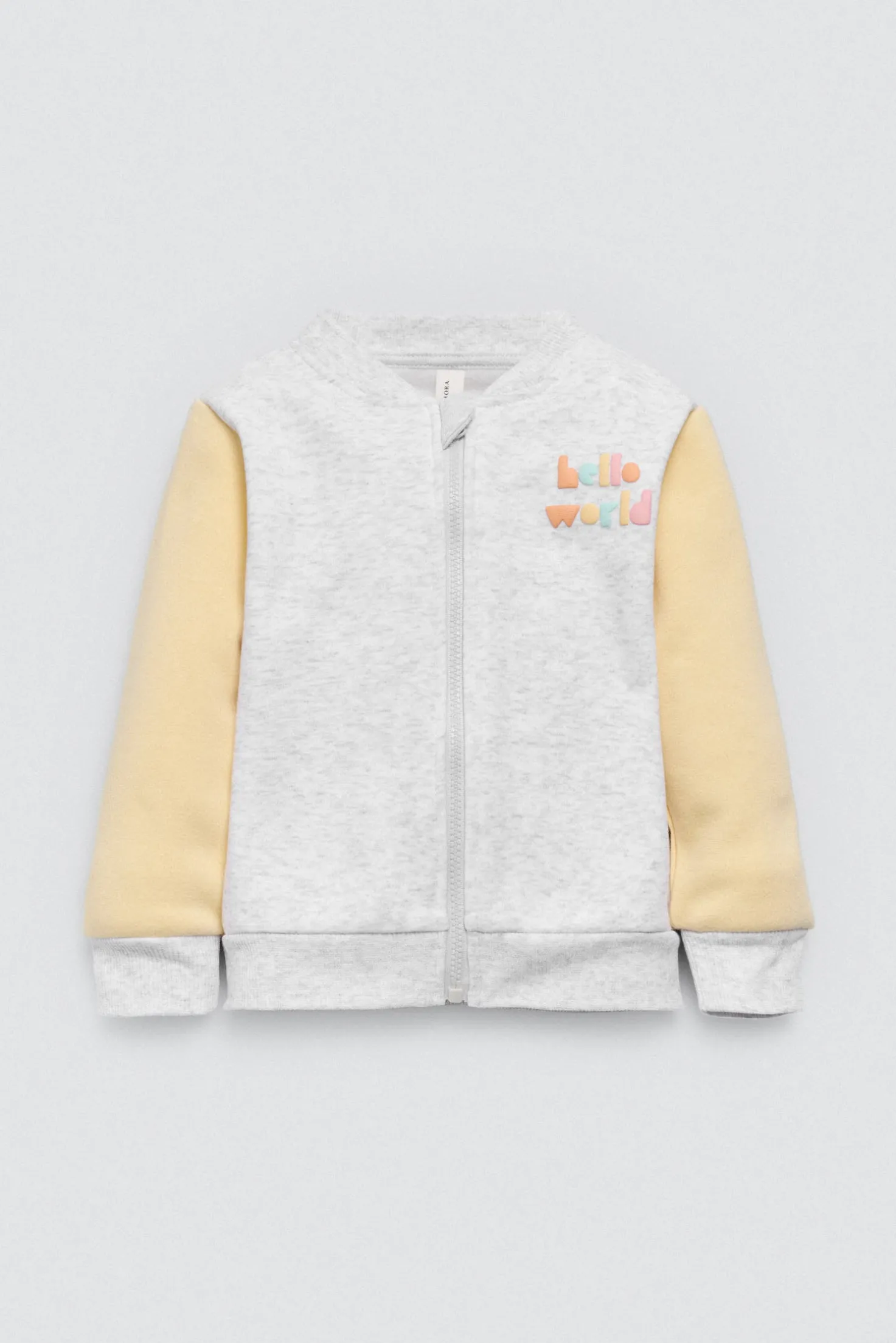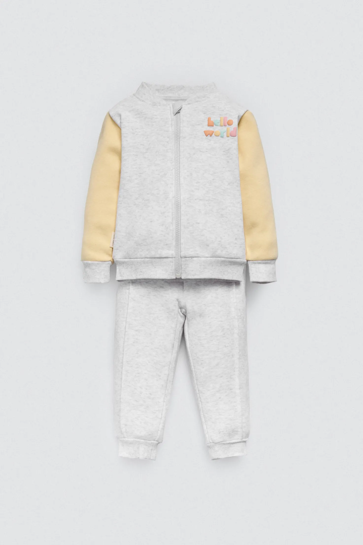 Conjunto de bebé estilo chándal en gris claro con chaqueta de cremallera y pantalón jogger a juego. Tejido afelpado y cómodo, ideal para entretiempo e invierno. Diseño neutro con mensaje Hello World para un look moderno y tierno. Unisex.