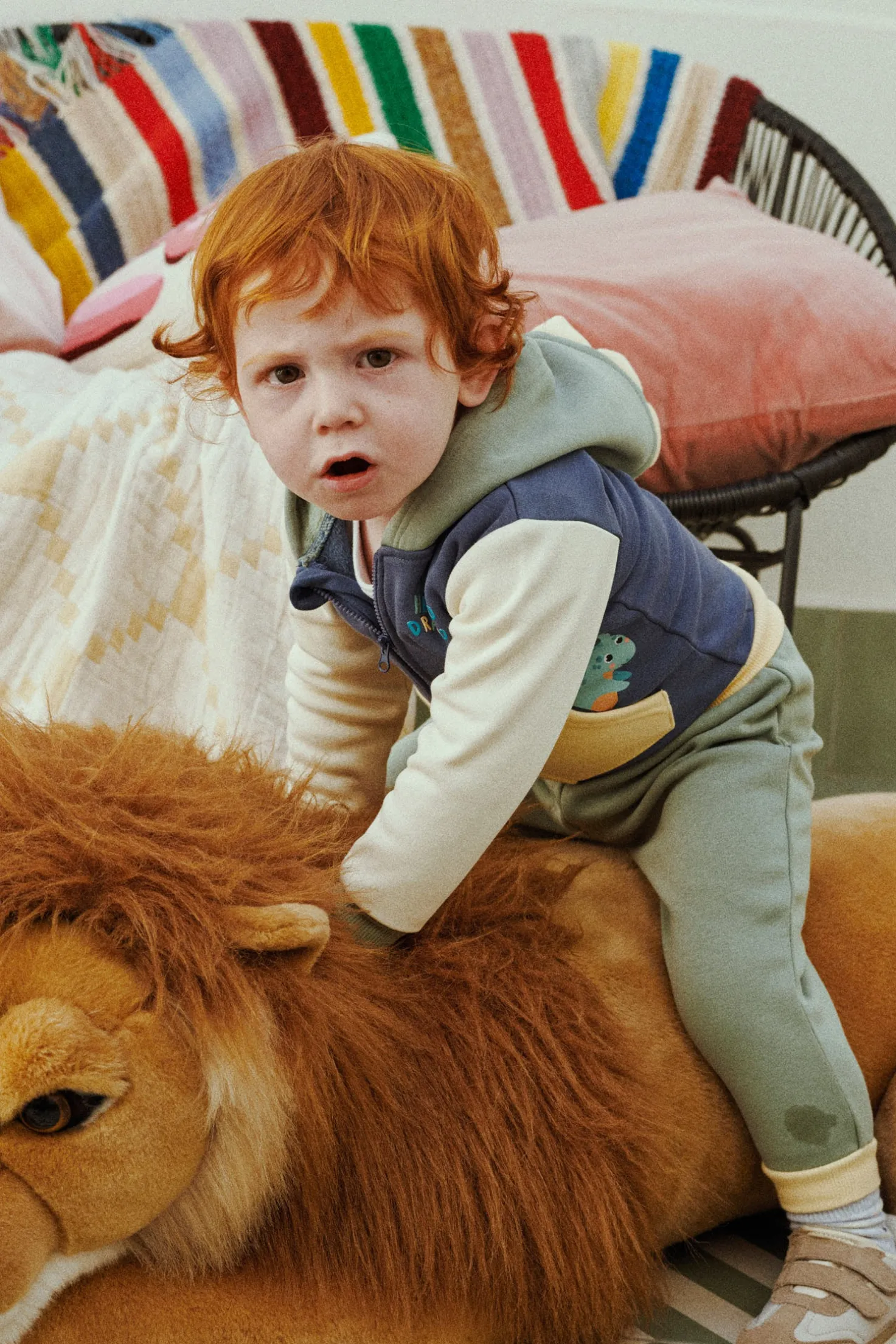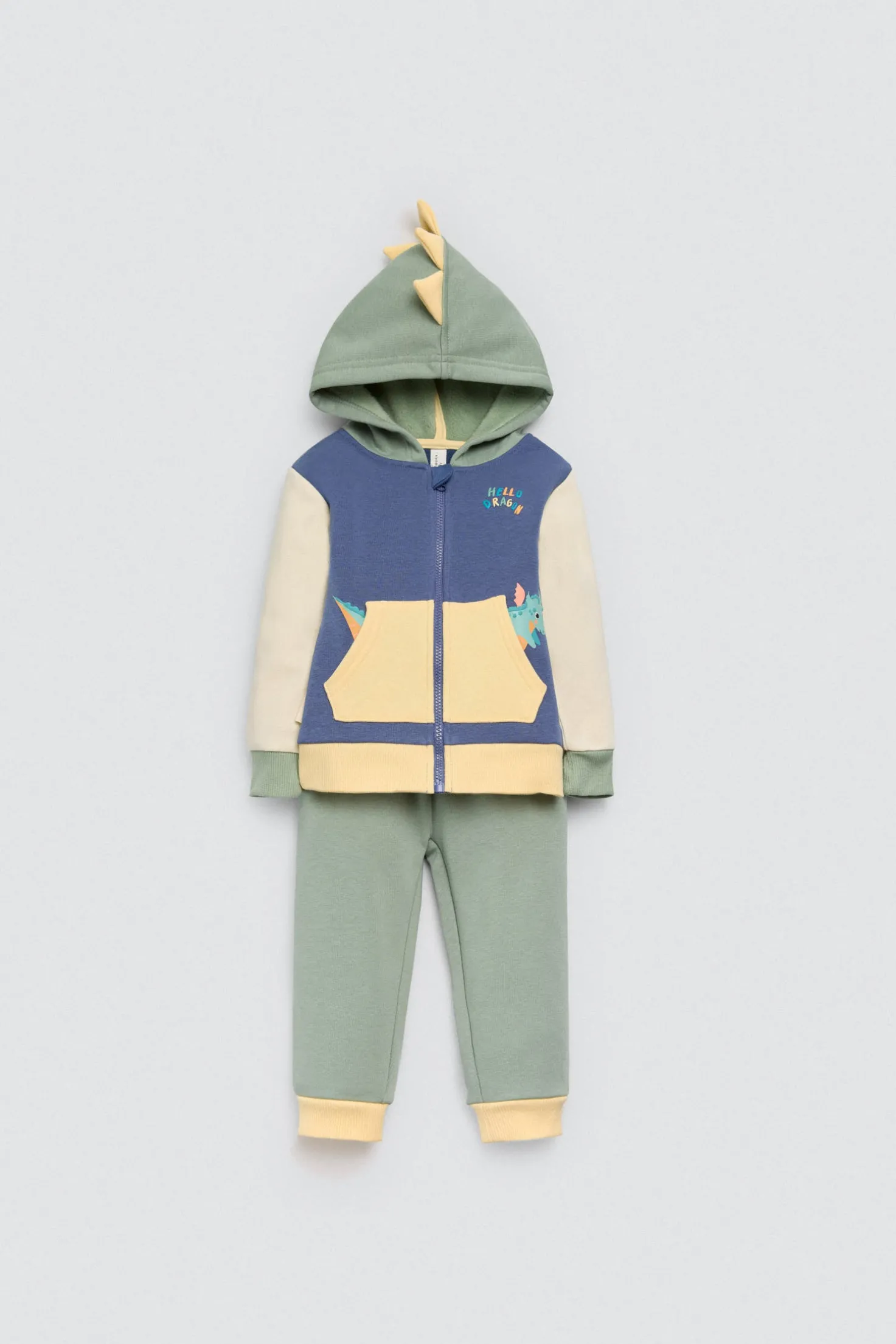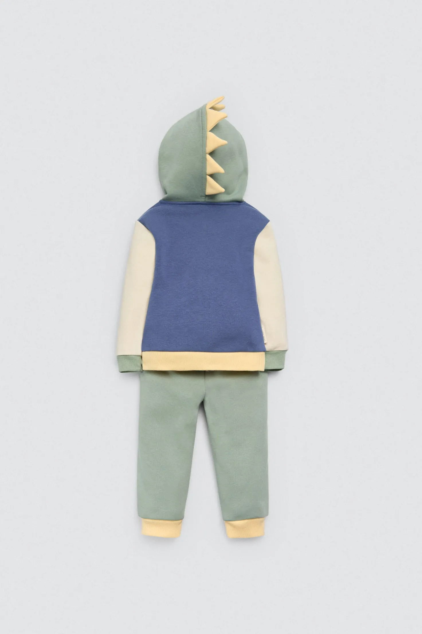 Conjunto de bebé con chaqueta de cremallera y pantalón largo afelpado. Estampado divertido de dinosaurios. Ideal para días de frío y perfecto para vestir y desvestir fácilmente.