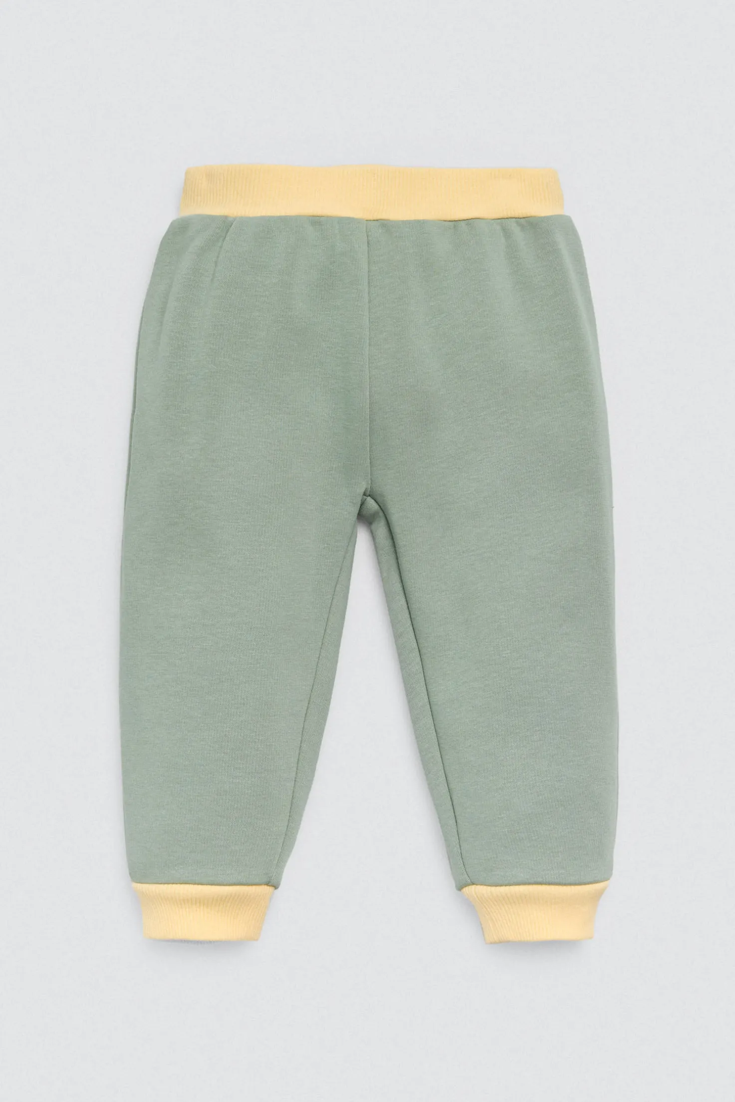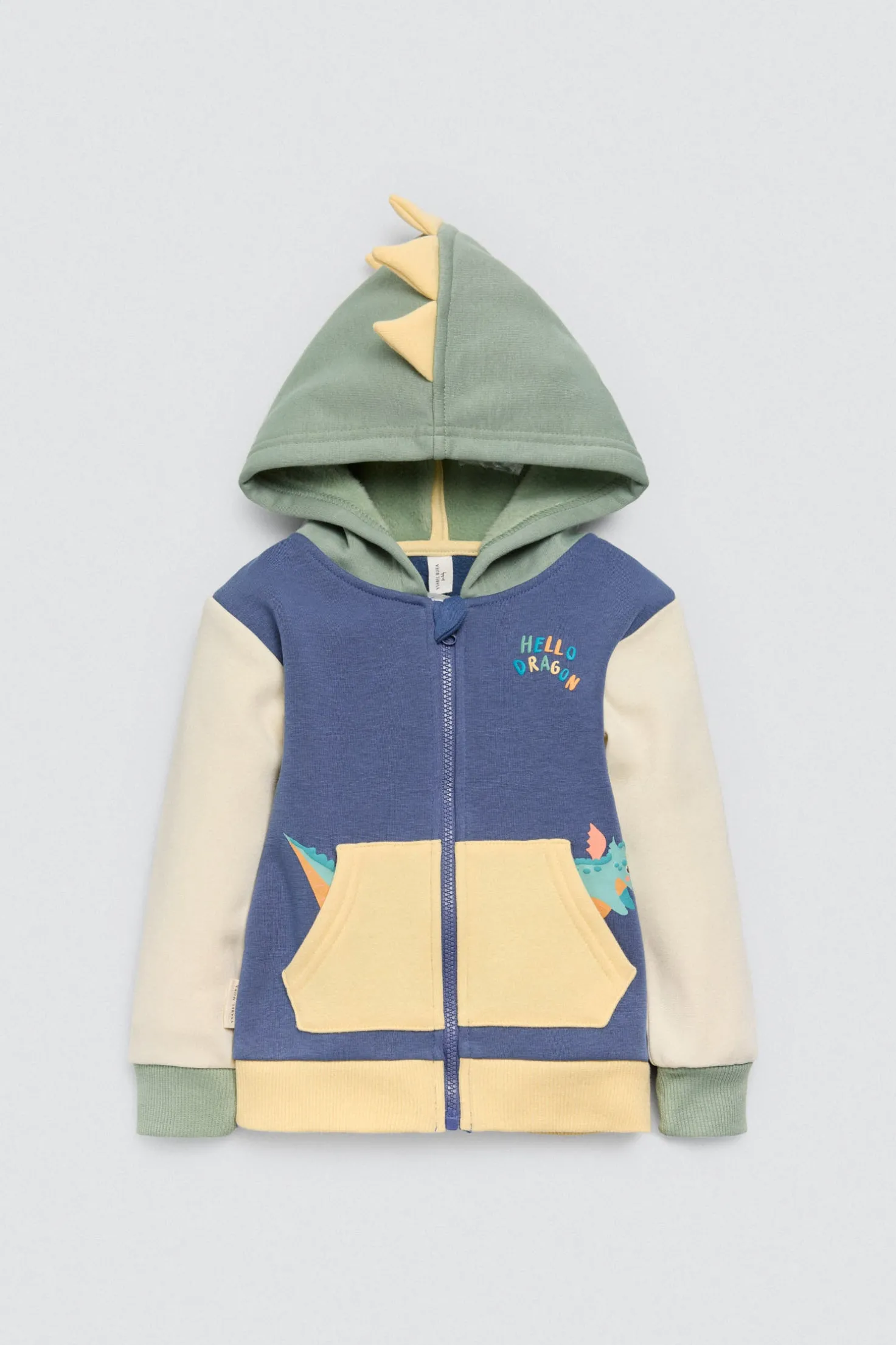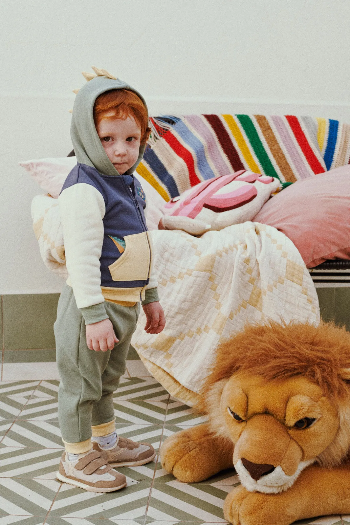 Conjunto de bebé con chaqueta de cremallera y pantalón largo afelpado. Estampado divertido de dinosaurios. Ideal para días de frío y perfecto para vestir y desvestir fácilmente.