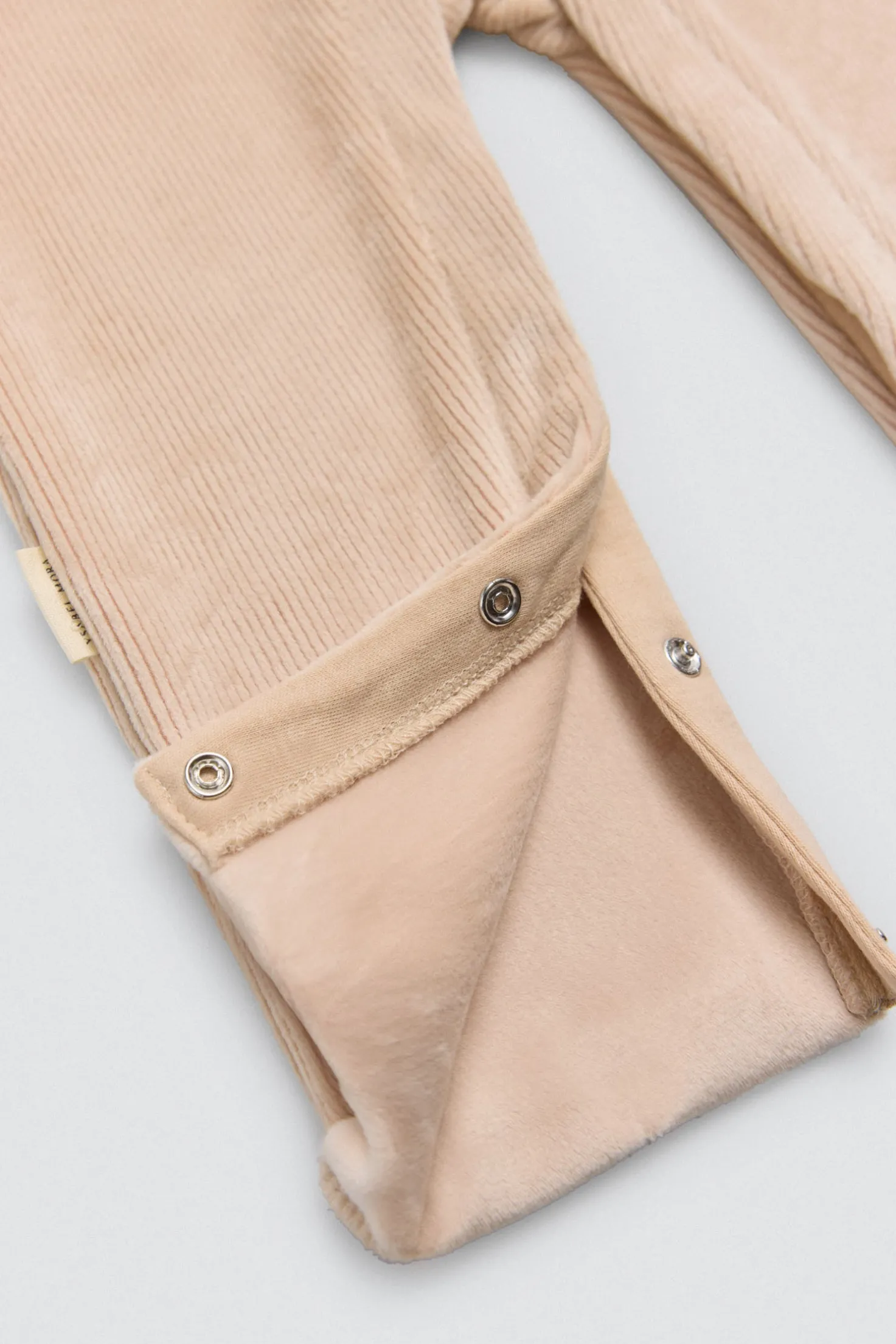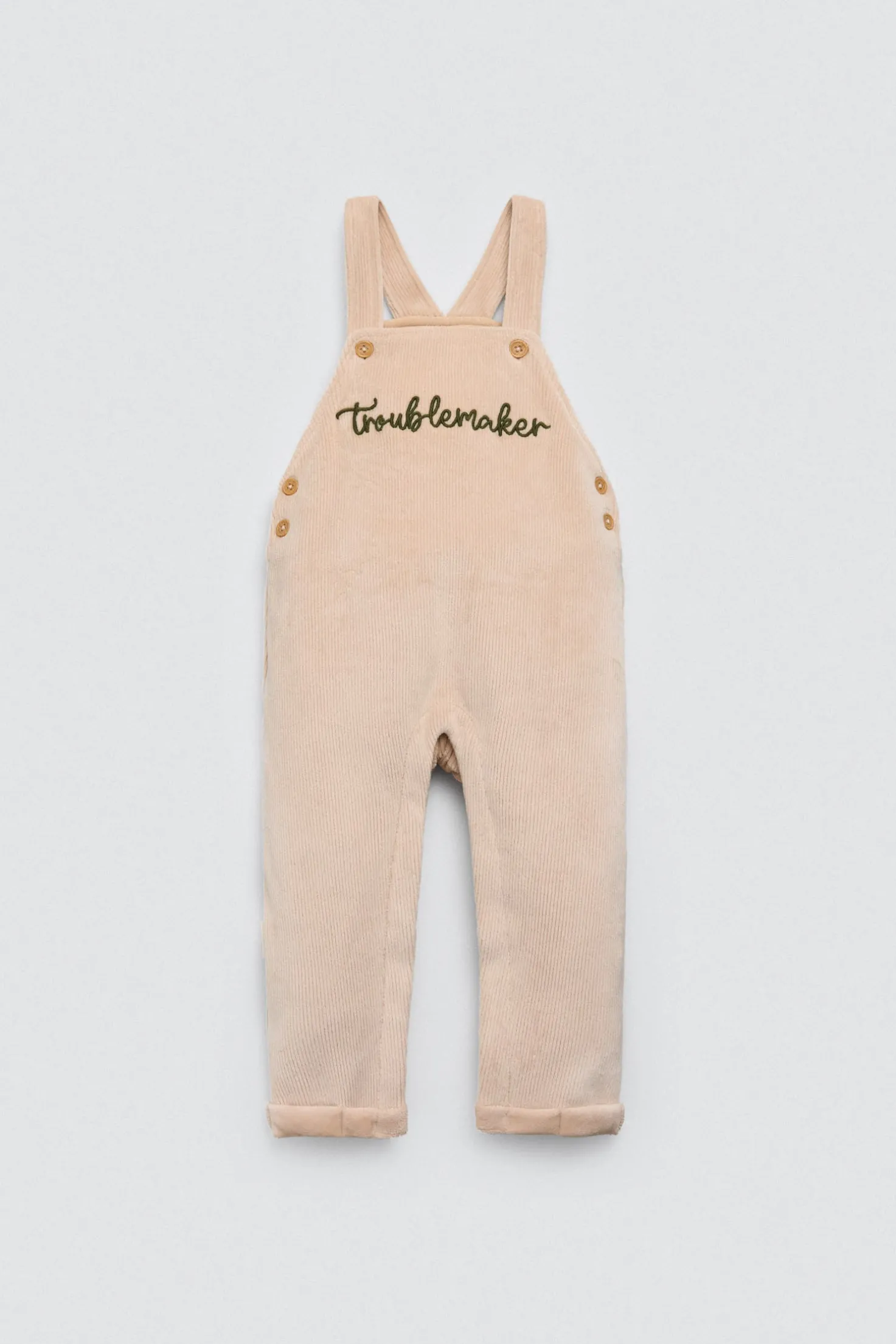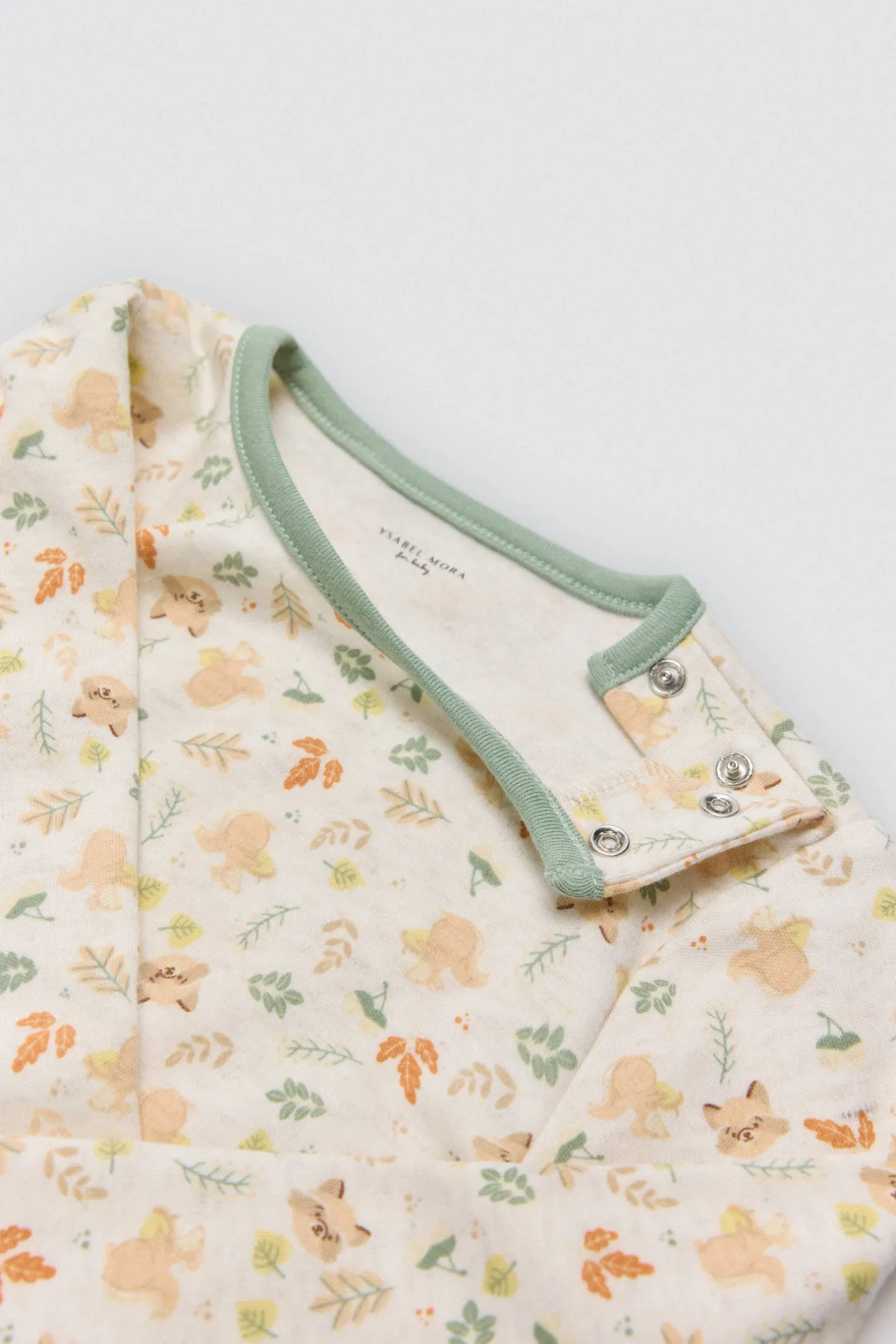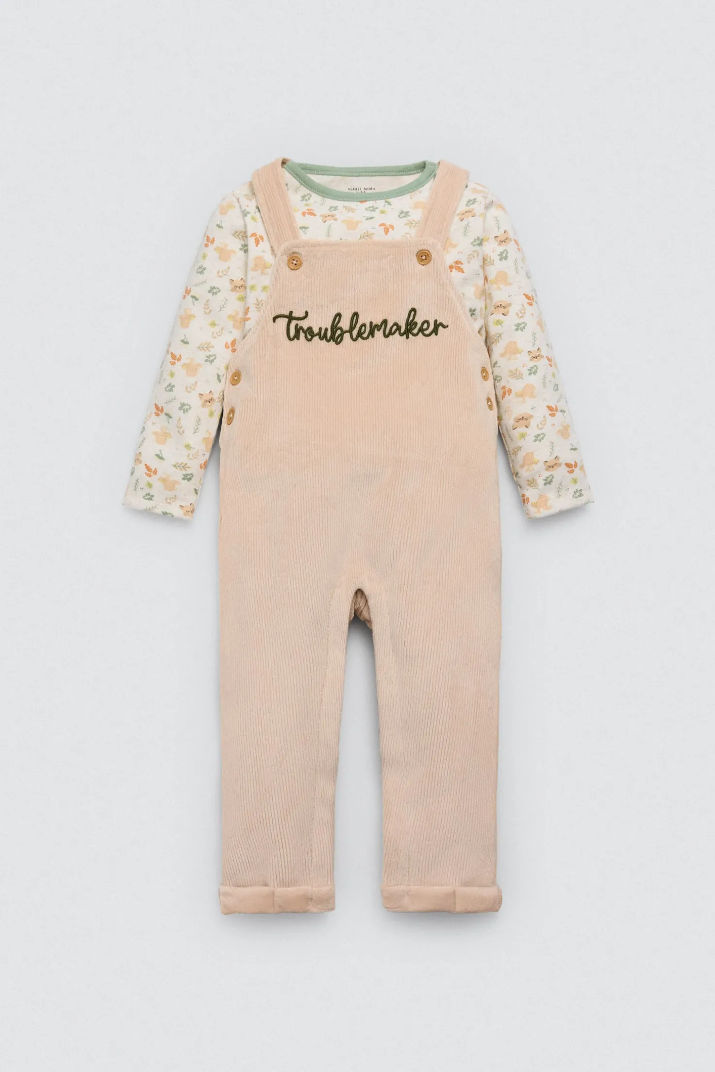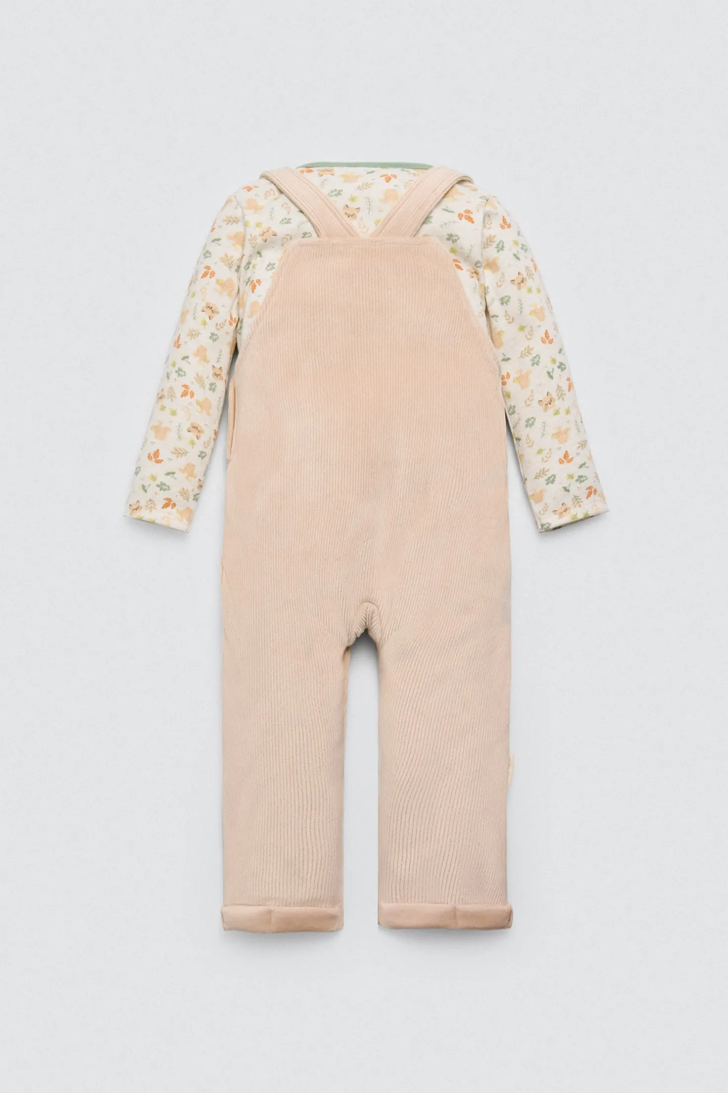 Conjunto de 2 piezas para bebé confeccionado en algodón natural. Incluye camiseta de manga larga con estampado otoñal y peto largo con interior afelpado. Un look cálido y dulce para los días frescos de otoño.