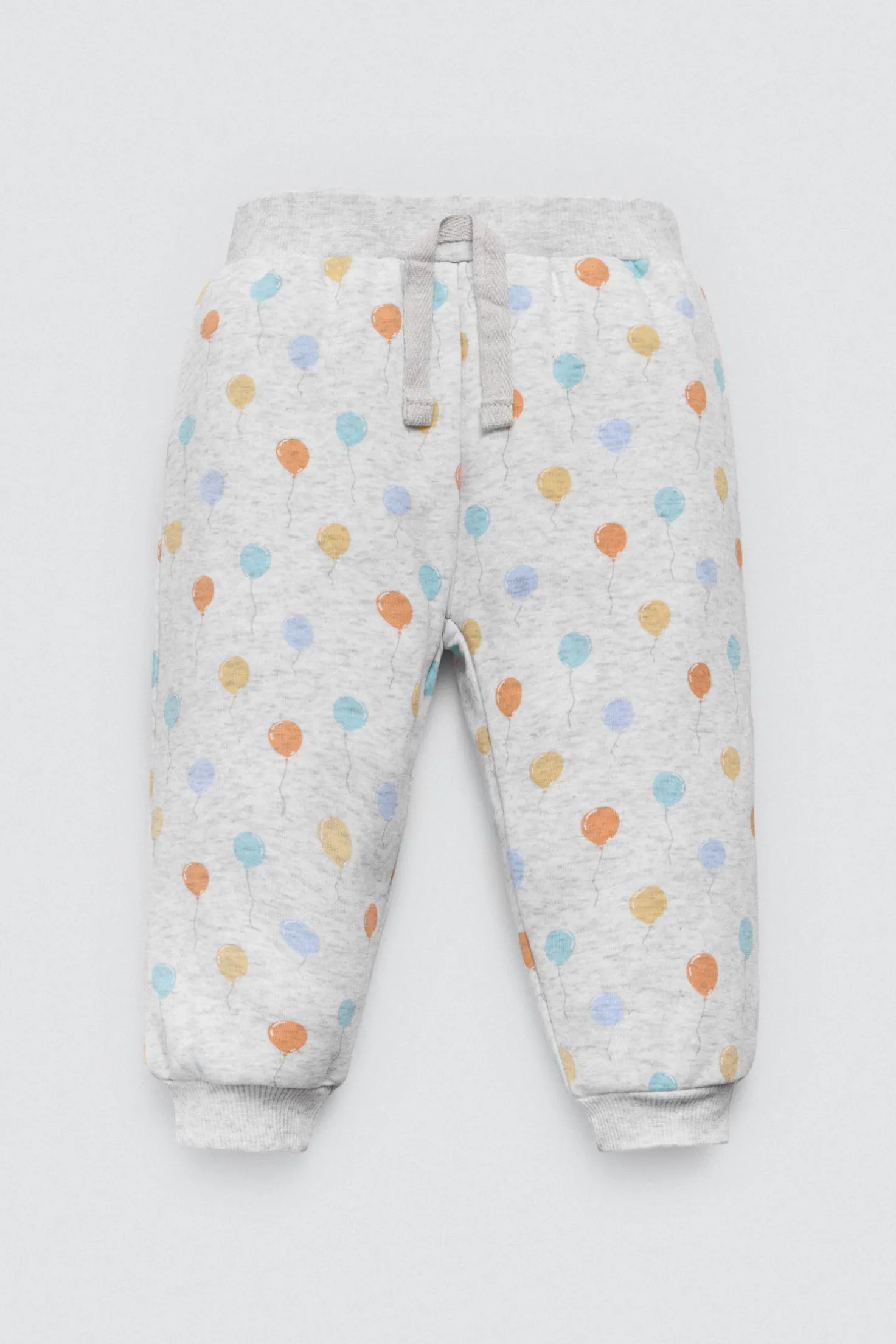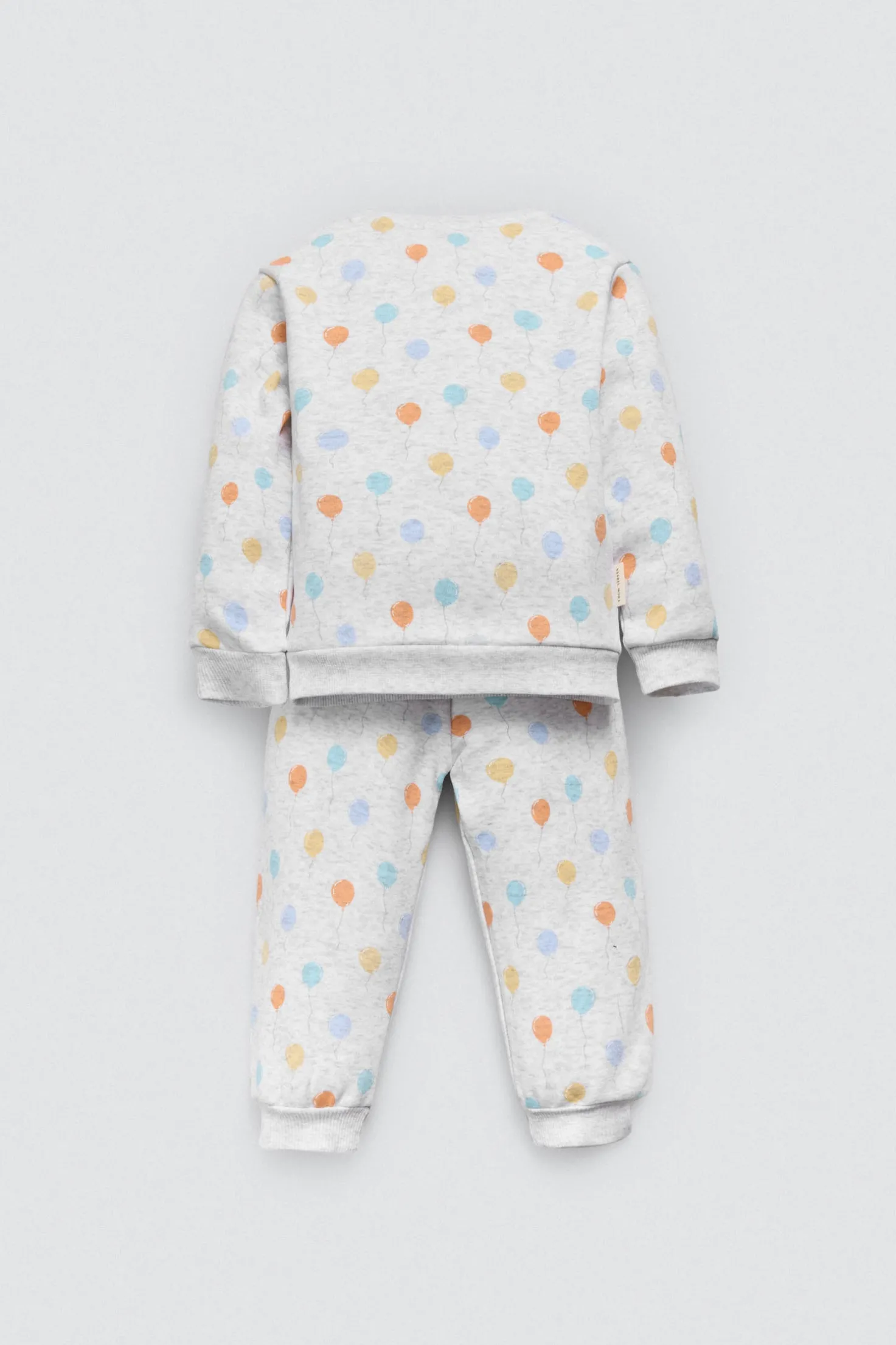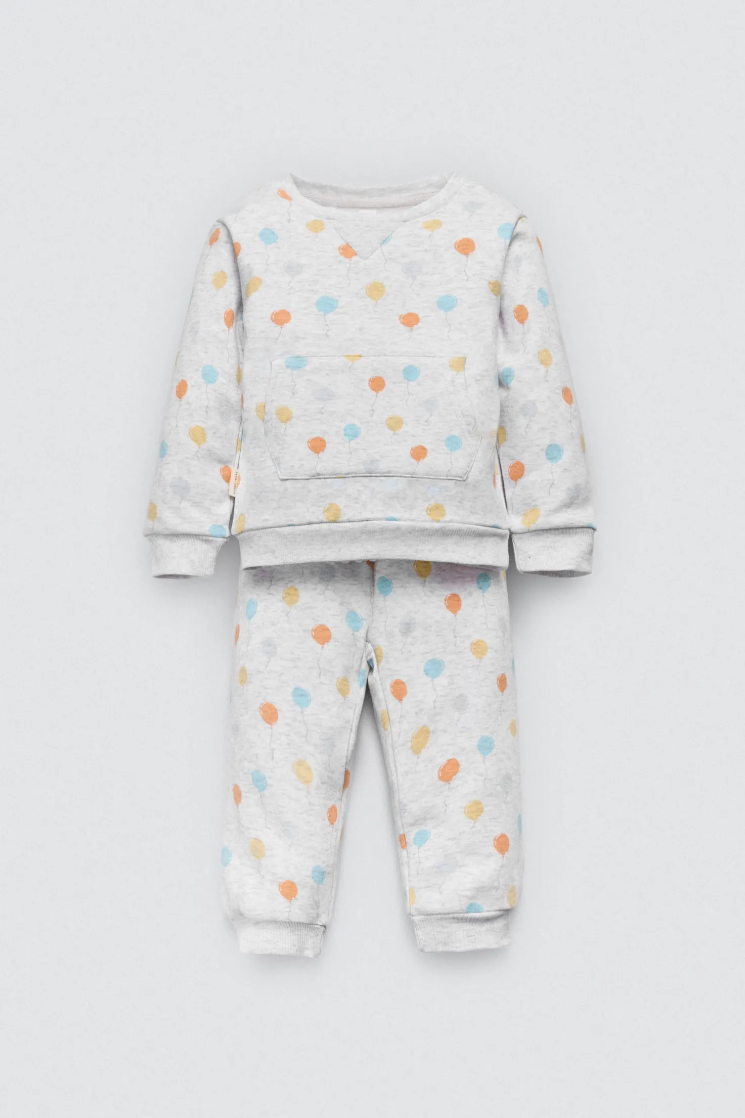 Chándal de bebé. Sudadera de manga larga estampada con globos y bolsillo canguro. Pantalón largo con cinturilla elástica ajustable. Interior afelpado que aporta calor sin perder libertad de movimiento. Ideal para jugar y explorar.
