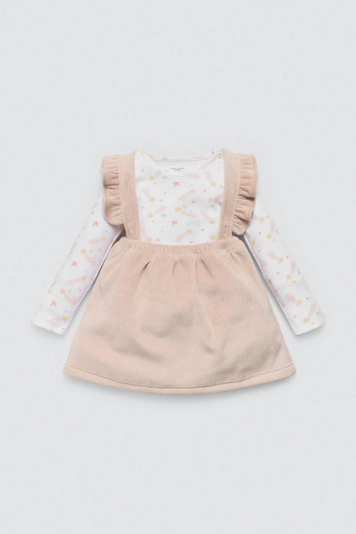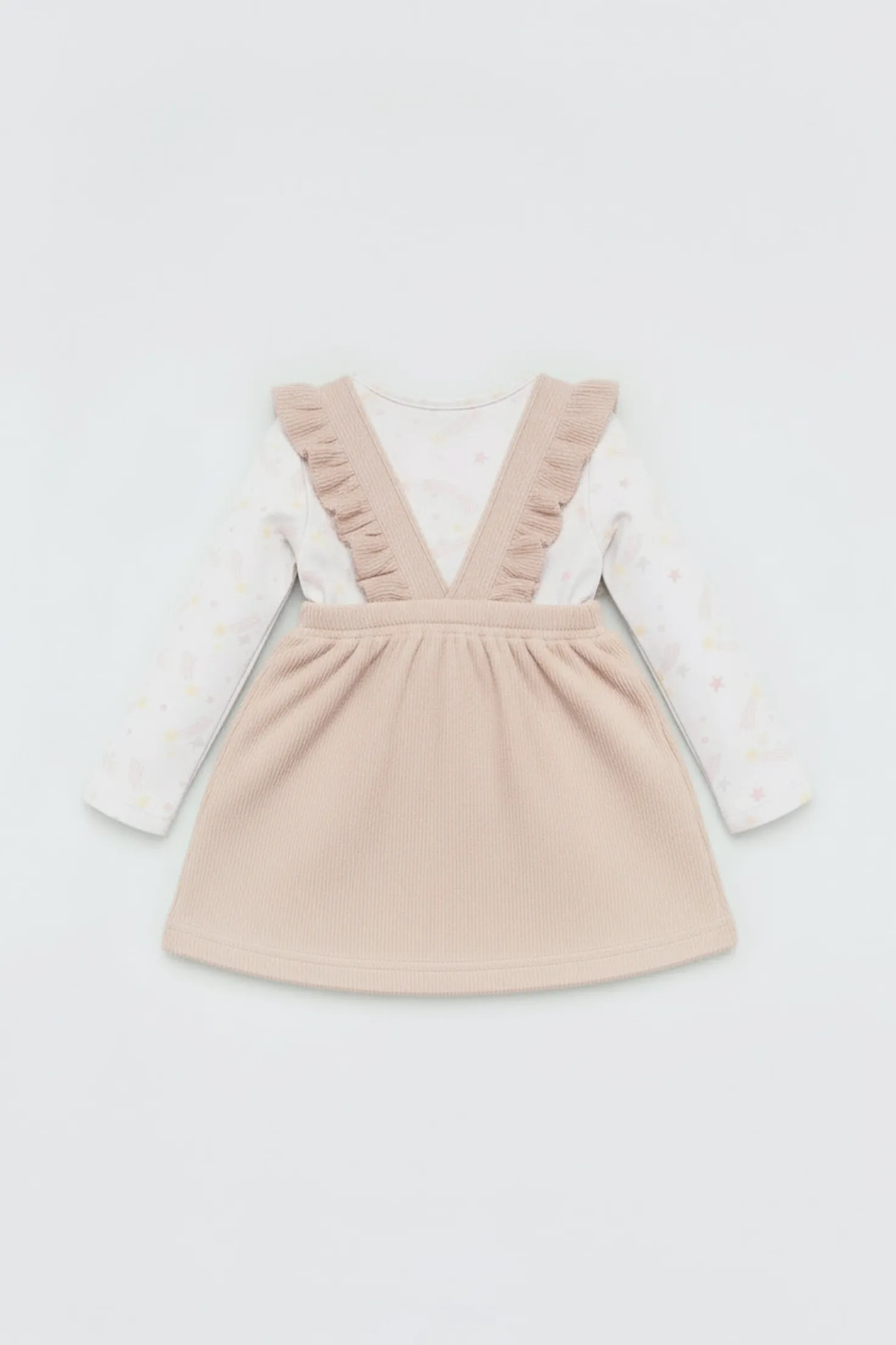 Set de bebé compuesto por camiseta de manga larga estampada y vestido peto con interior afelpado. Inspirado en el universo Fairy Tale, combina dulzura y calidez en un conjunto perfecto para el invierno.
