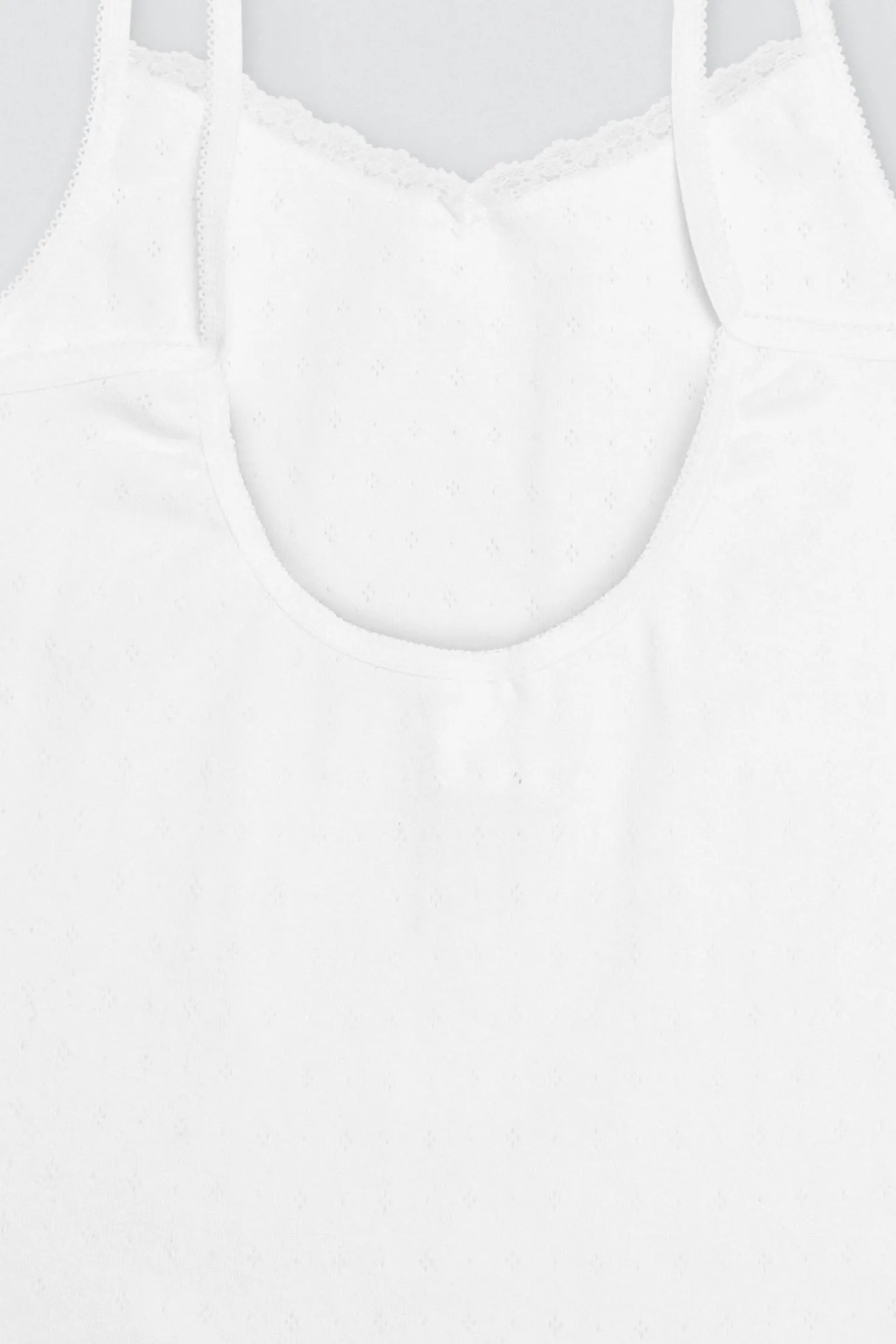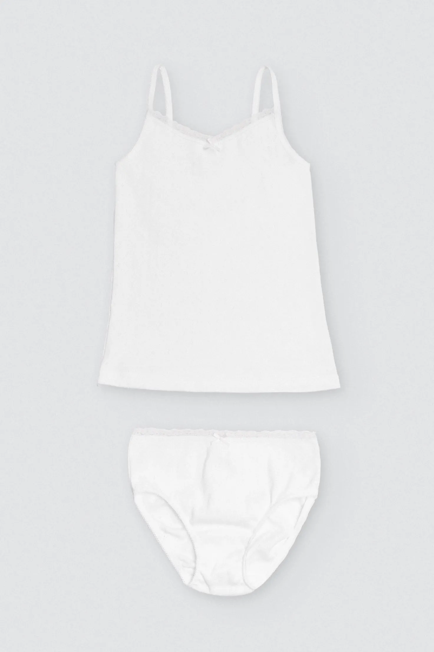 Conjunto infantil de ceremonia compuesto por una camiseta con tirantes finos y una braguita de algodón natural calado .Es un conjunto de vestir para niñas suave, cómodo y elegante. La camiseta tiene una espalda baja y cuenta con un detalle de una blonda de encaje en la parte superior con lazo en el centro. Ideal para eventos. Color blanco.
