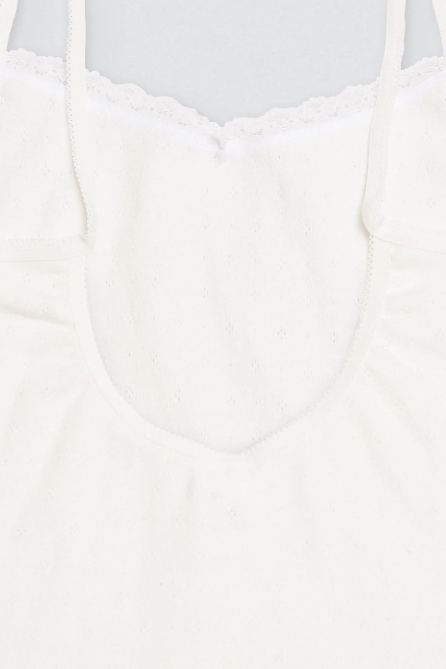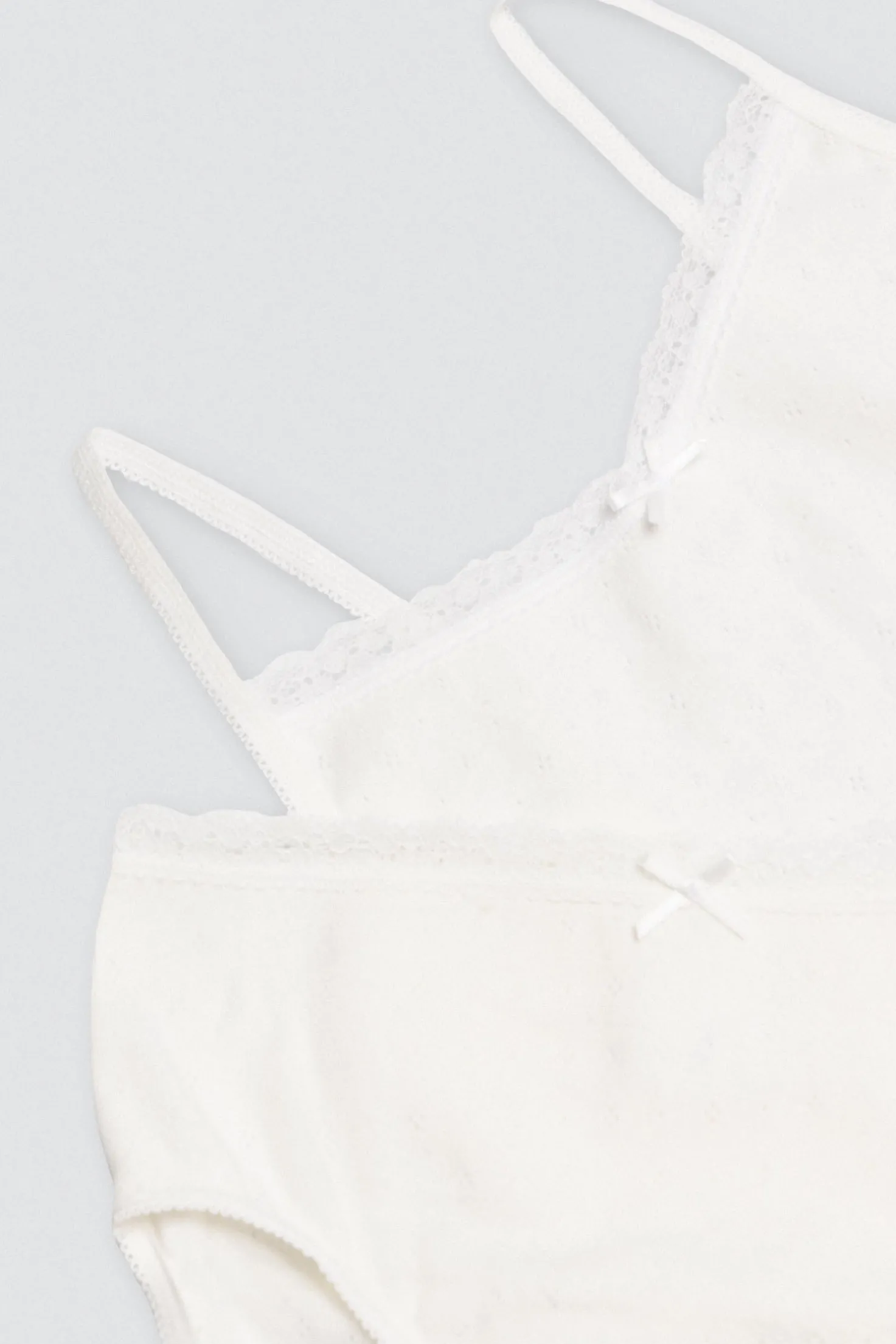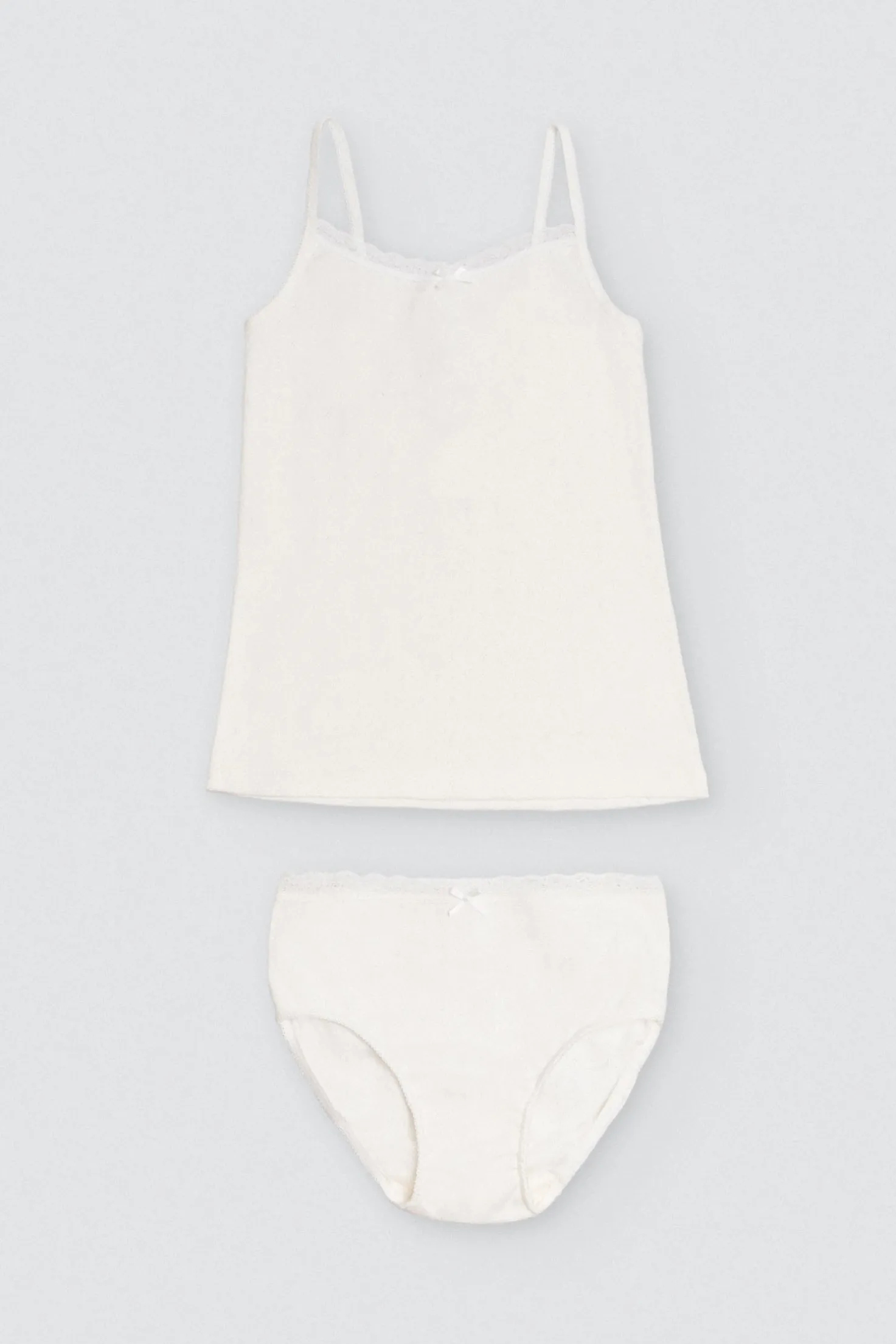 Conjunto infantil de ceremonia compuesto por una camiseta con tirantes finos y una braguita de algodón natural calado .Es un conjunto de vestir para niñas suave, cómodo y elegante. La camiseta tiene una espalda baja y cuenta con un detalle de una blonda de encaje en la parte superior con lazo en el centro. Ideal para eventos. Color marfil o crudo.