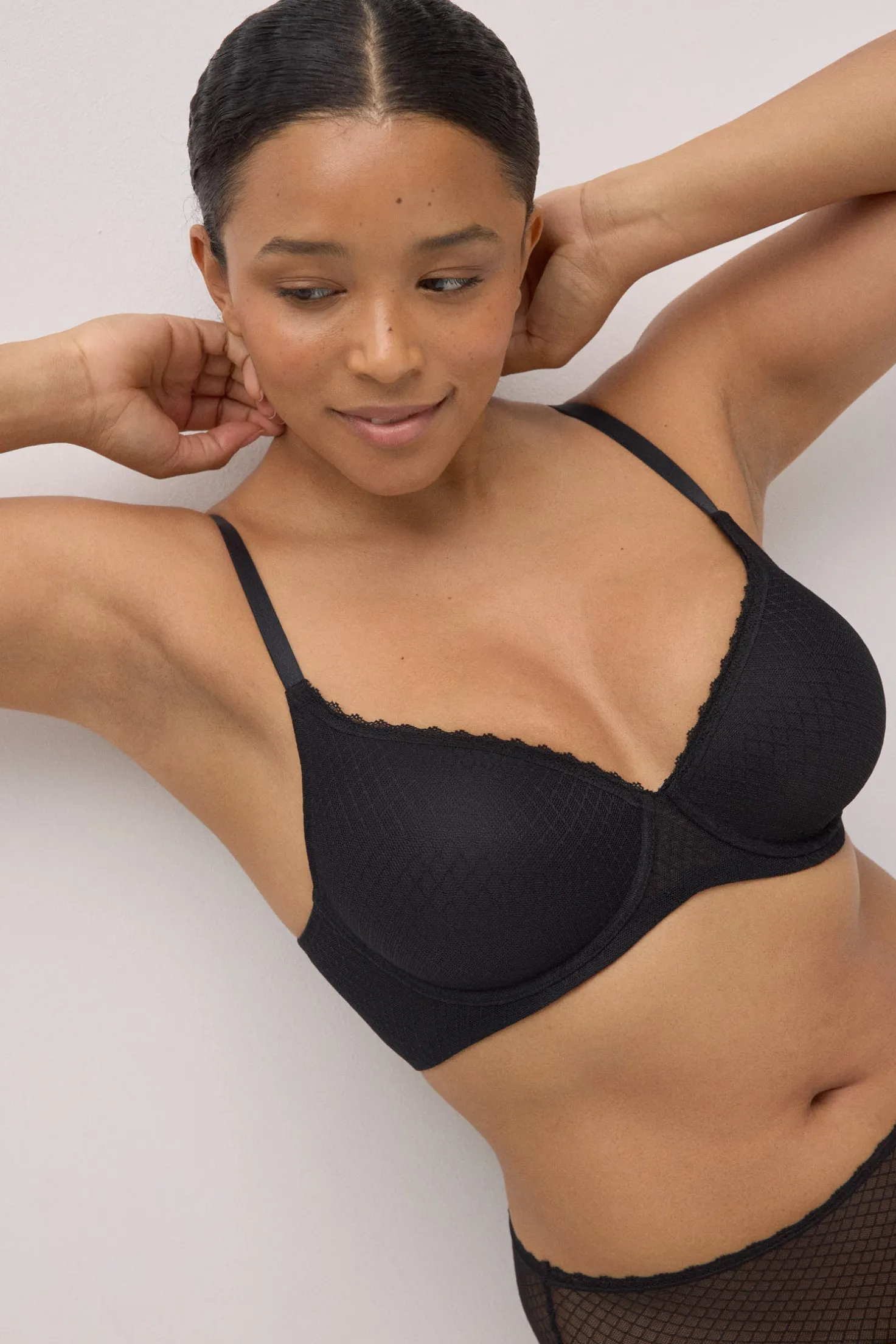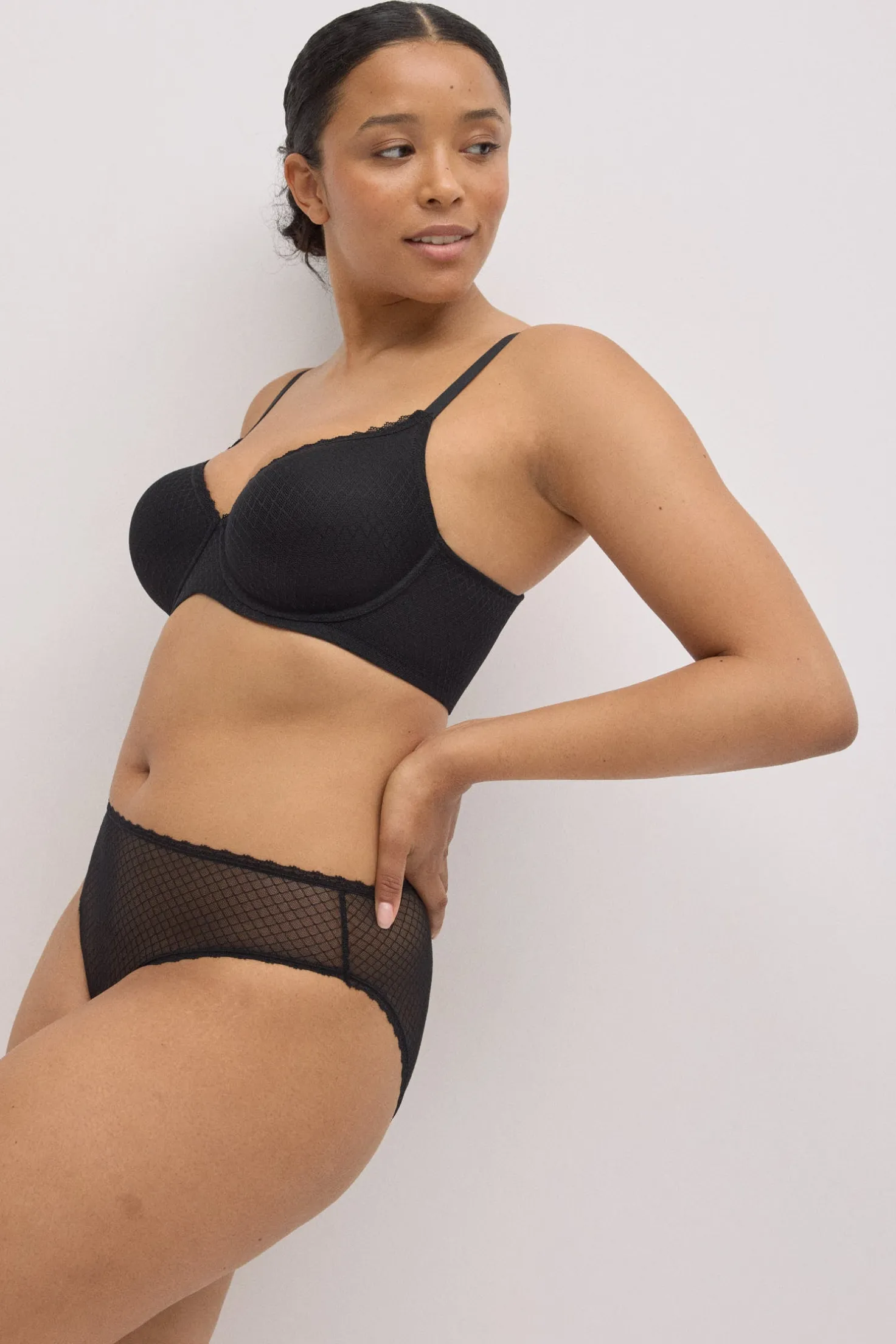 Conjunto de sujetador con aro con relleno y braga midi con transparencias. Sujetador de capacidad en Copa C. Color negro.