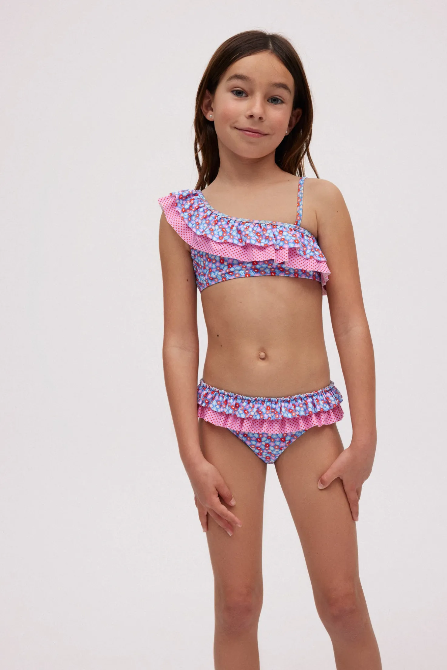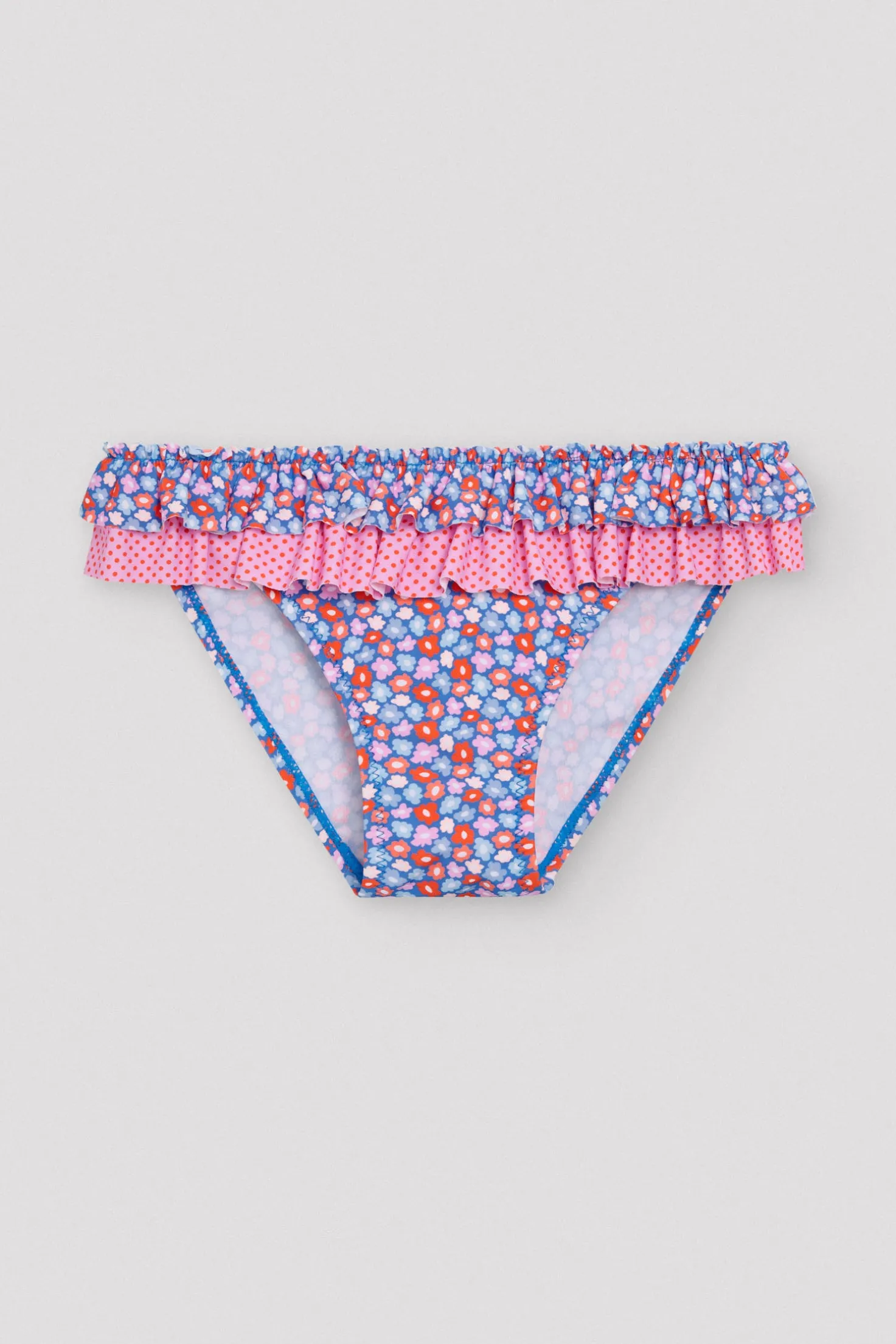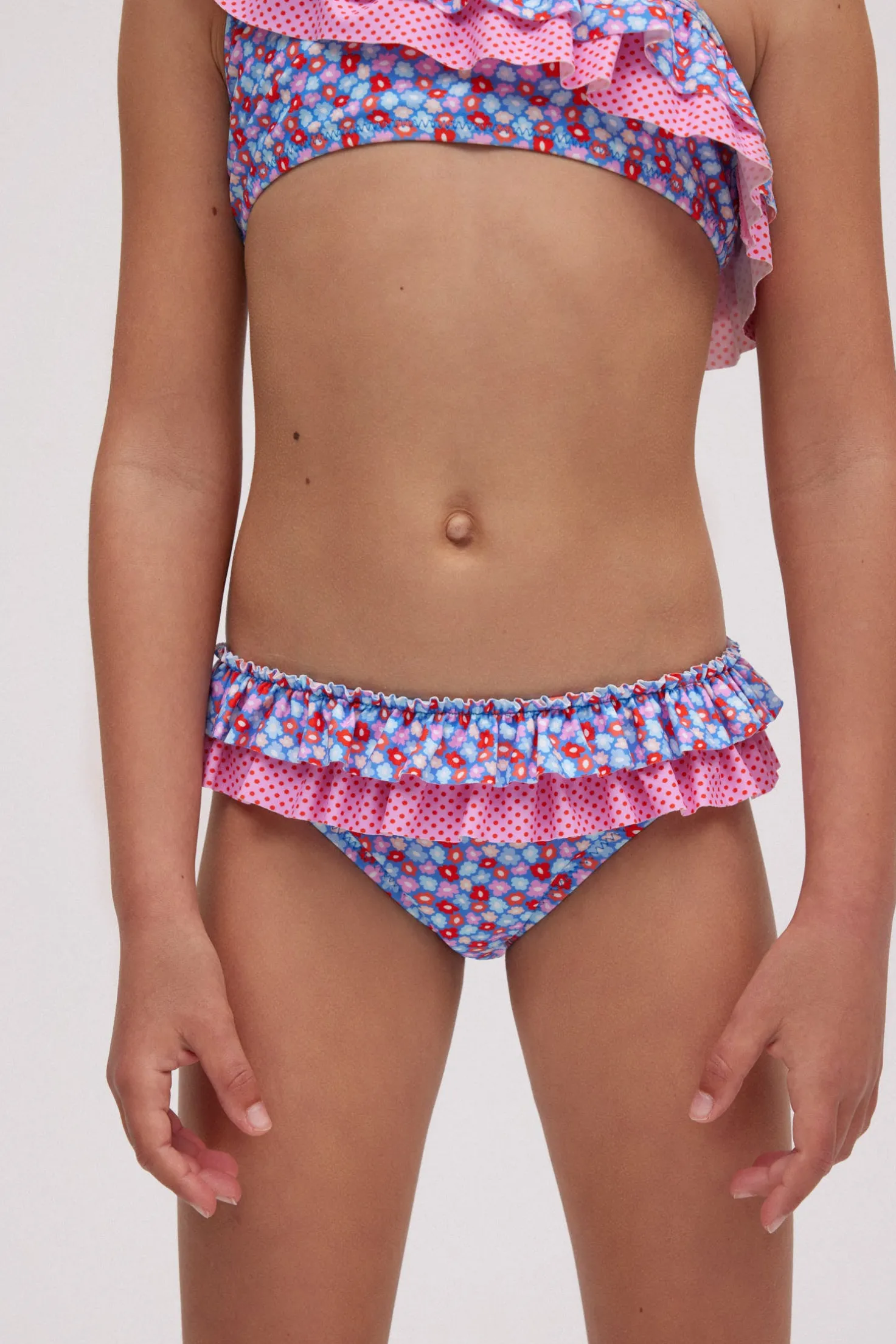 Culetín de tipo braguita para niña con volantes y estampado de flores.