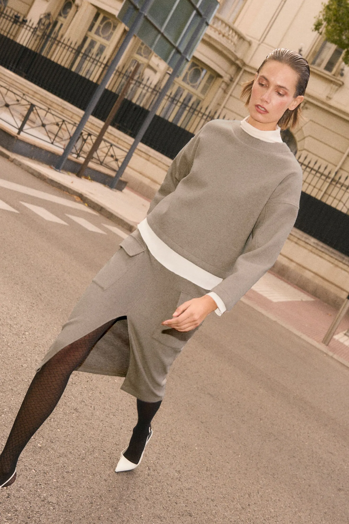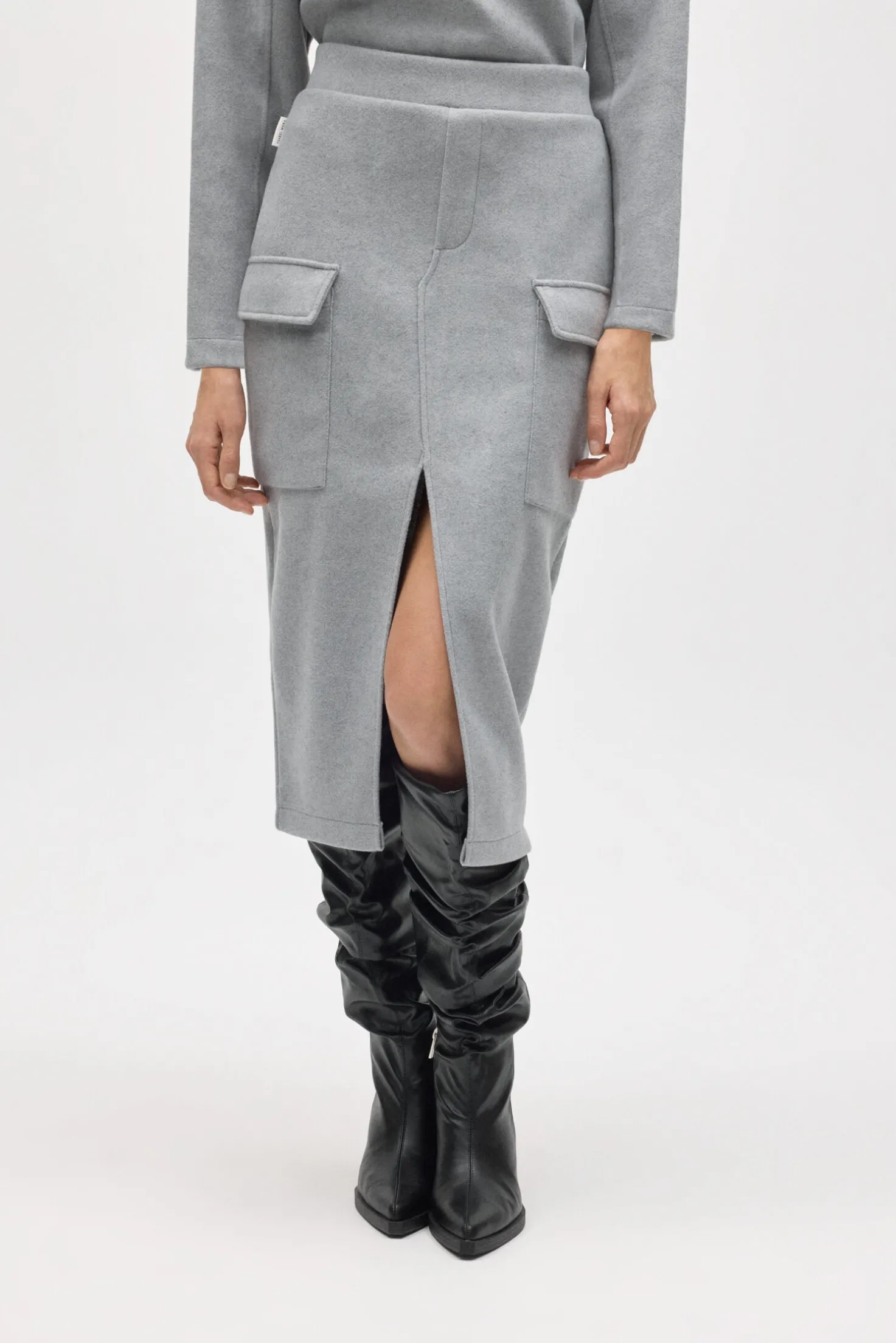 Esta falda combina un diseño elegante con detalles funcionales, perfecta para un look moderno y cómodo. Su corte midi, abertura en el centro y bolsillos laterales le dan un toque de estilo único, mientras que su tejido cálido te mantiene cómoda todo el día. Ideal para completar tu conjunto con el jersey a juego.