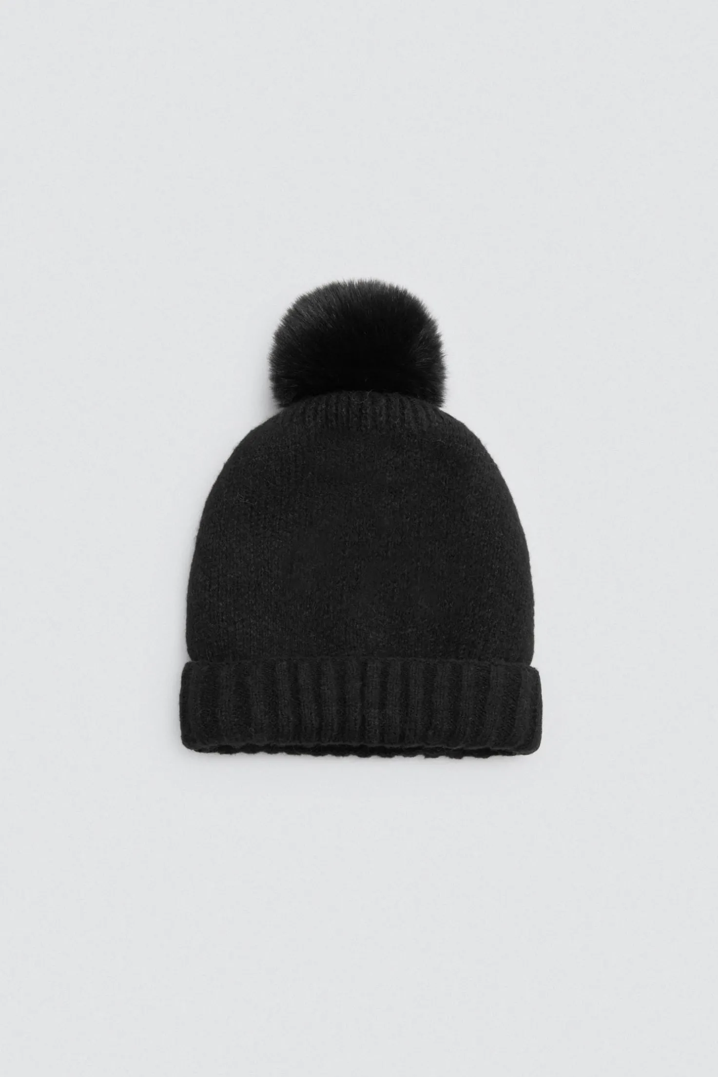 Gorro de punto suave con gran pompón en color negro. Ideal para mantenerte abrigada con un look minimalista y actual.