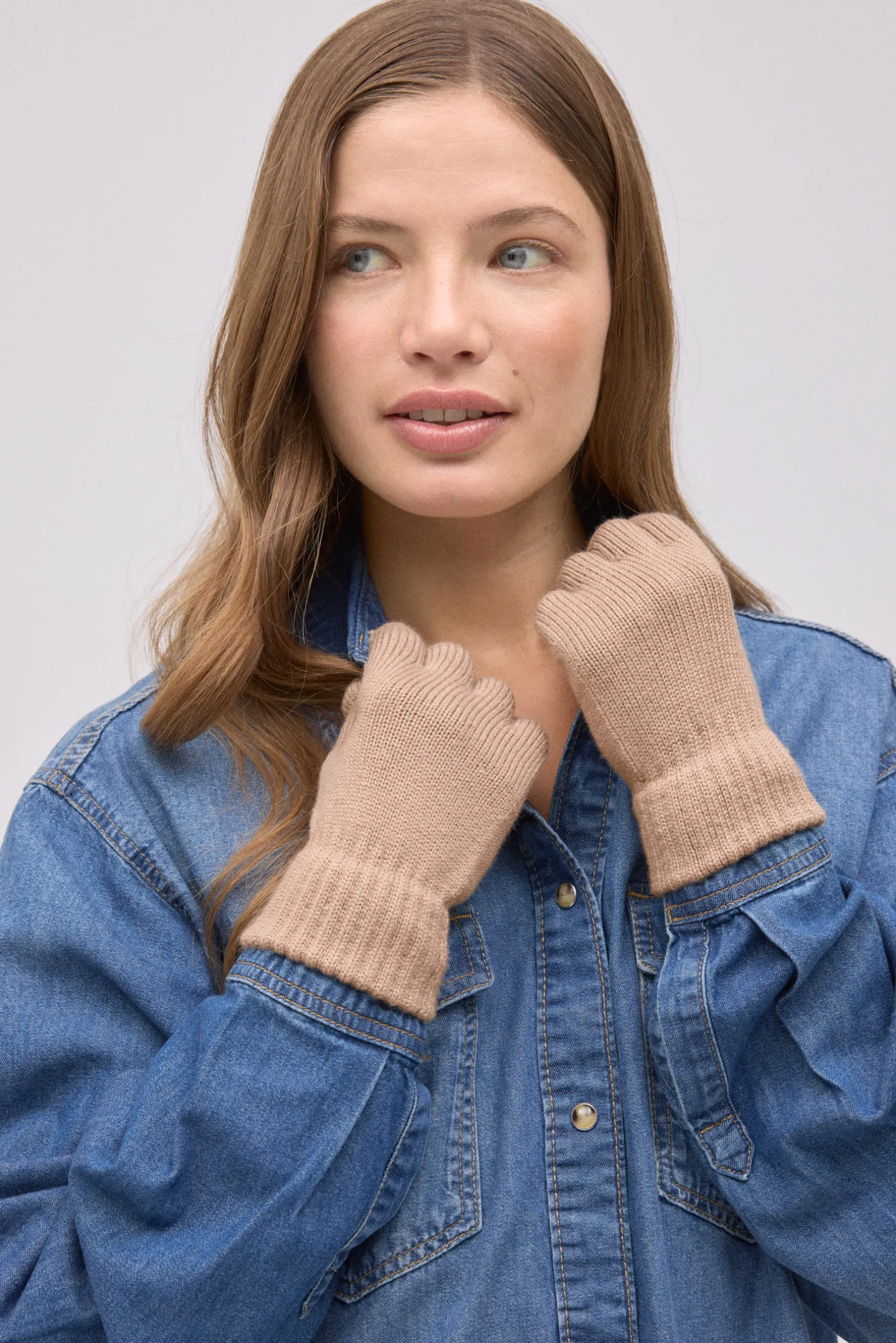 Guantes de punto con tecnología táctil, perfectos para usar el móvil sin pasar frío. Color beige.